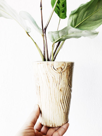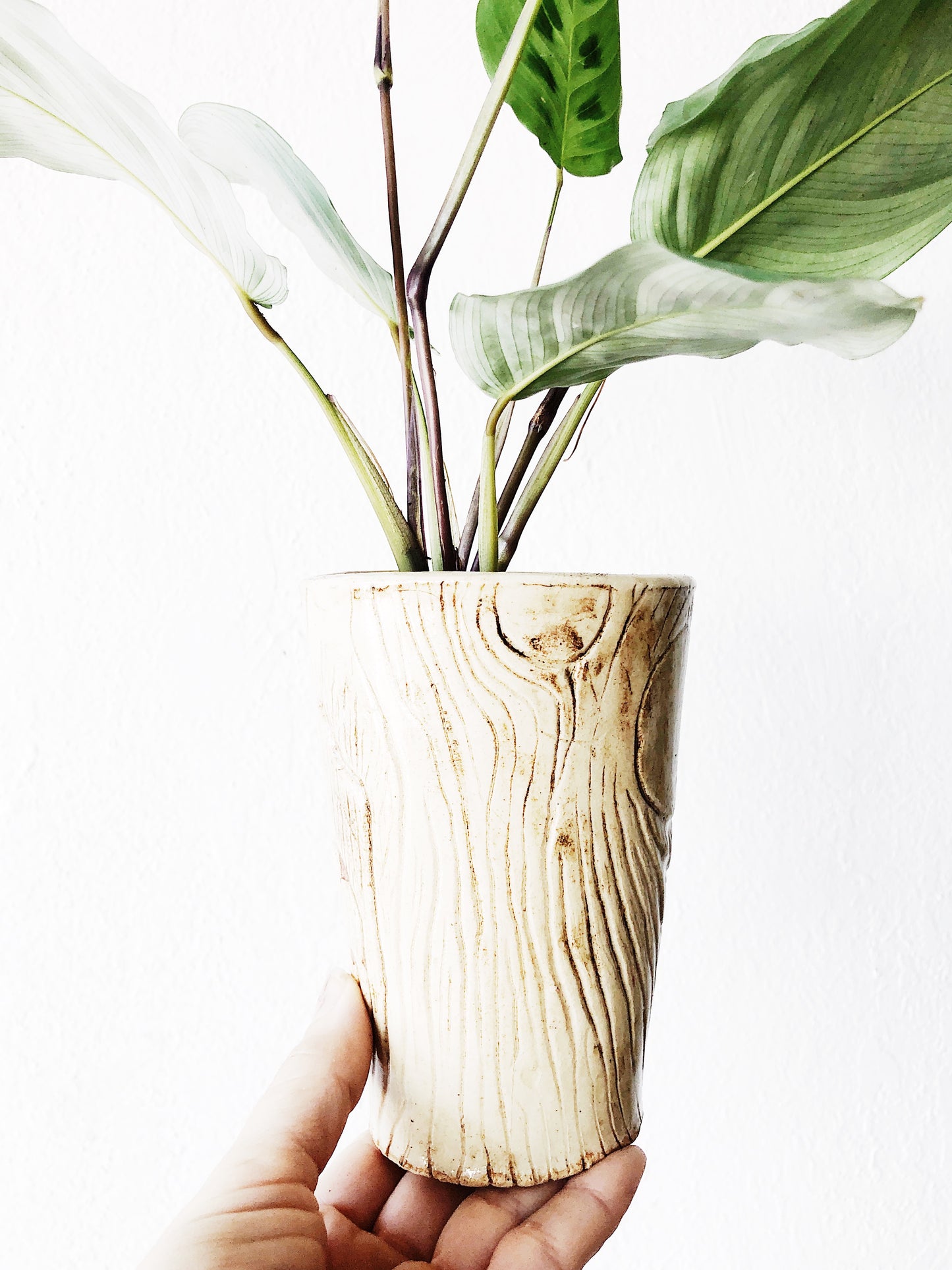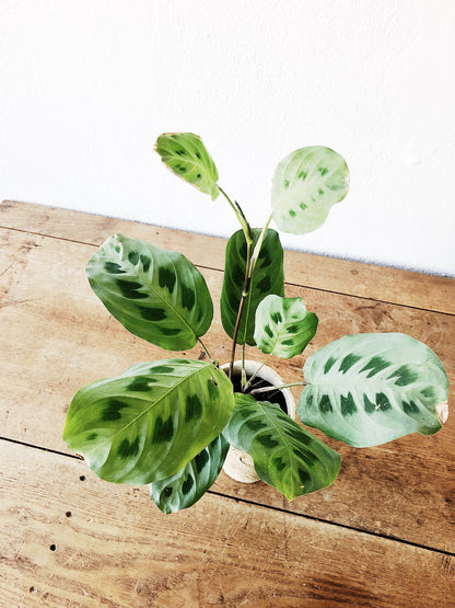 A pretty jade green Maranta or prayer plant potted up in a vintage faux bois ceramic vessel. Has drainage.