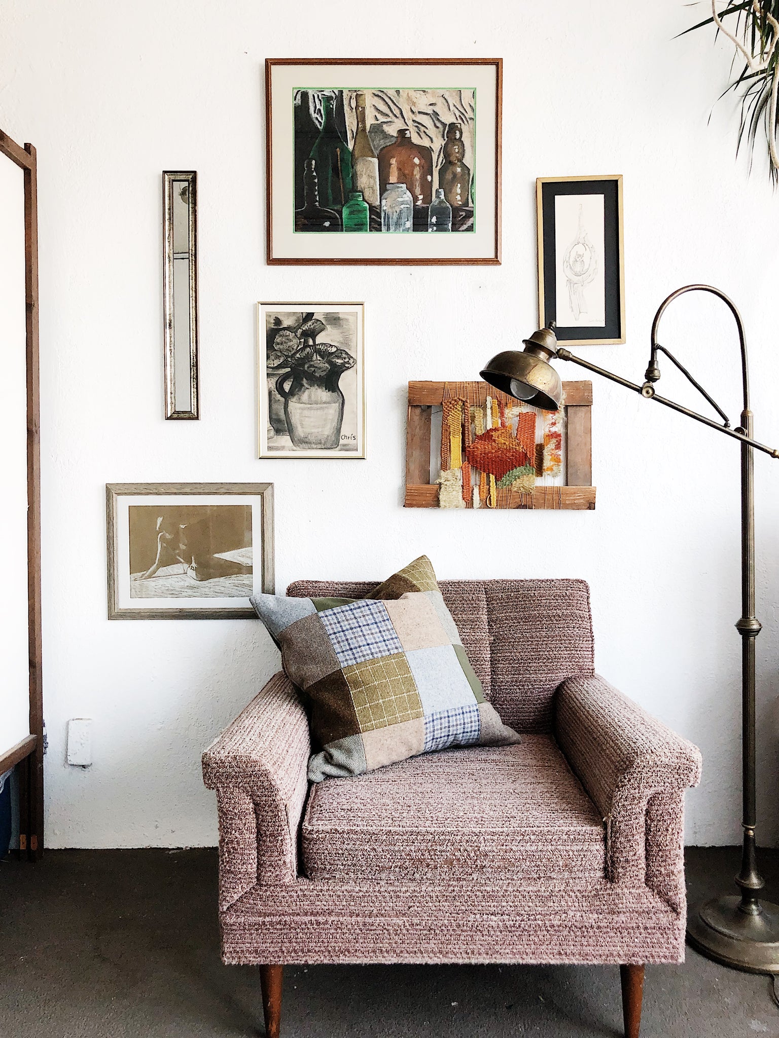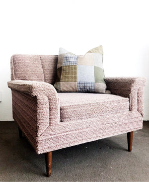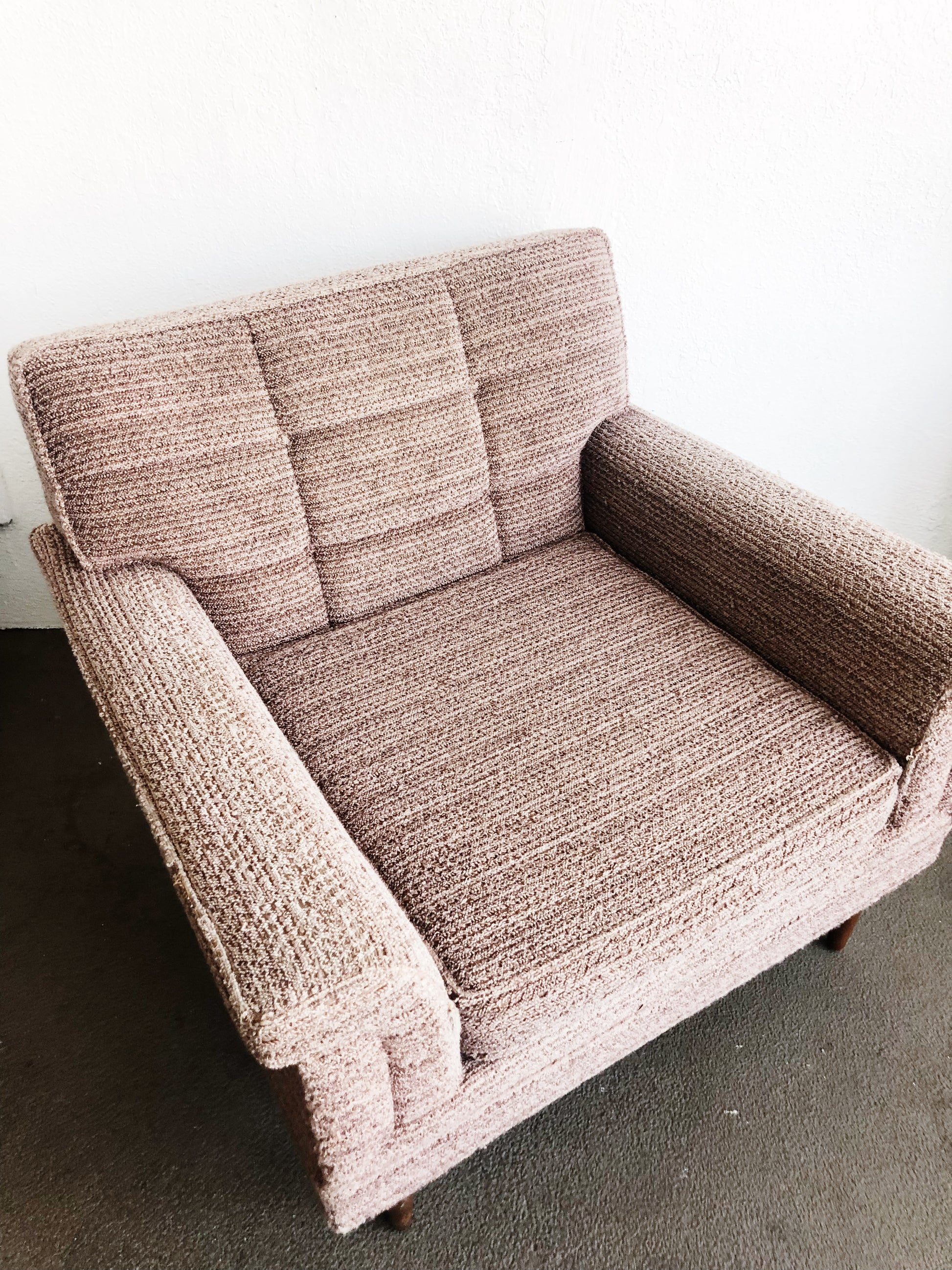 Fantastic classic mid century / 1960s chair in a nice tapered boxy shape. Color is a medium muddy lavender. Fabric is nubby wool blend. Tapered wood legs