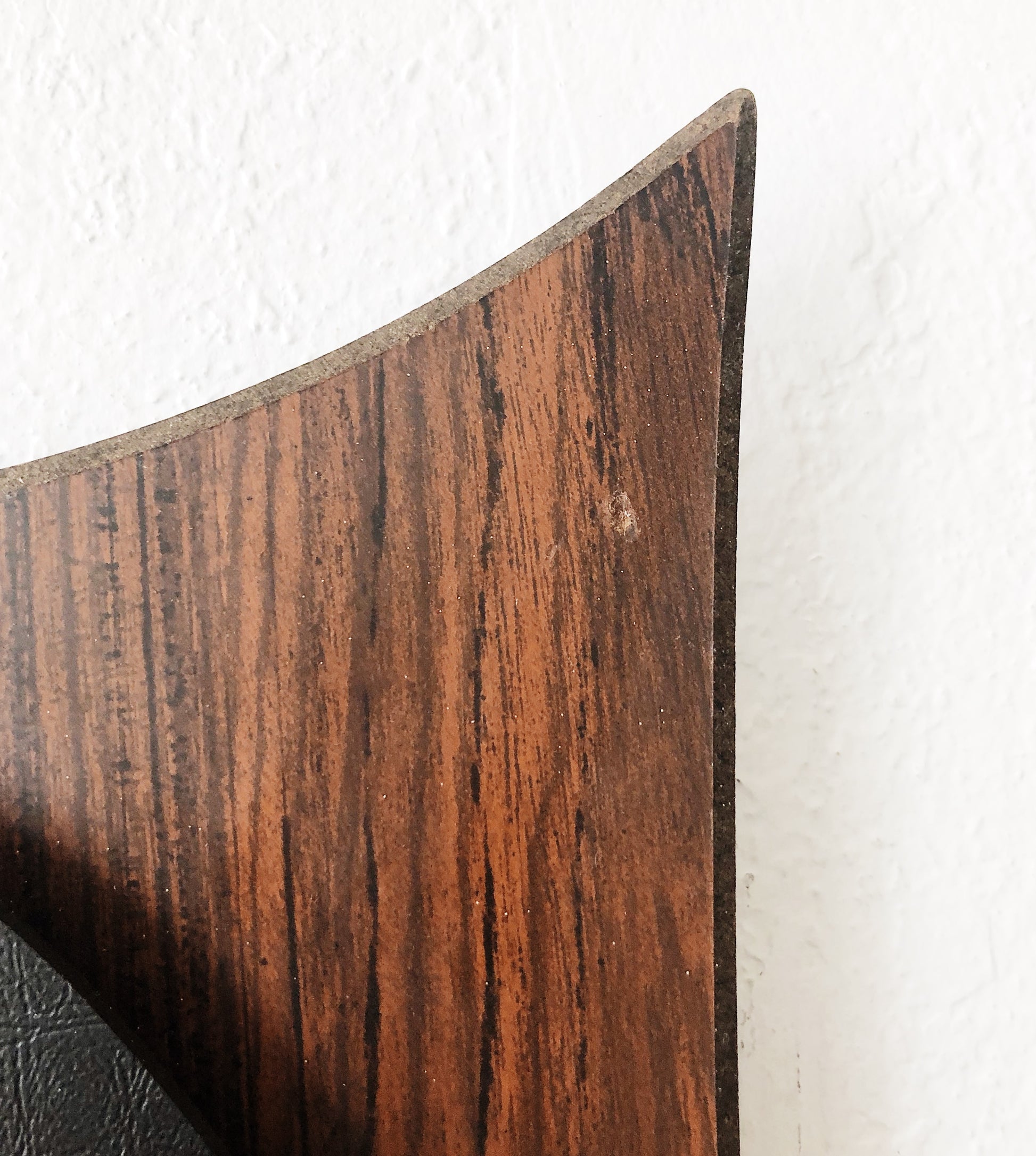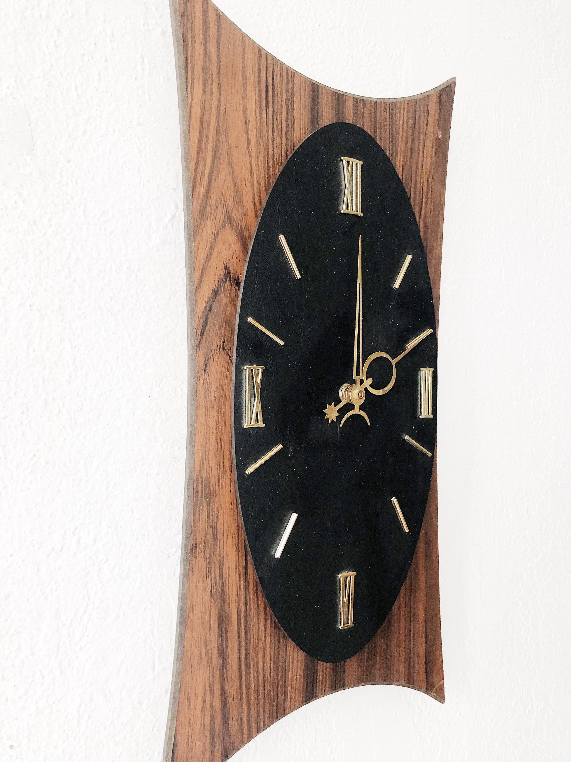 Nicely appointed mid century wall clock. Faux bois wood with vinyl face plate and those snazzy brass arms. Runs on one D battery