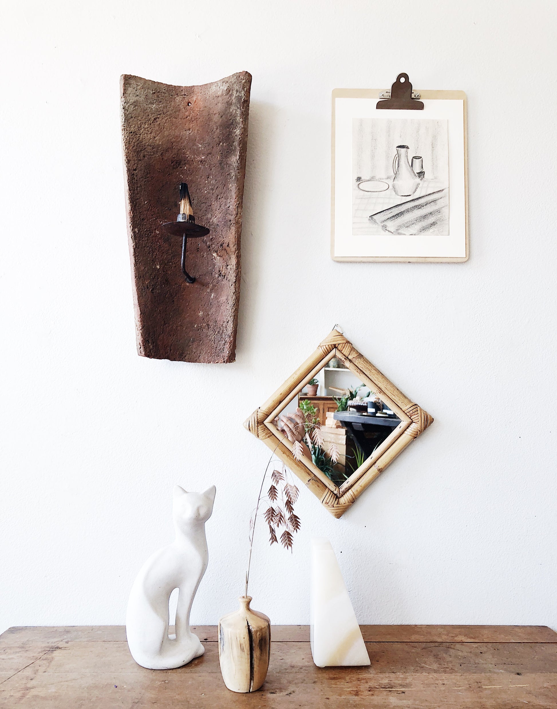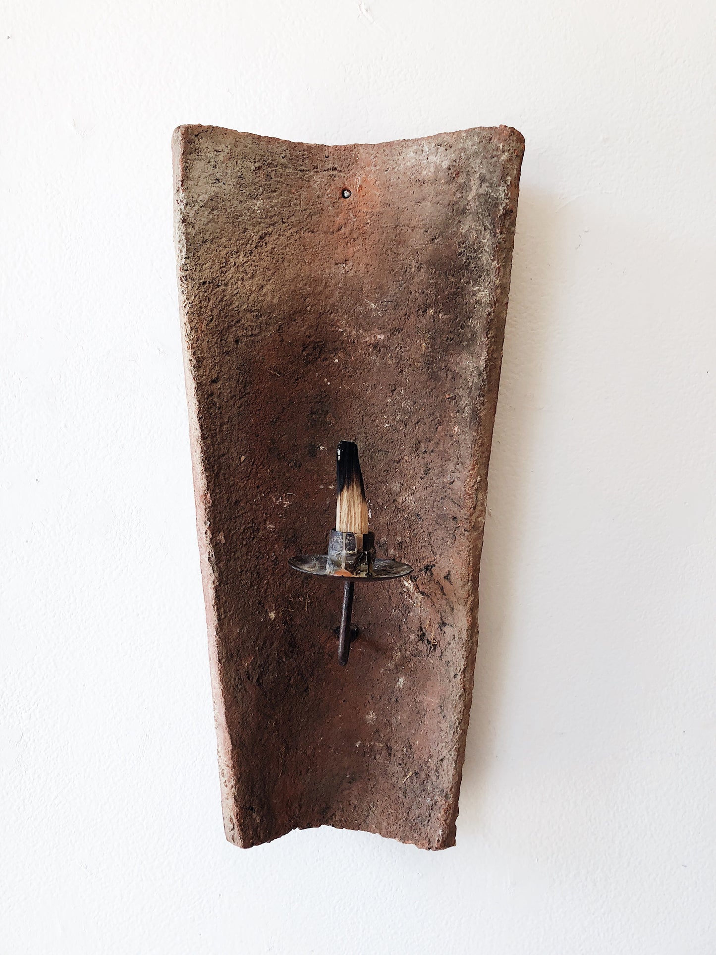 Mexican Terra cotta roof tile fashioned into a candle sconce. We love using these to burn palo santo or incense. Great for outdoor garden spaces.