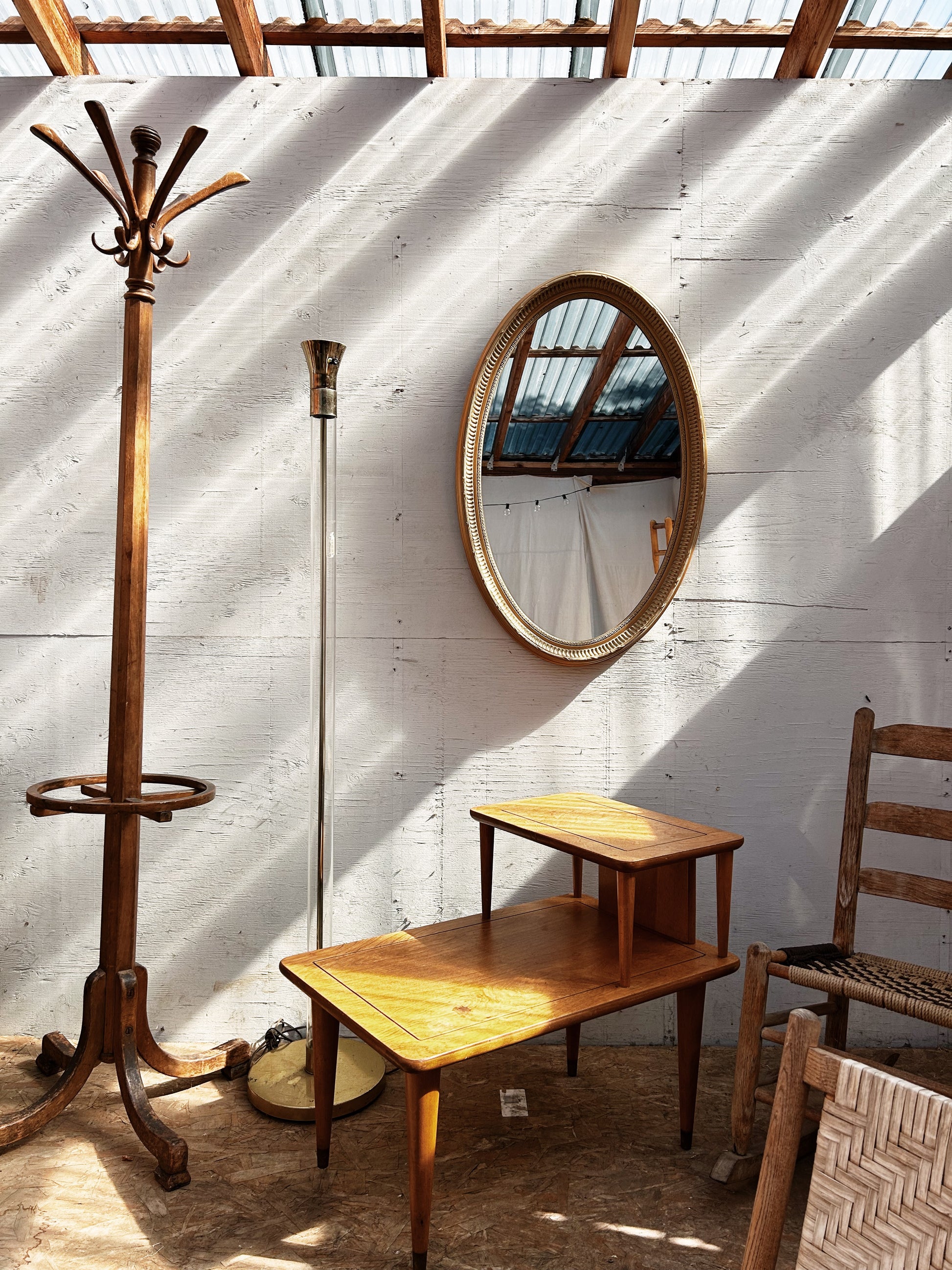 Nice mid century stepped wood table. It’s structurally solid as a rock and beautiful tone to the wood, priced accordingly to cosmetic markings to the top.