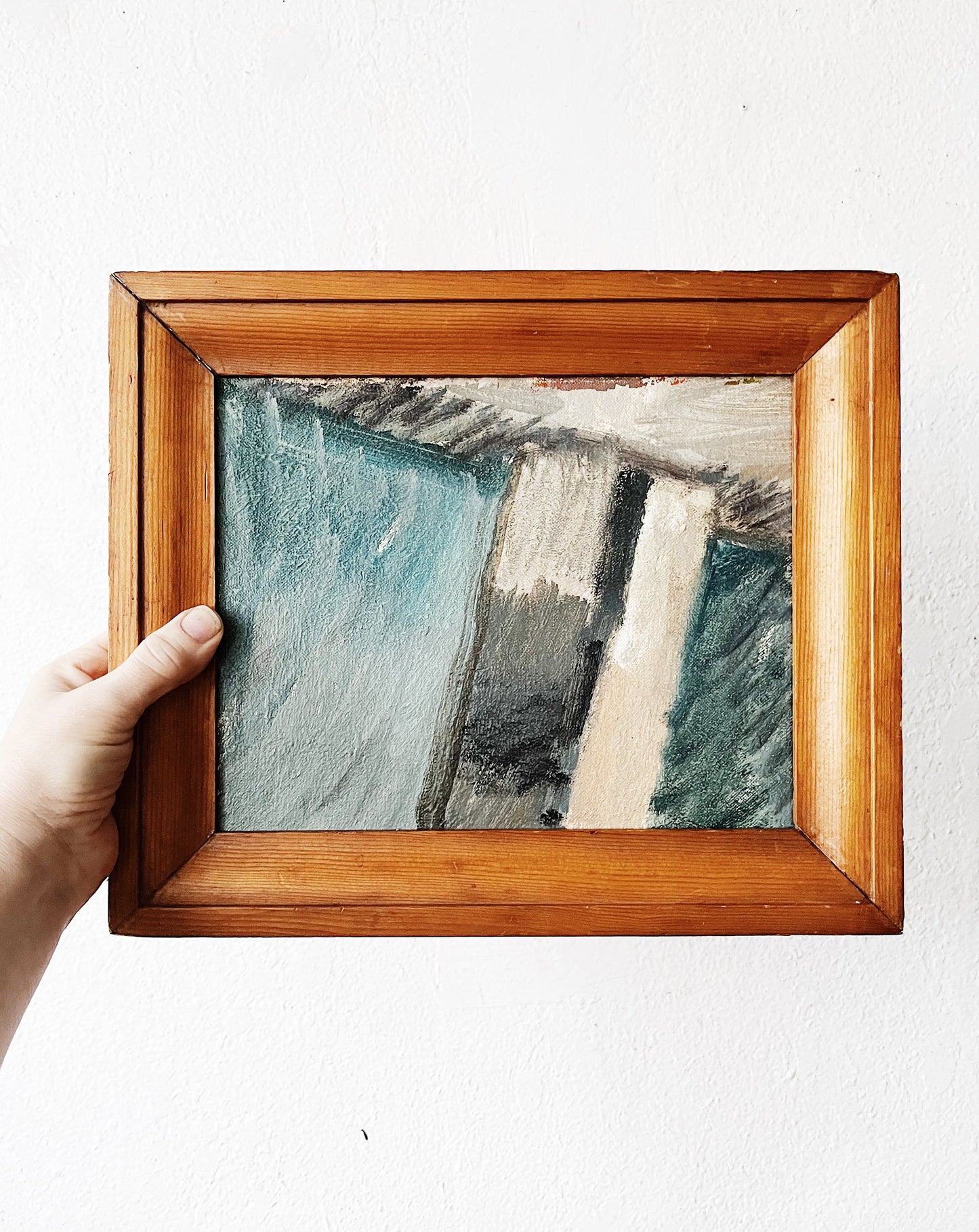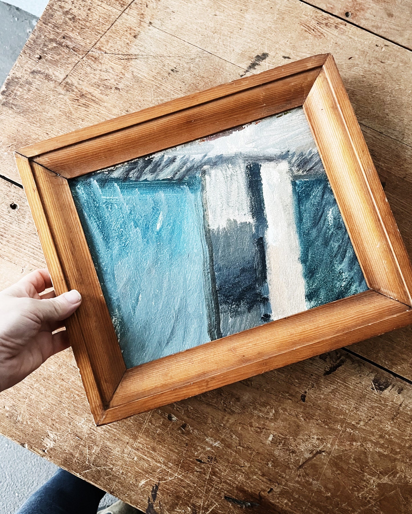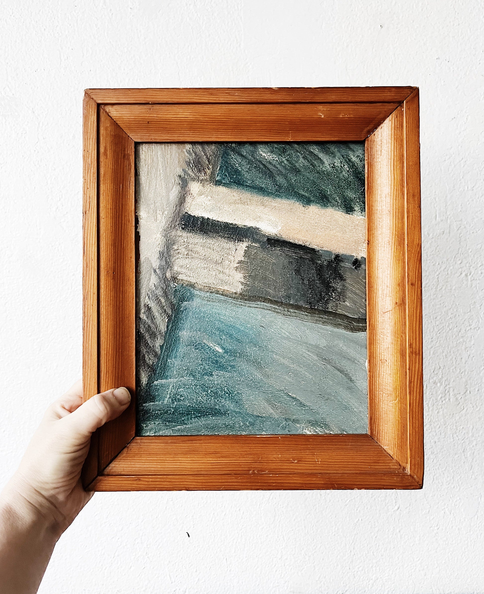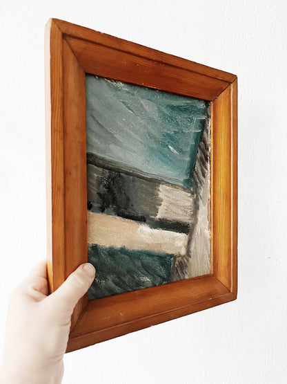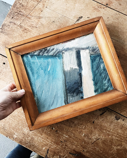 Abstract oil on canvas board. Beautiful blues and blushes. Framed nicely in old wood.