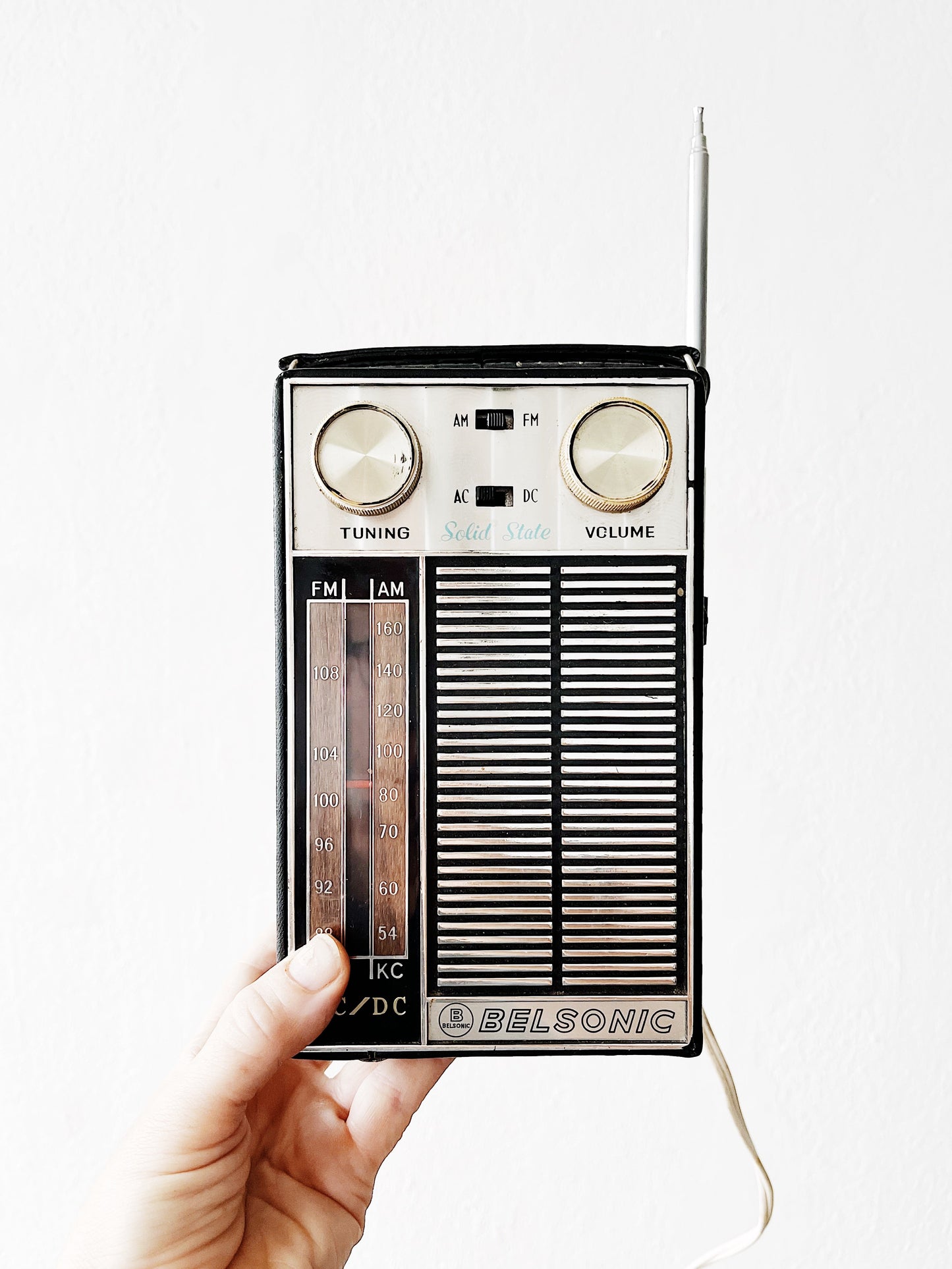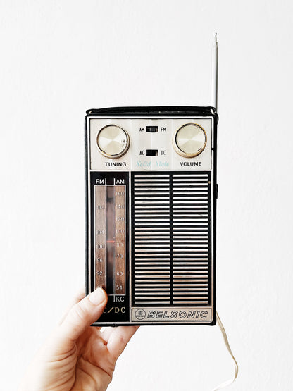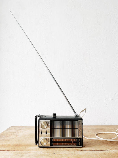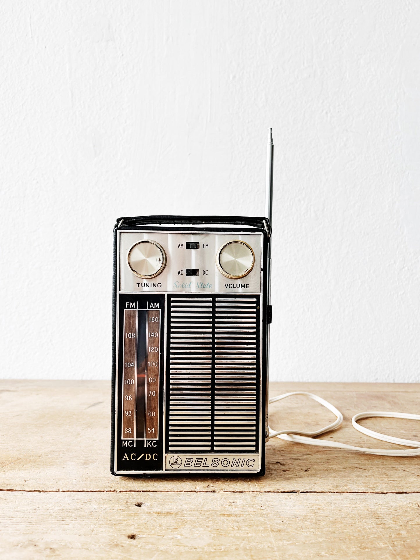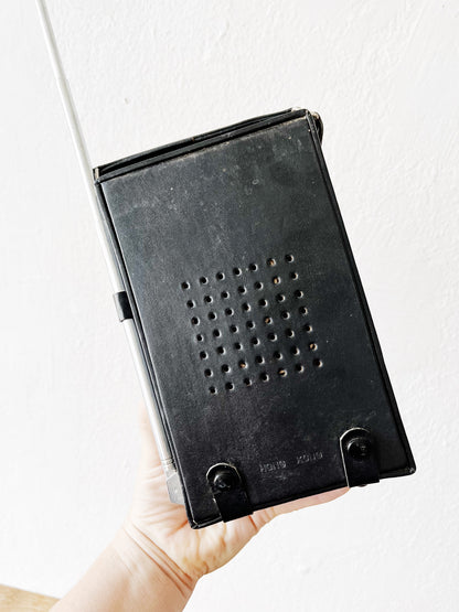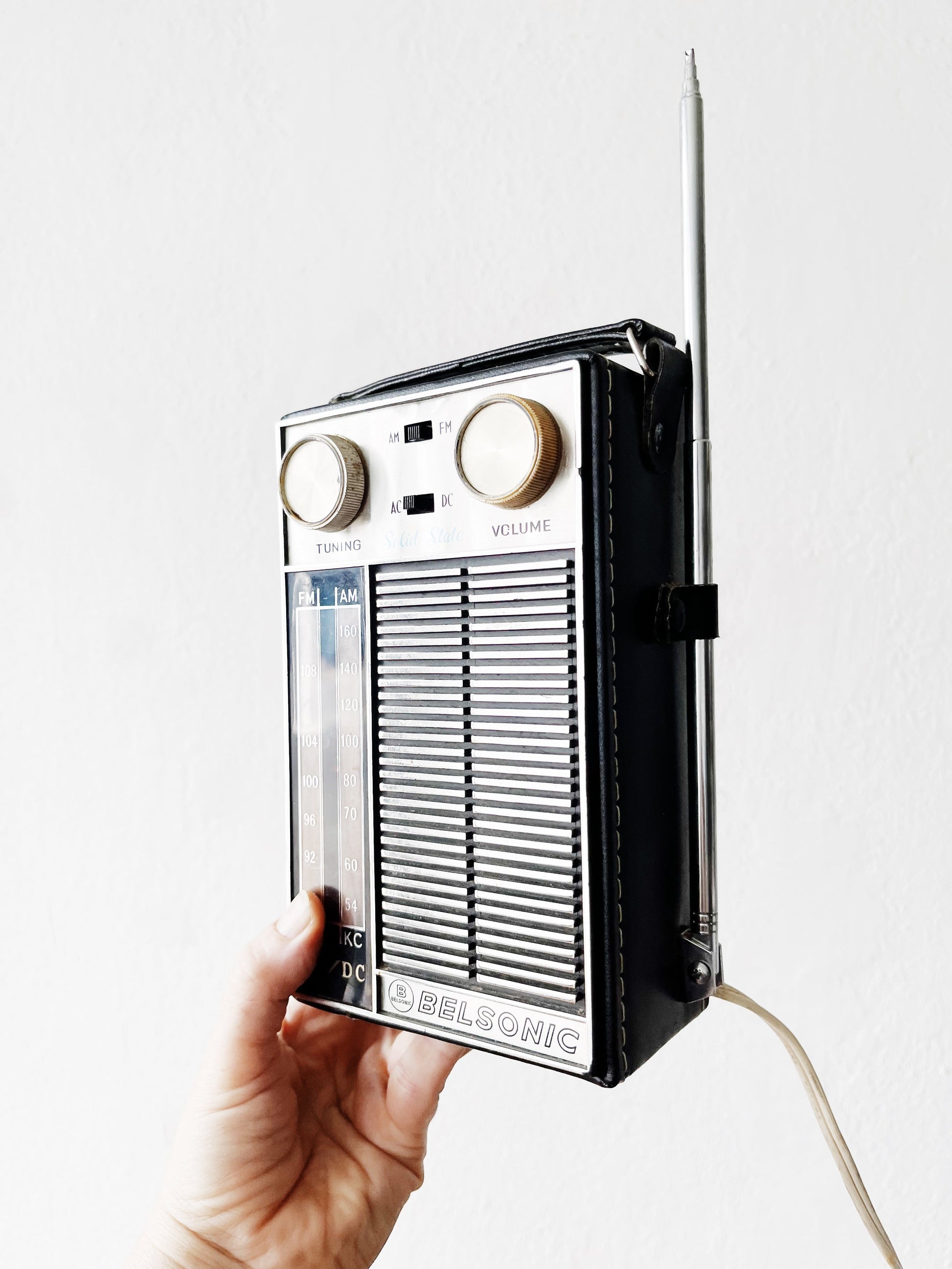 1950s portable am/fm radio With leather case and dual power. A nice one in good condition. Great for picnics or taking to the river. Some patina to the metal parts but nothing that detracts