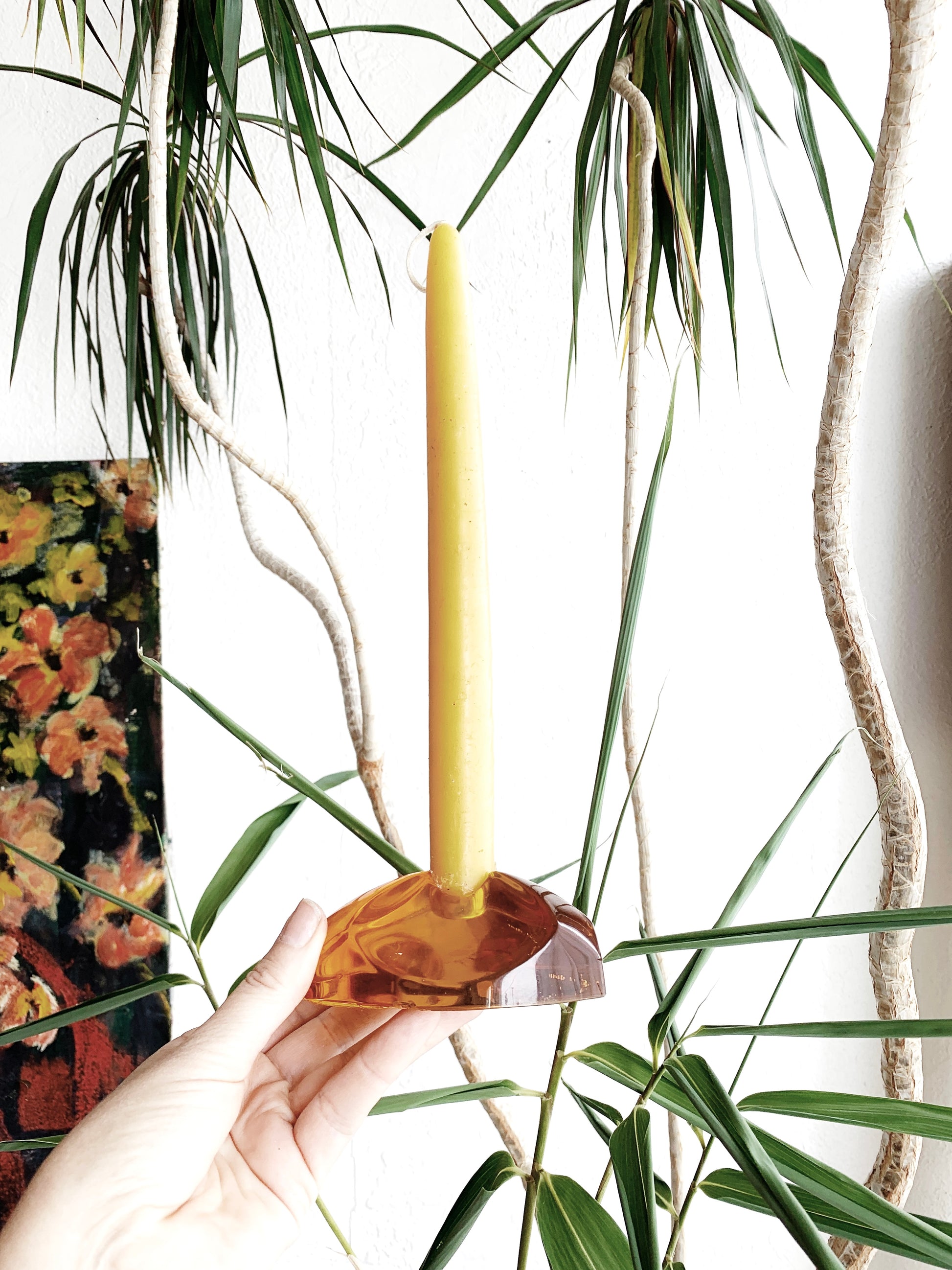 Pretty mid century amber resin candle holders. They hold standard tapers. 4” ea