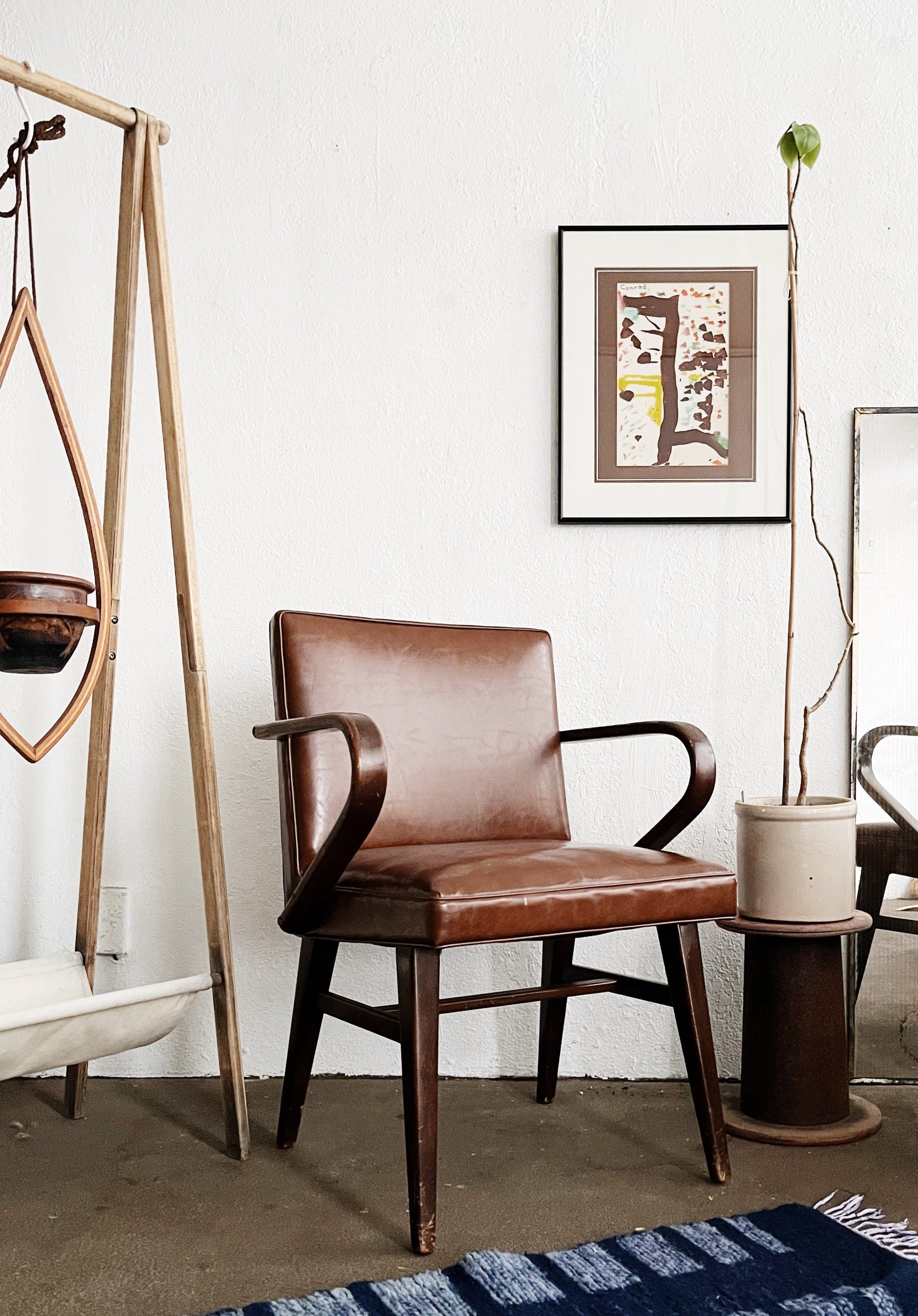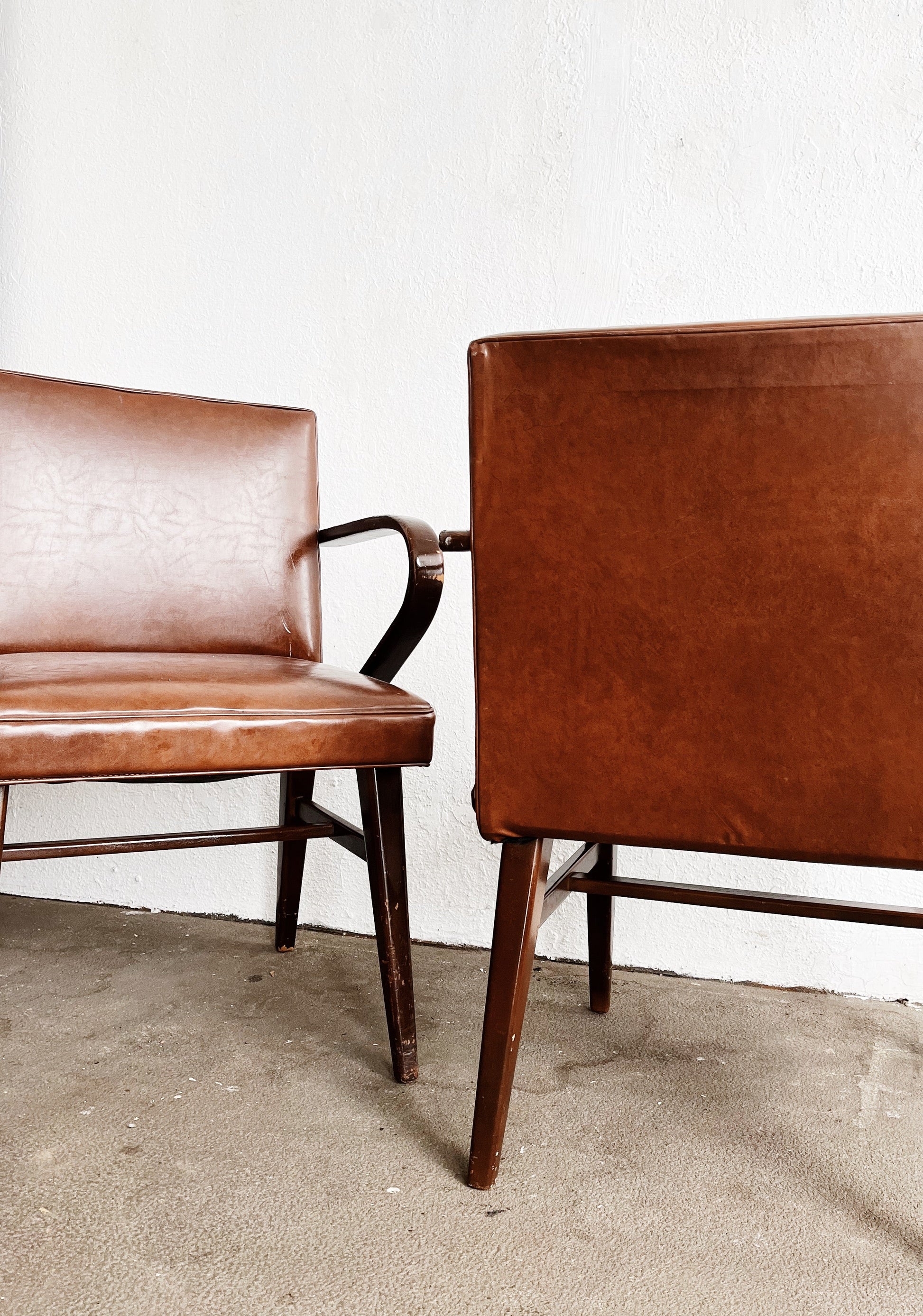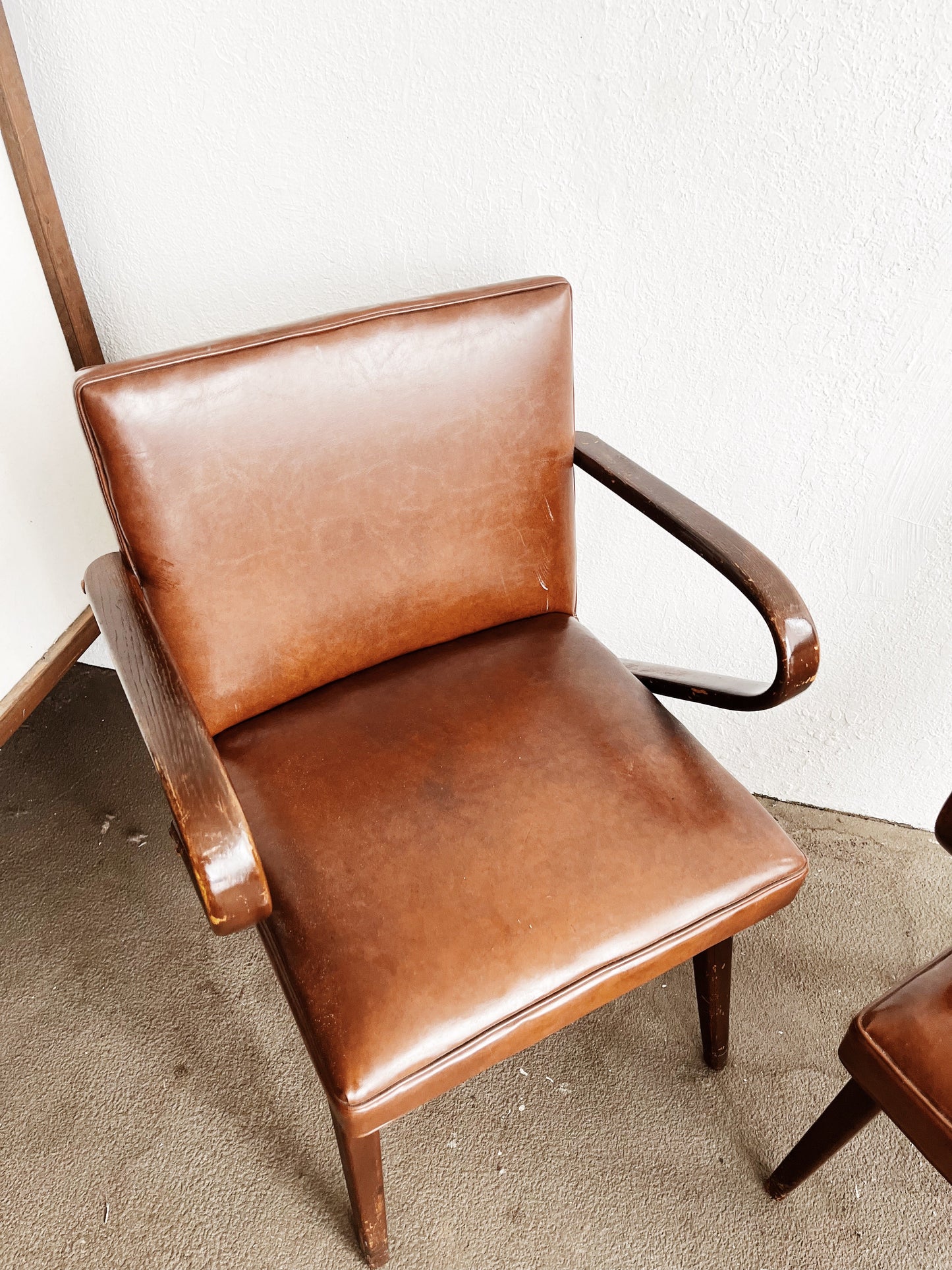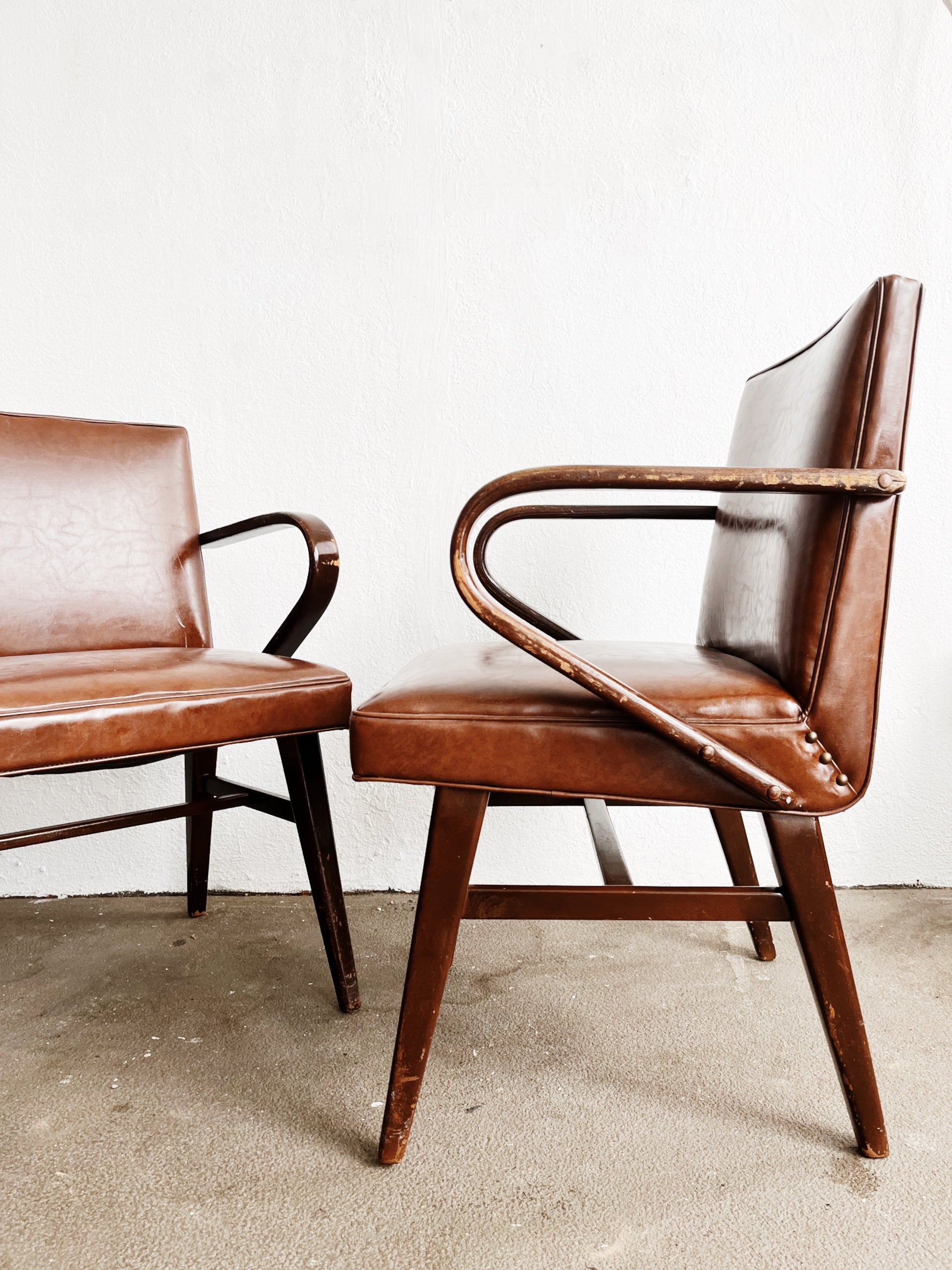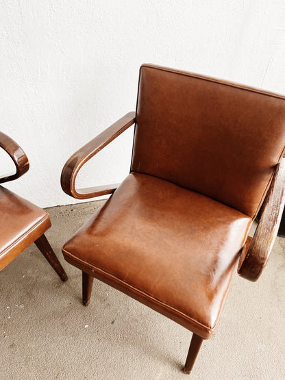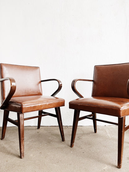 A pair of stunning bent arm chairs firm the mid century. In the style of Jens Risom and channeling 1930s French design. Walnut framework with Naugahyde upholstery. A comfortable upright and sturdy sit makes for nice dining chairs. The upholstery is in wonderful condition with just a couple of very minor scuffs, but no rips or tears. Springs are firm. Age to wood is commensurate with age and could be overstained if you desired.