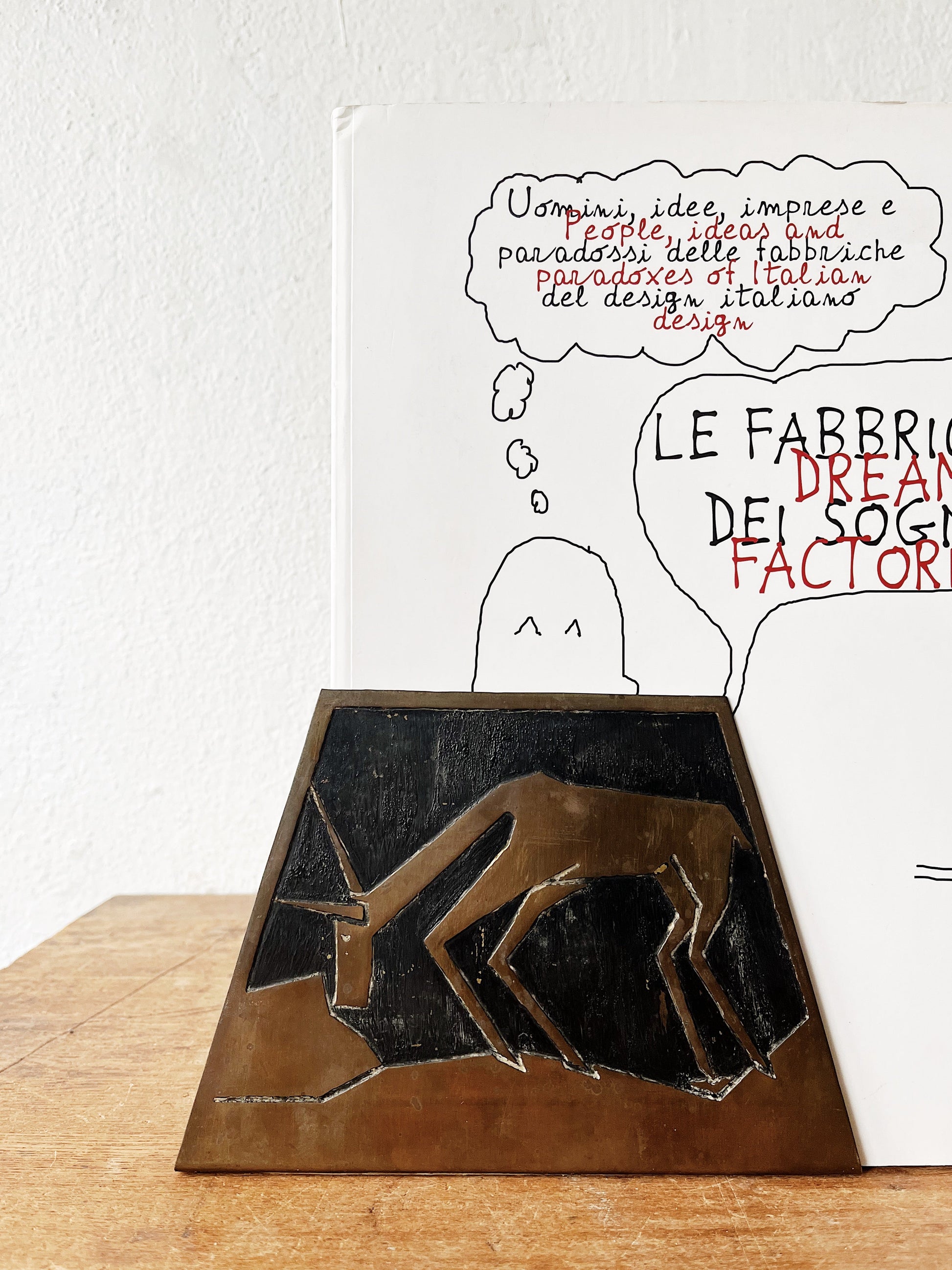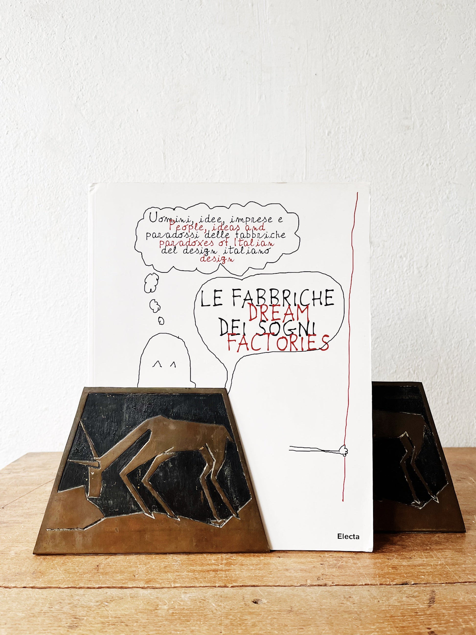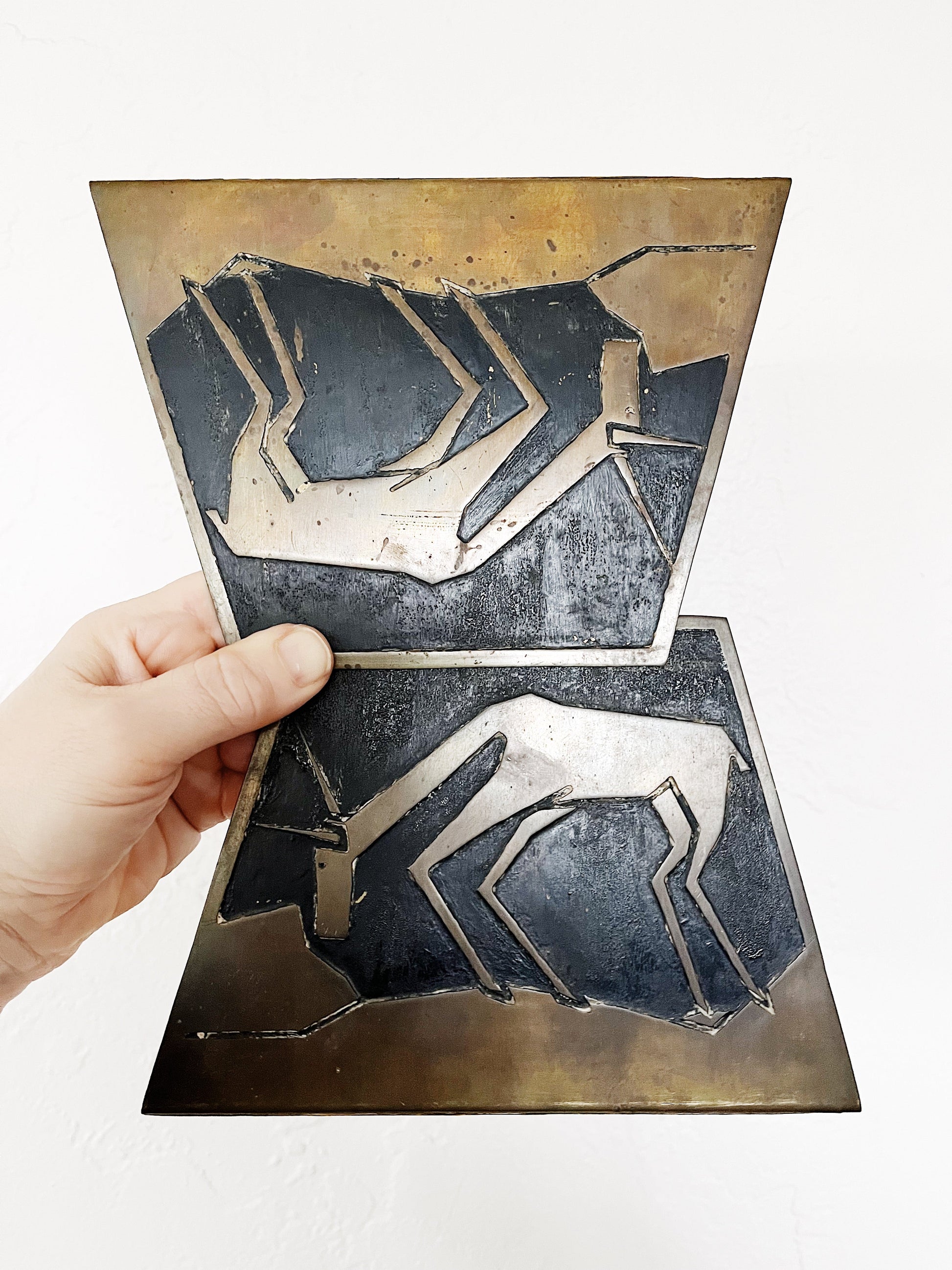 Brass plated and enamel book ends. Vaguely brutalist in style. Can be used to hold albums as well