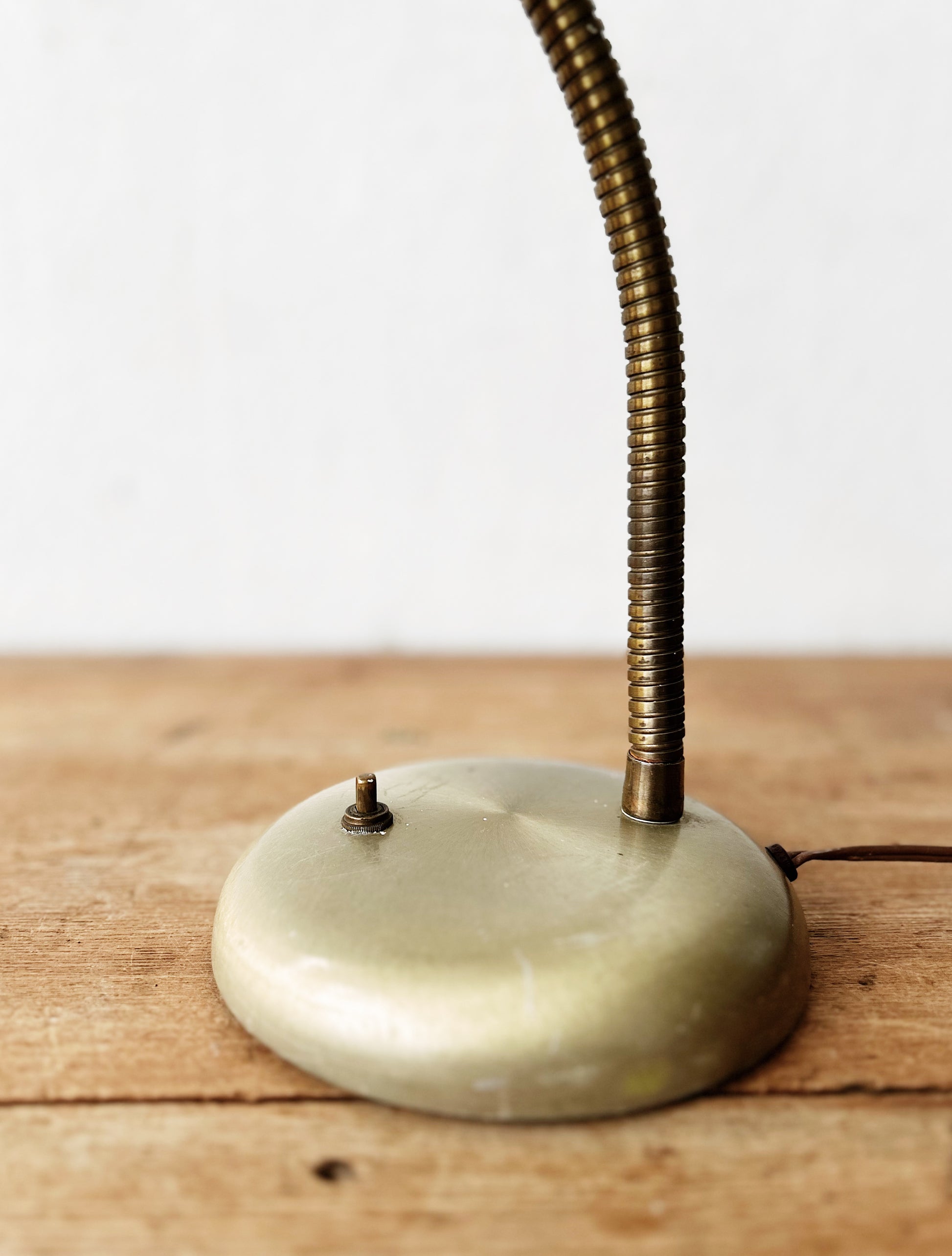 Fab mid century bullet desk lamp. Brushed dull finish somewhere between pewter and gold. Gooseneck is nice and tight. Weighted base with push button. Sumple and elegant. Age appropriate surface wear. Works great!