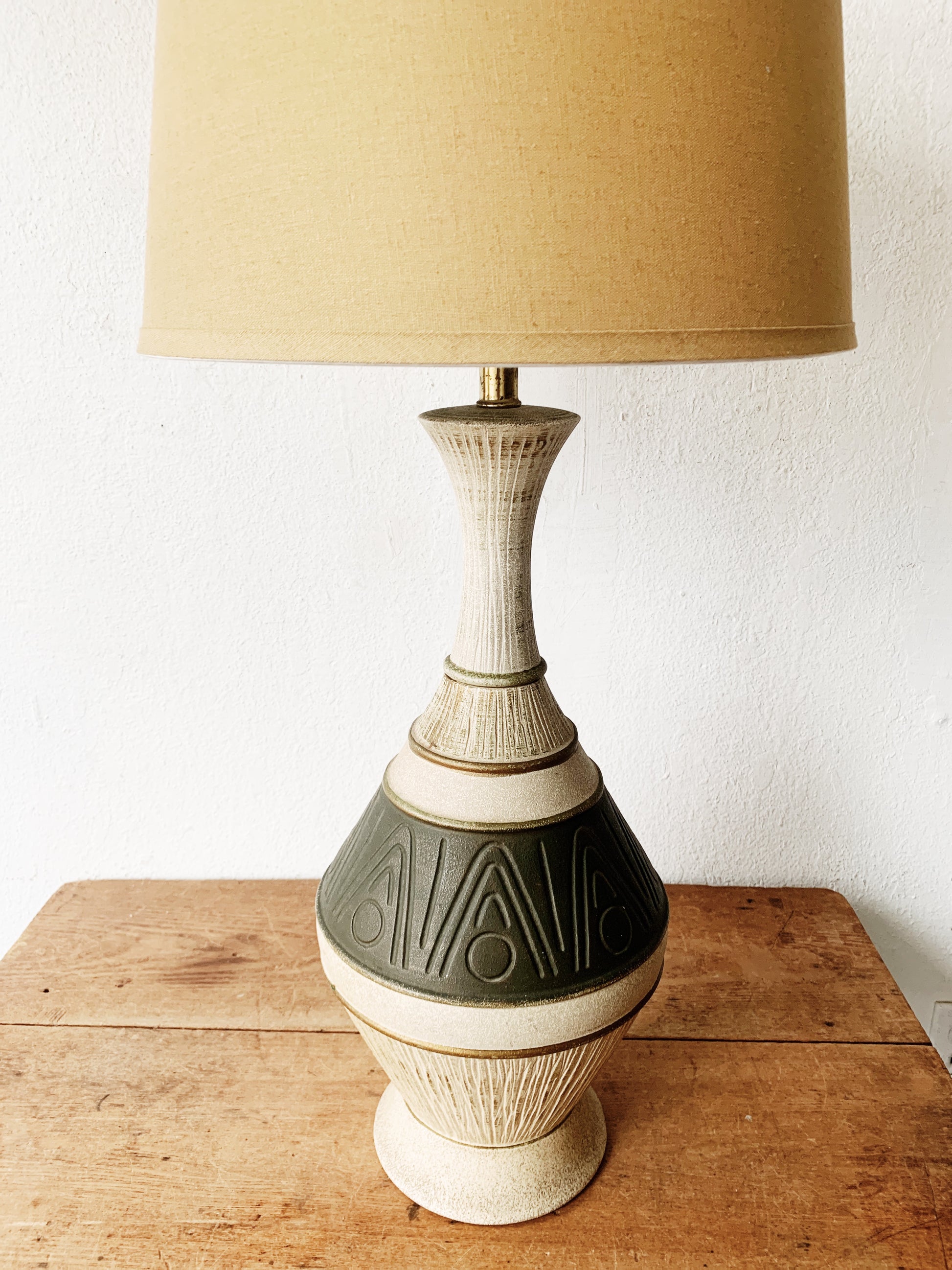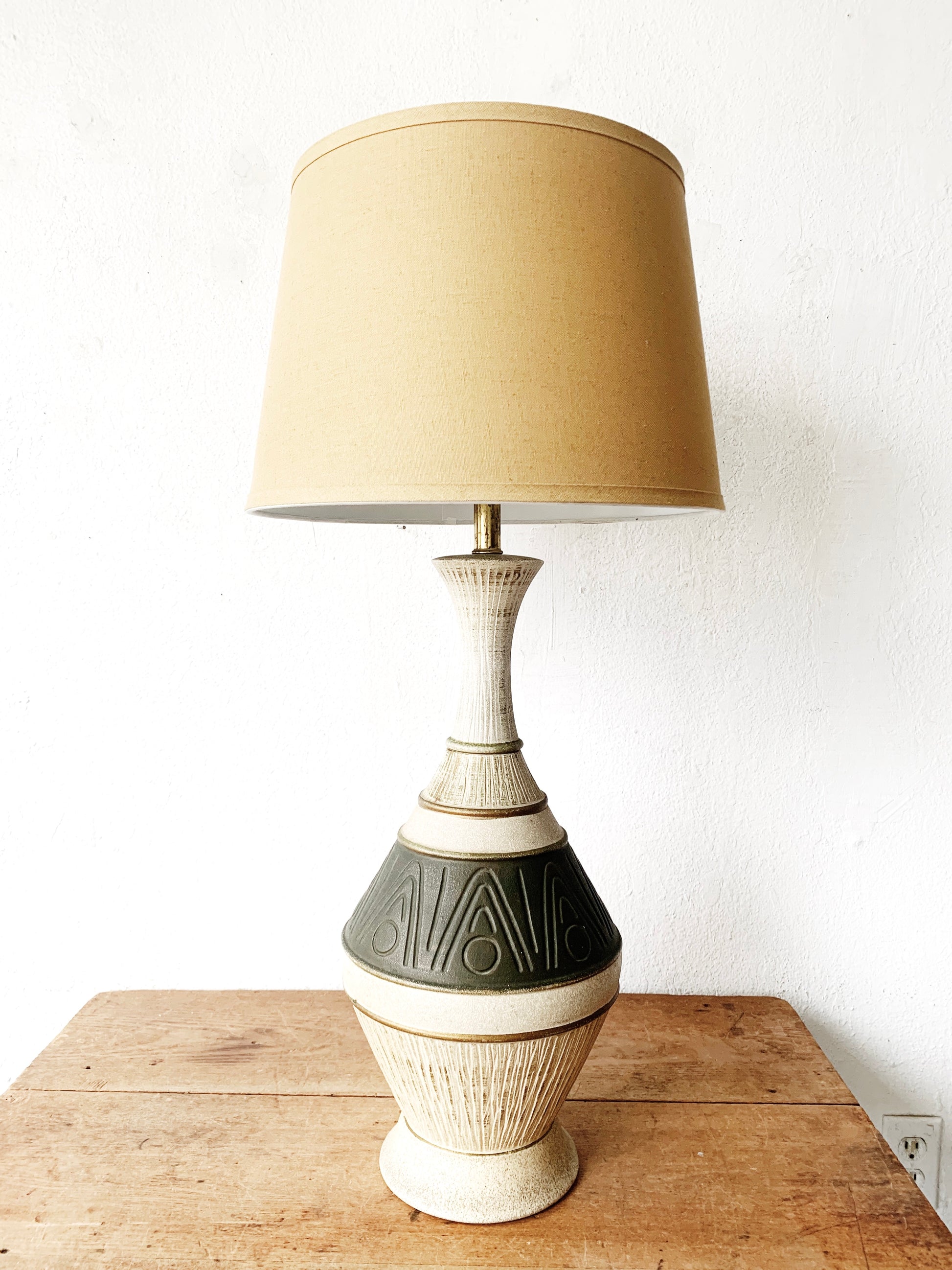 Gorgeous large ceramic lamp from the mid century. Comes with the golden brown linen shade. We love that design/pattern and colors on this beauty