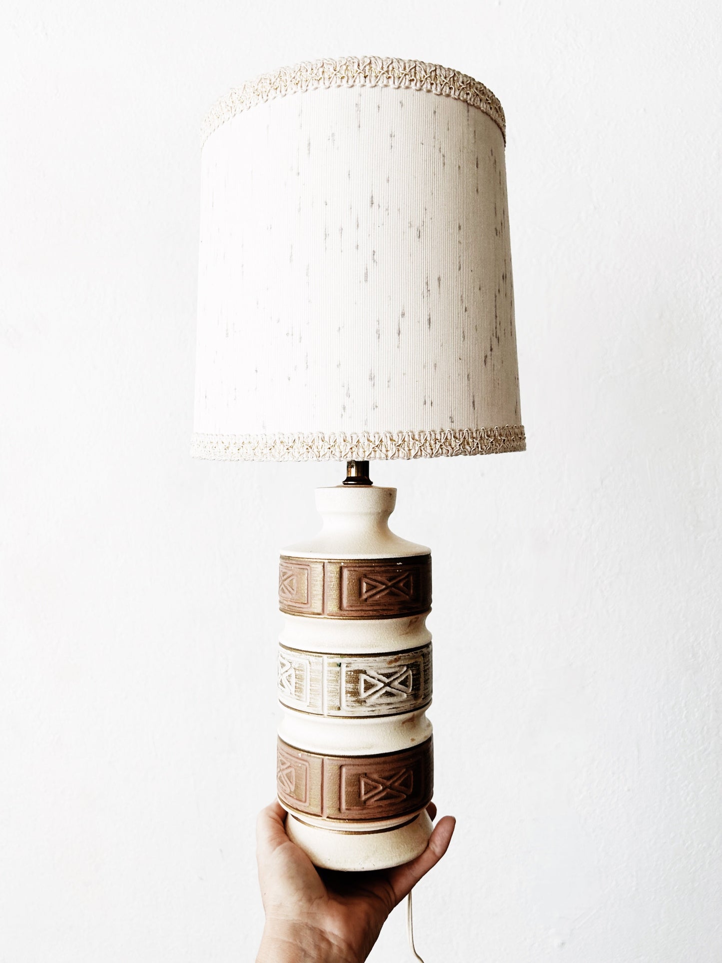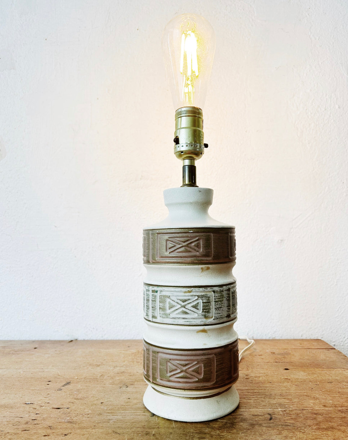 Petite hand painted mid century table lamp with geometric patterning. In great condition.