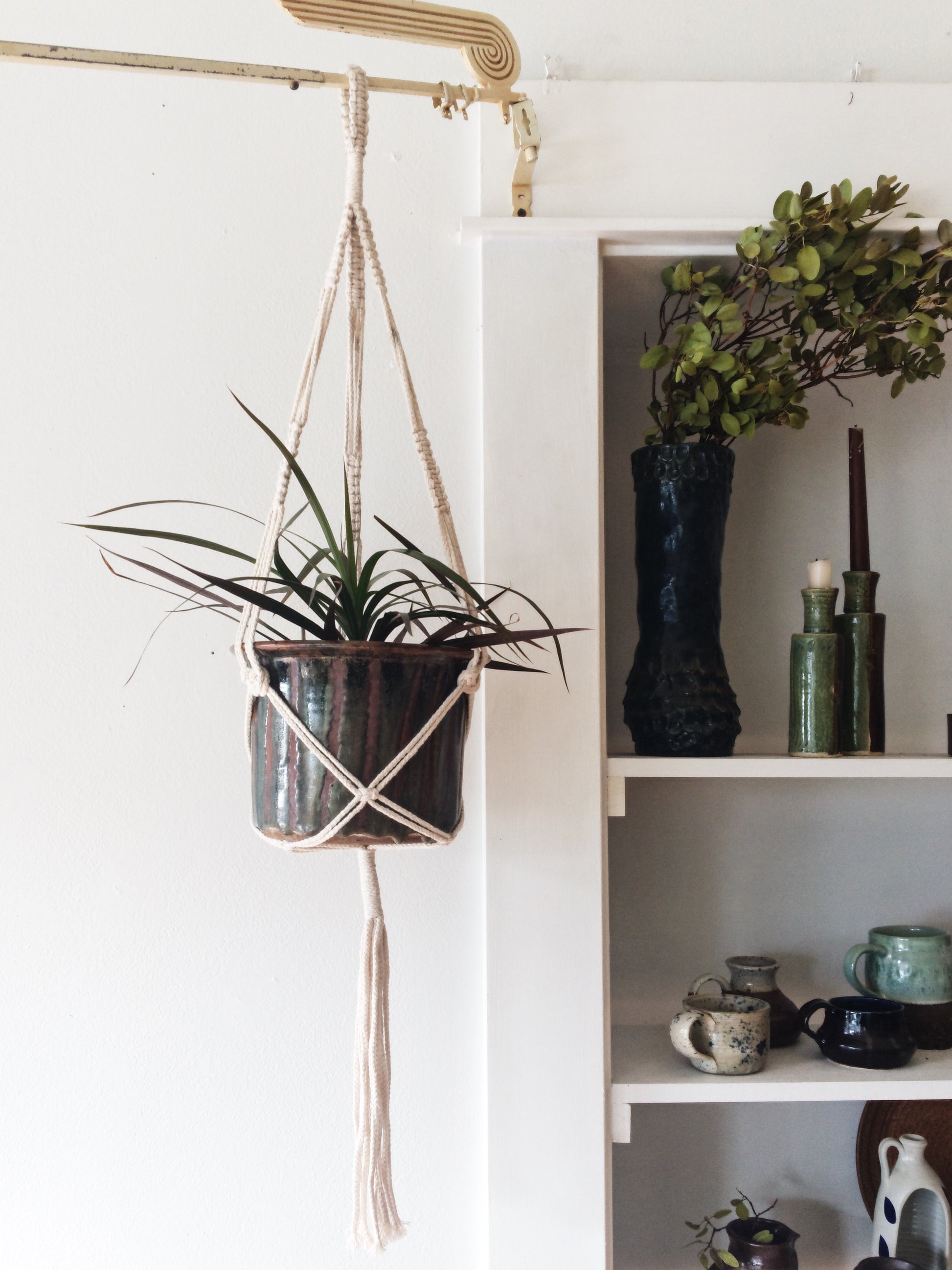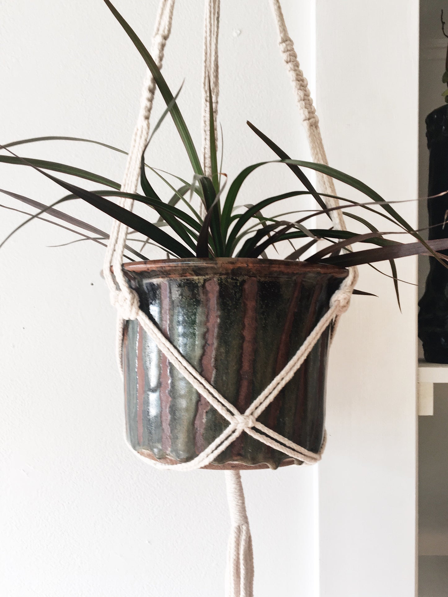 Beautiful mid century drop pot with simple cotton macrame hanger.