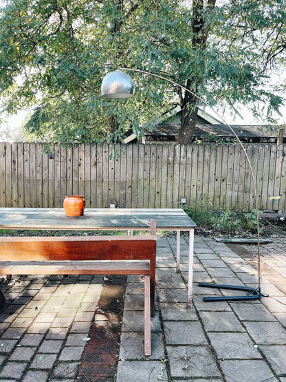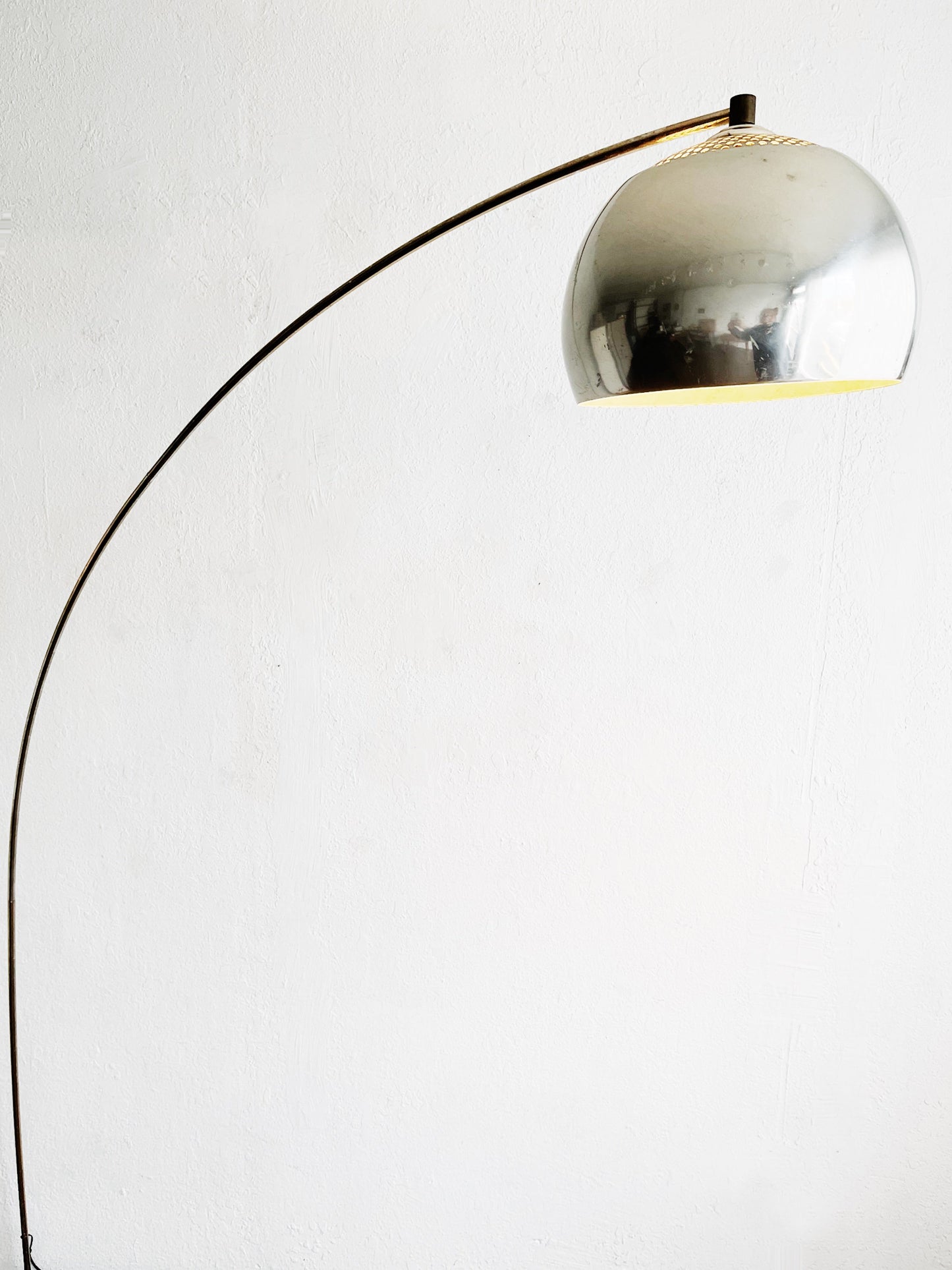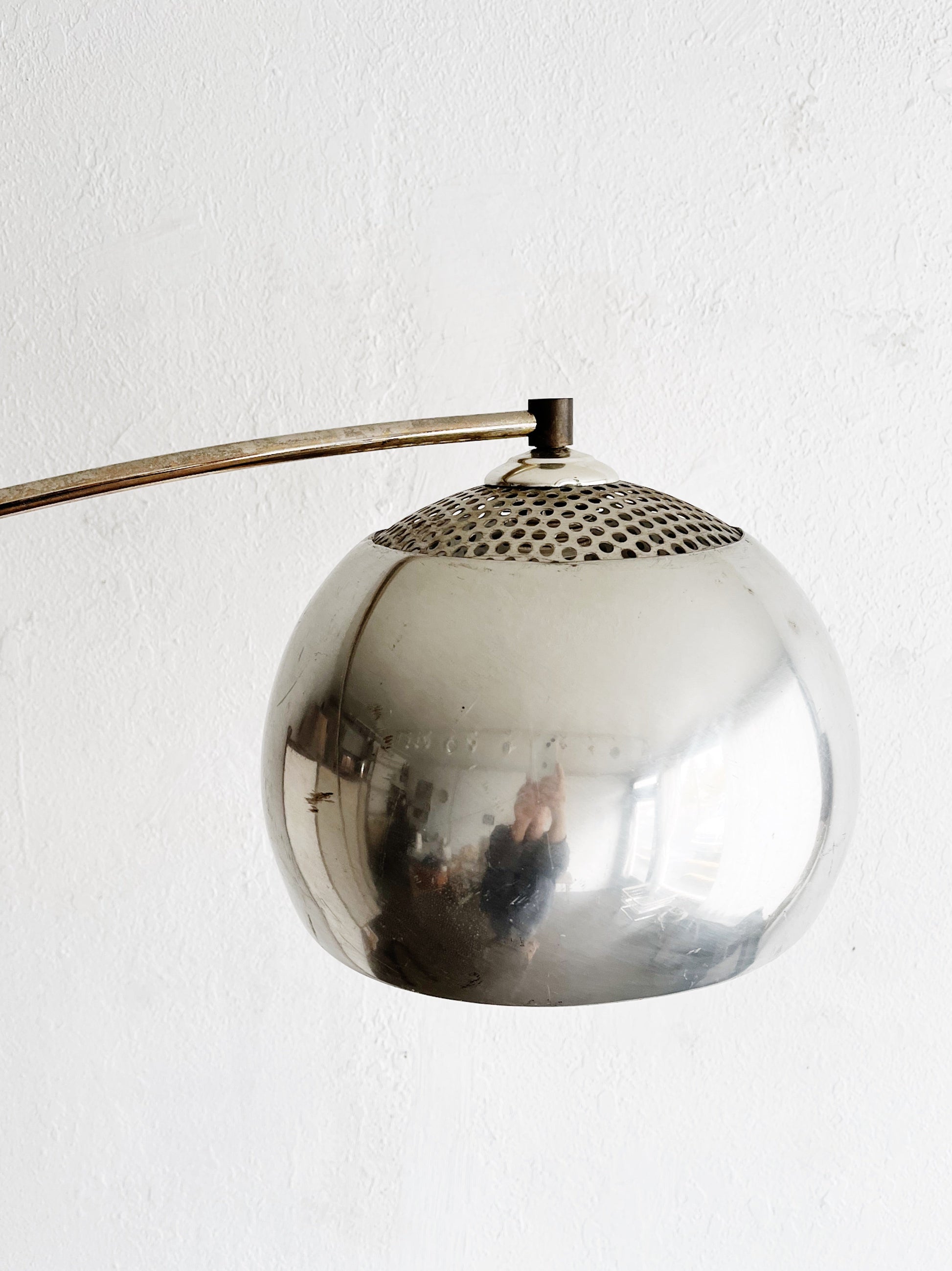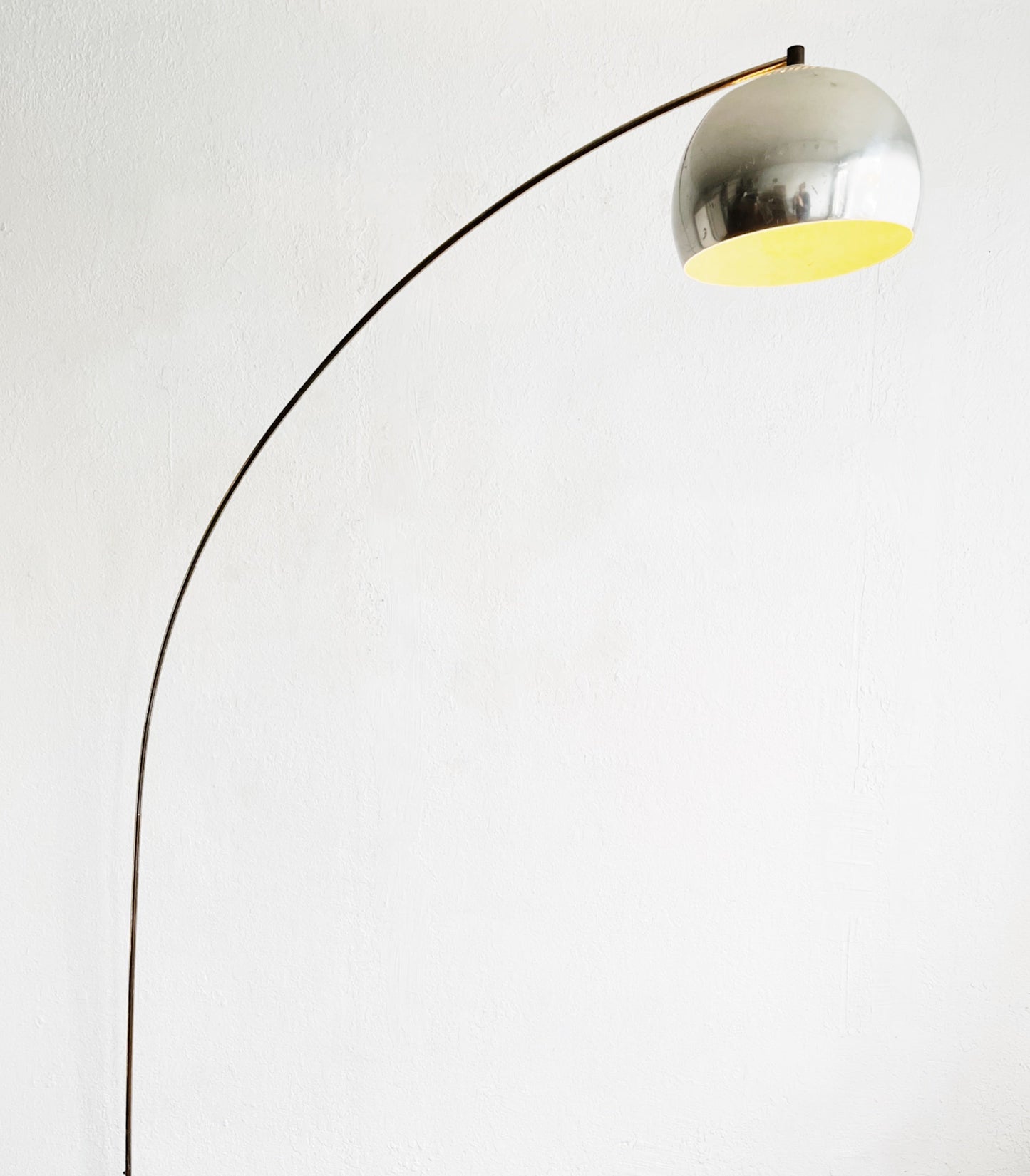 Beautiful large cantilevered arc lamp. Throws a really nice light. Weighted tubular steel base. Chrome neck and shade with perforated diffuser and wood finial. The lamp arc swivels and you can adjust the shade angle too. Original wiring with plug end and pedal on off switch. Takes a standard bulb. Chrome has mellowed with age. Some wear to the metal shade but due to its height doesn’t detract.