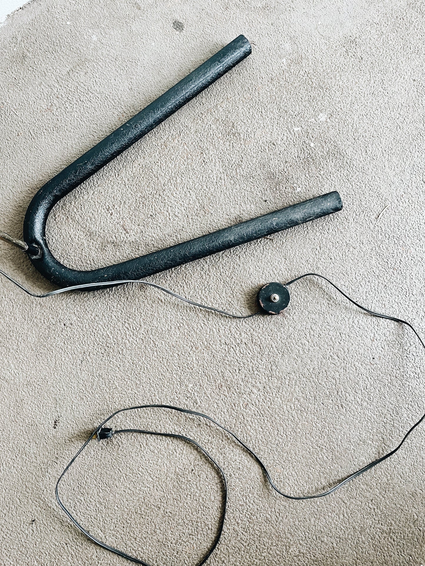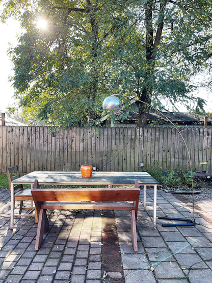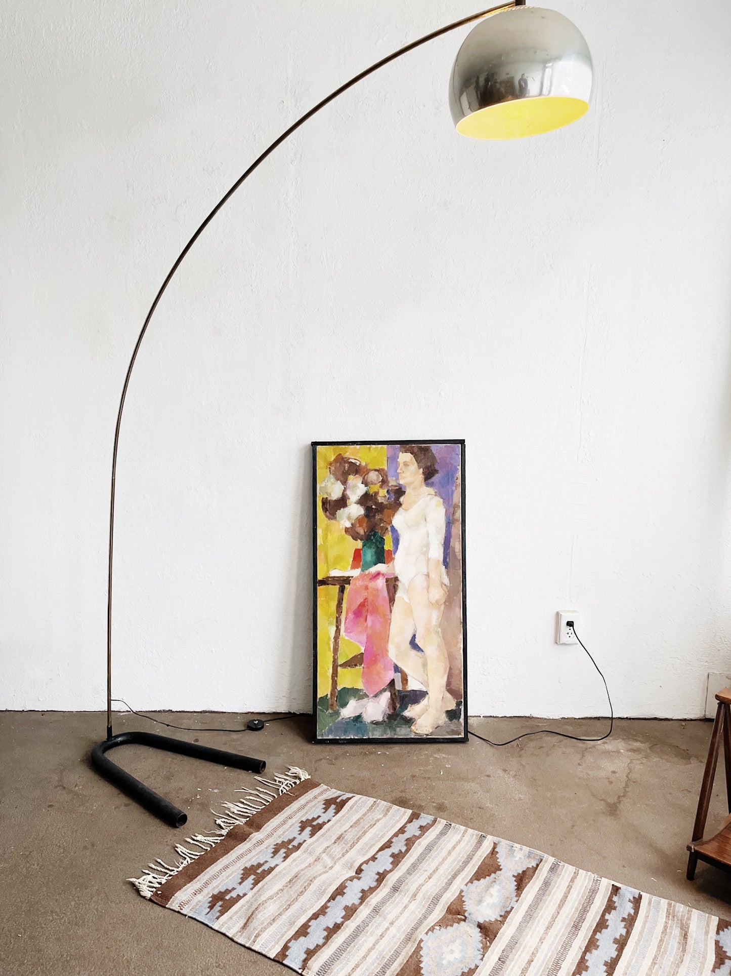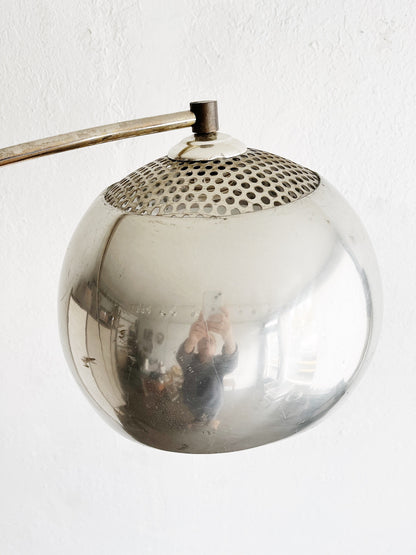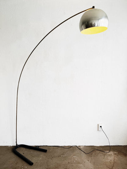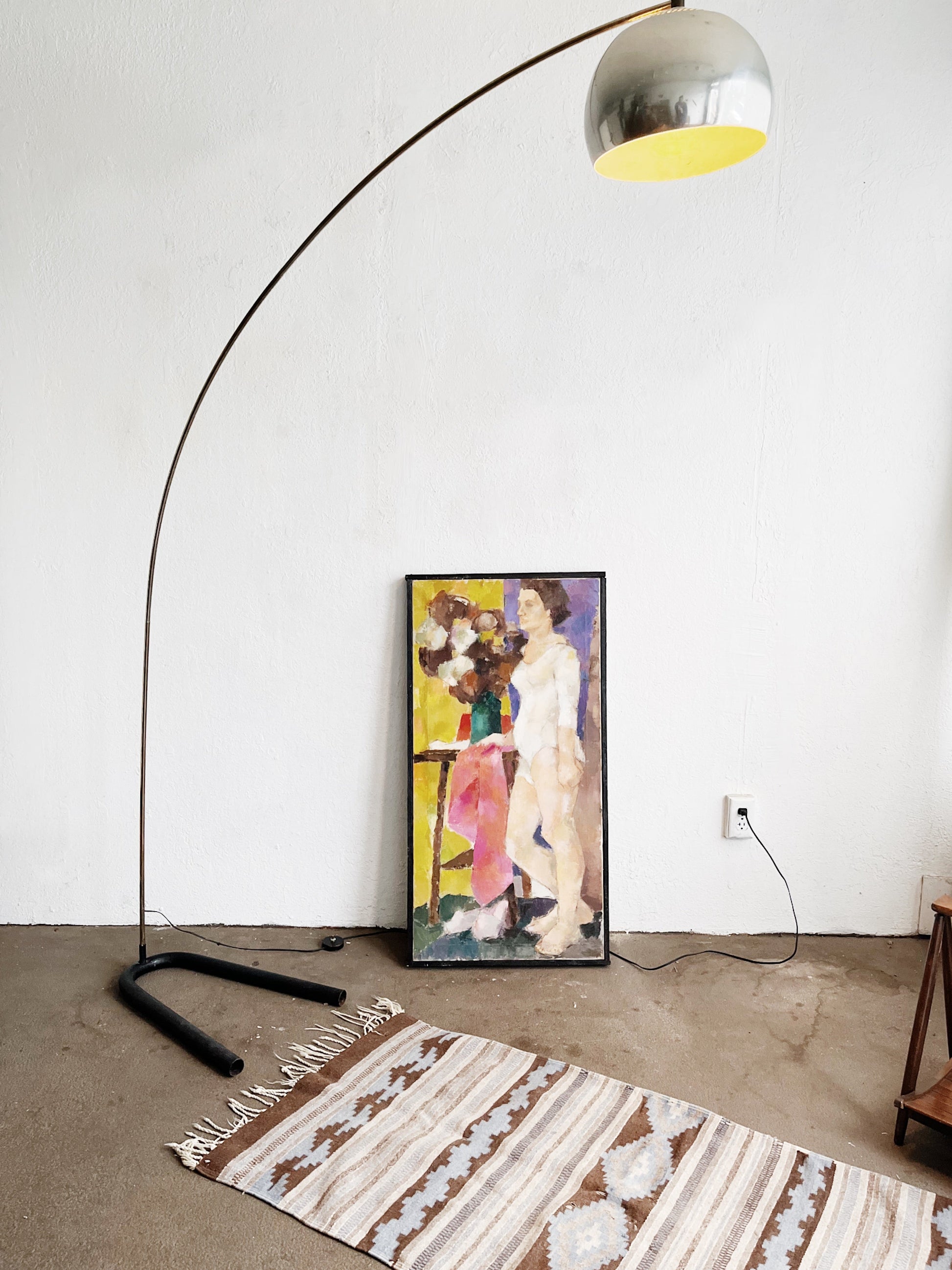 Beautiful large cantilevered arc lamp. Throws a really nice light. Weighted tubular steel base. Chrome neck and shade with perforated diffuser and wood finial. The lamp arc swivels and you can adjust the shade angle too. Original wiring with plug end and pedal on off switch. Takes a standard bulb. Chrome has mellowed with age. Some wear to the metal shade but due to its height doesn’t detract.