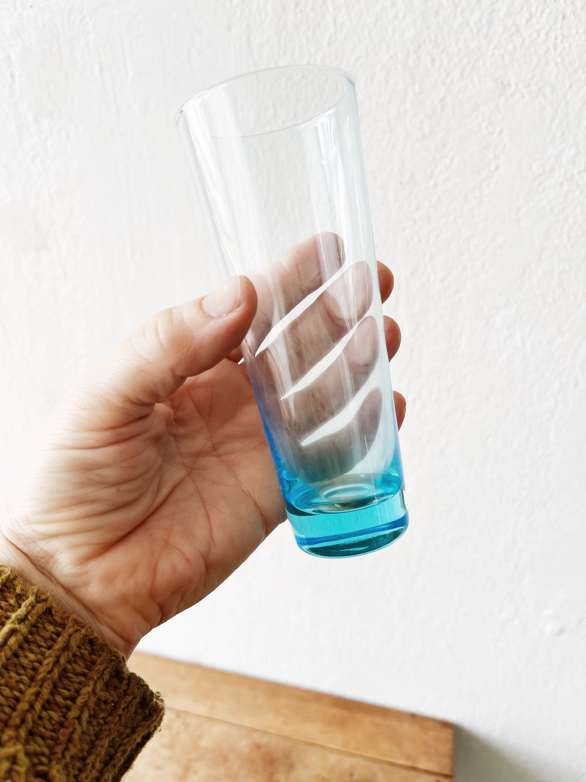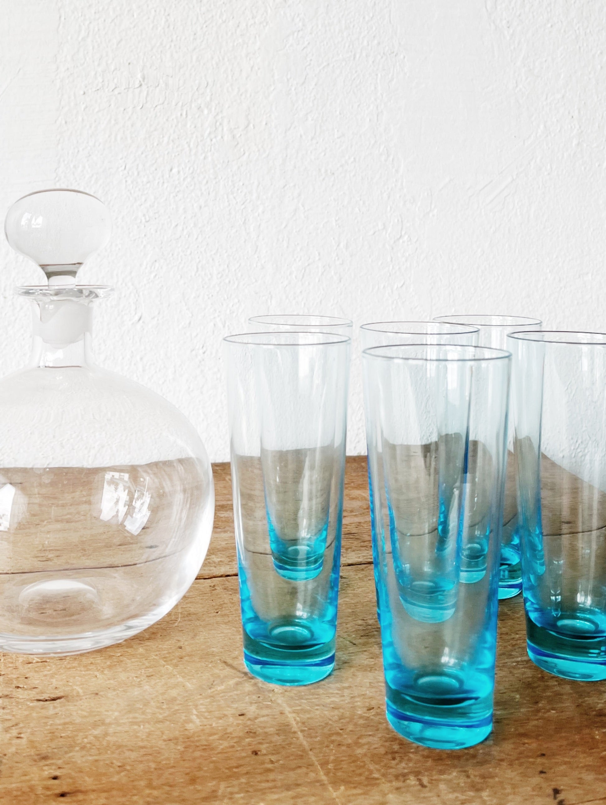 Hand blown mid century blue cocktail glasses. Tall and skinny for bubbly, g and t, or lemonade. Beautiful set for the vintage bar. Decanter sold separately