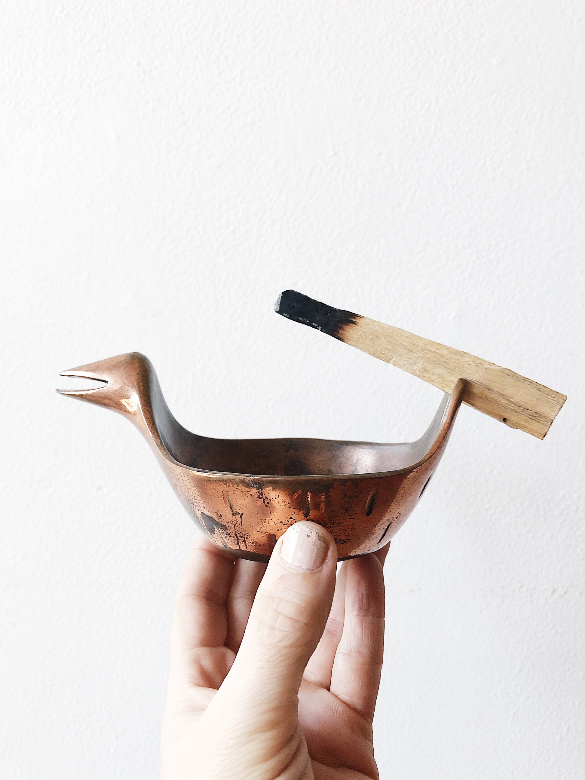 Mid Century copper bird that’s perfect for burning Palo Santo or incense. Copper plated