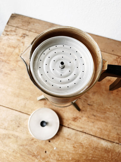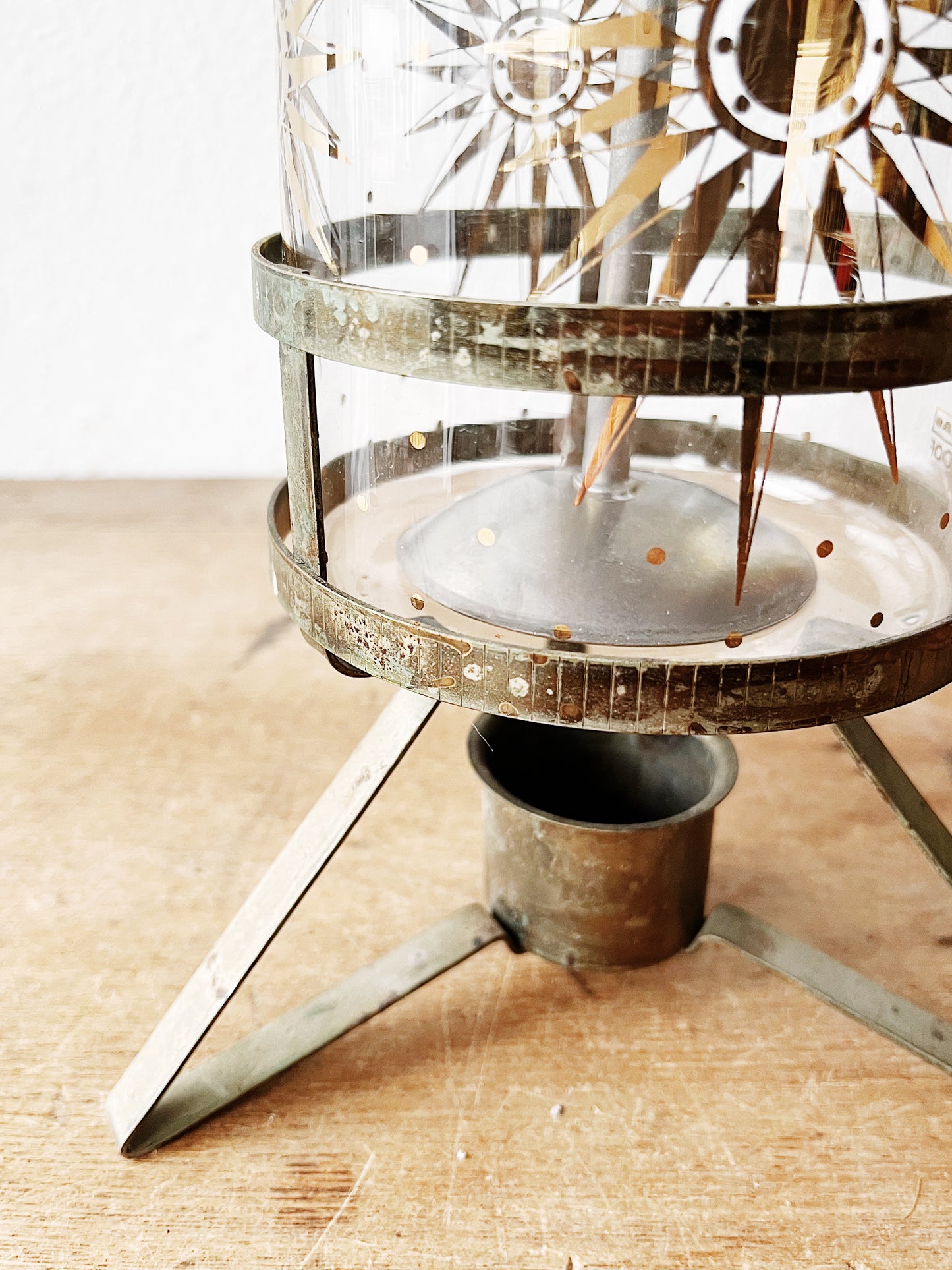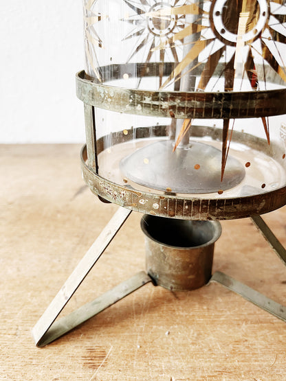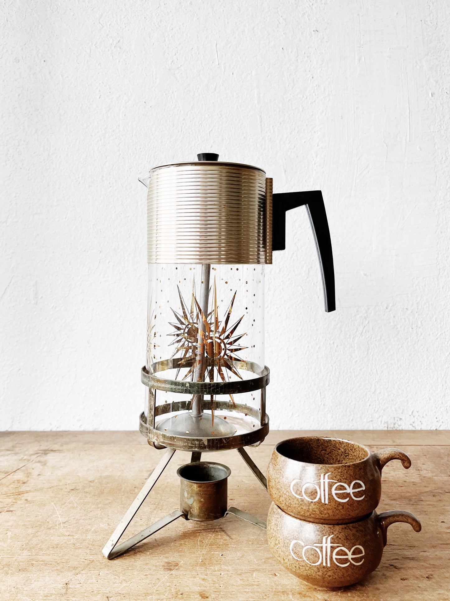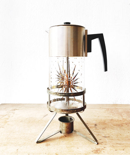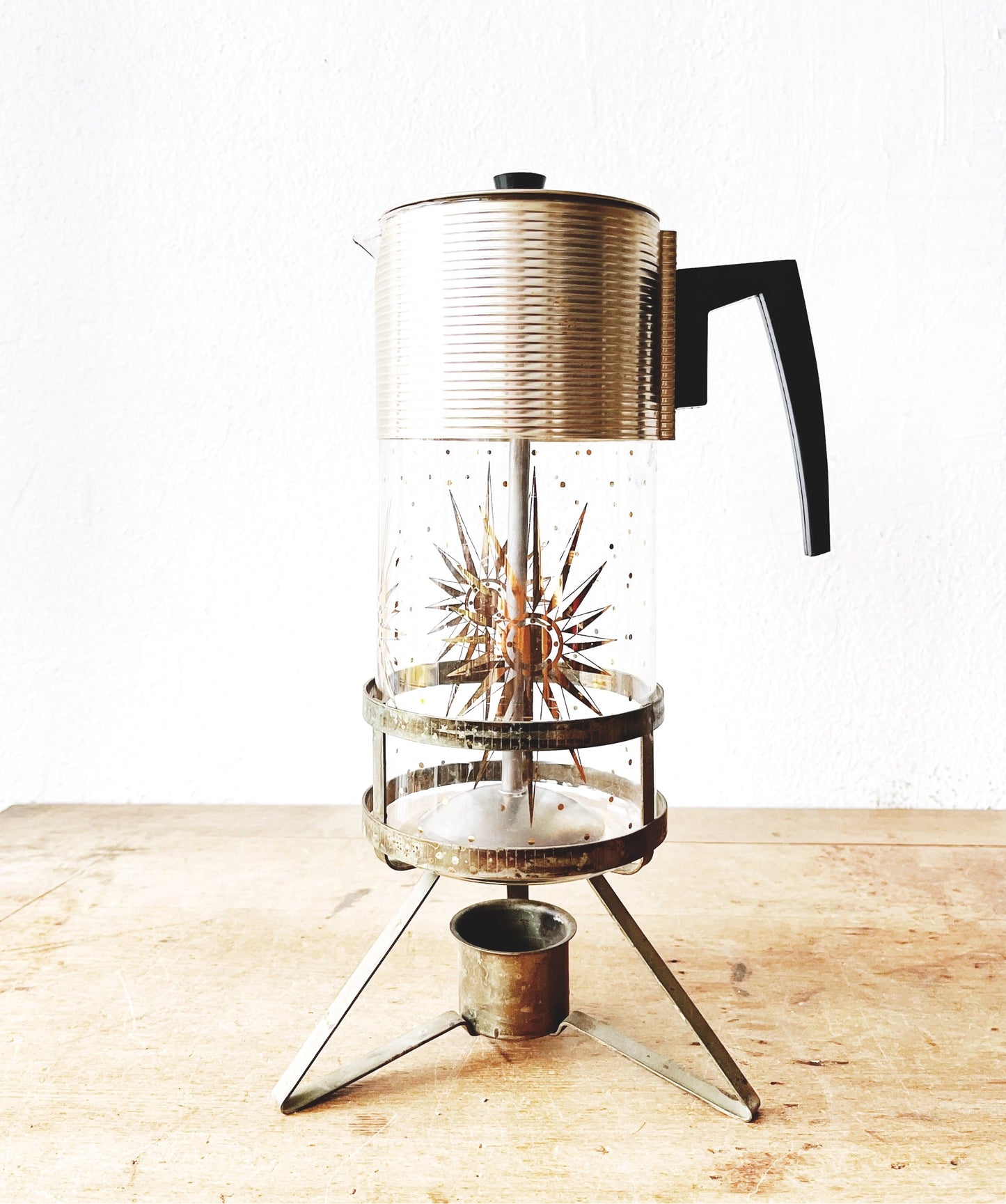 Old school candle warmer heats this glass sunburst David Douglas percolator. Gorgeous and utilitarian too. No power, no problem. It looks to be about an 8 cup maker