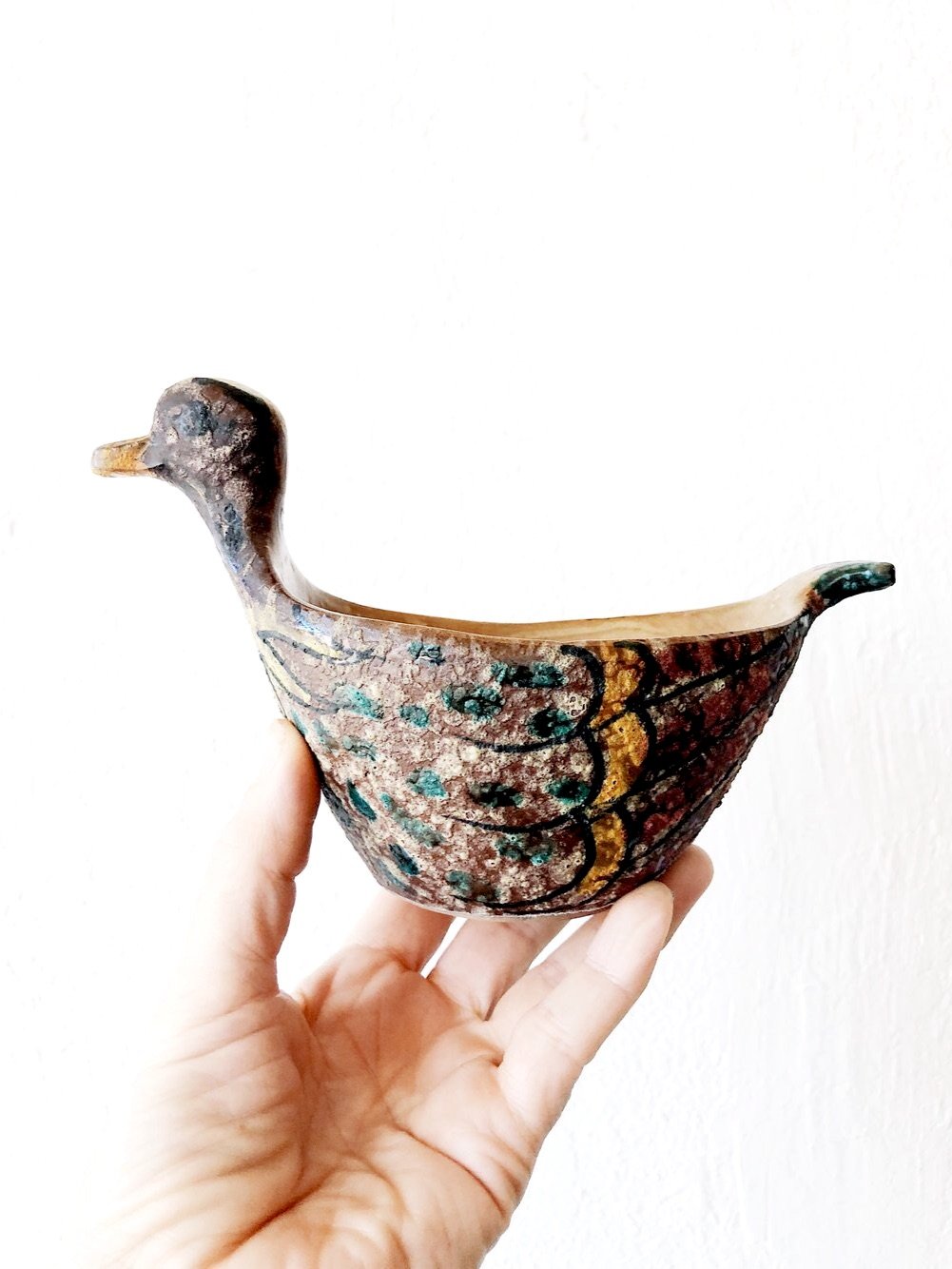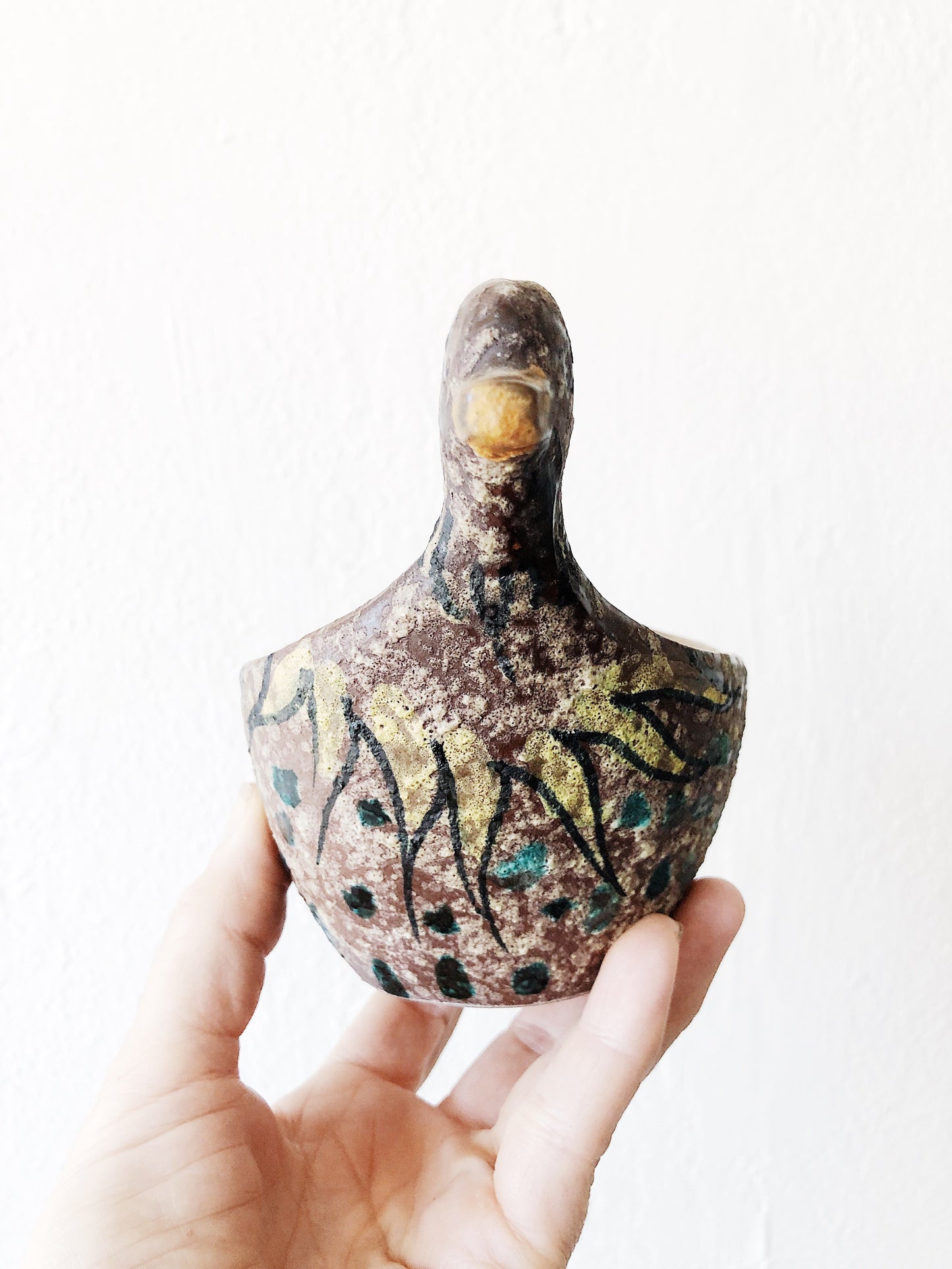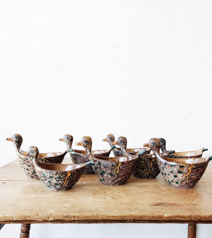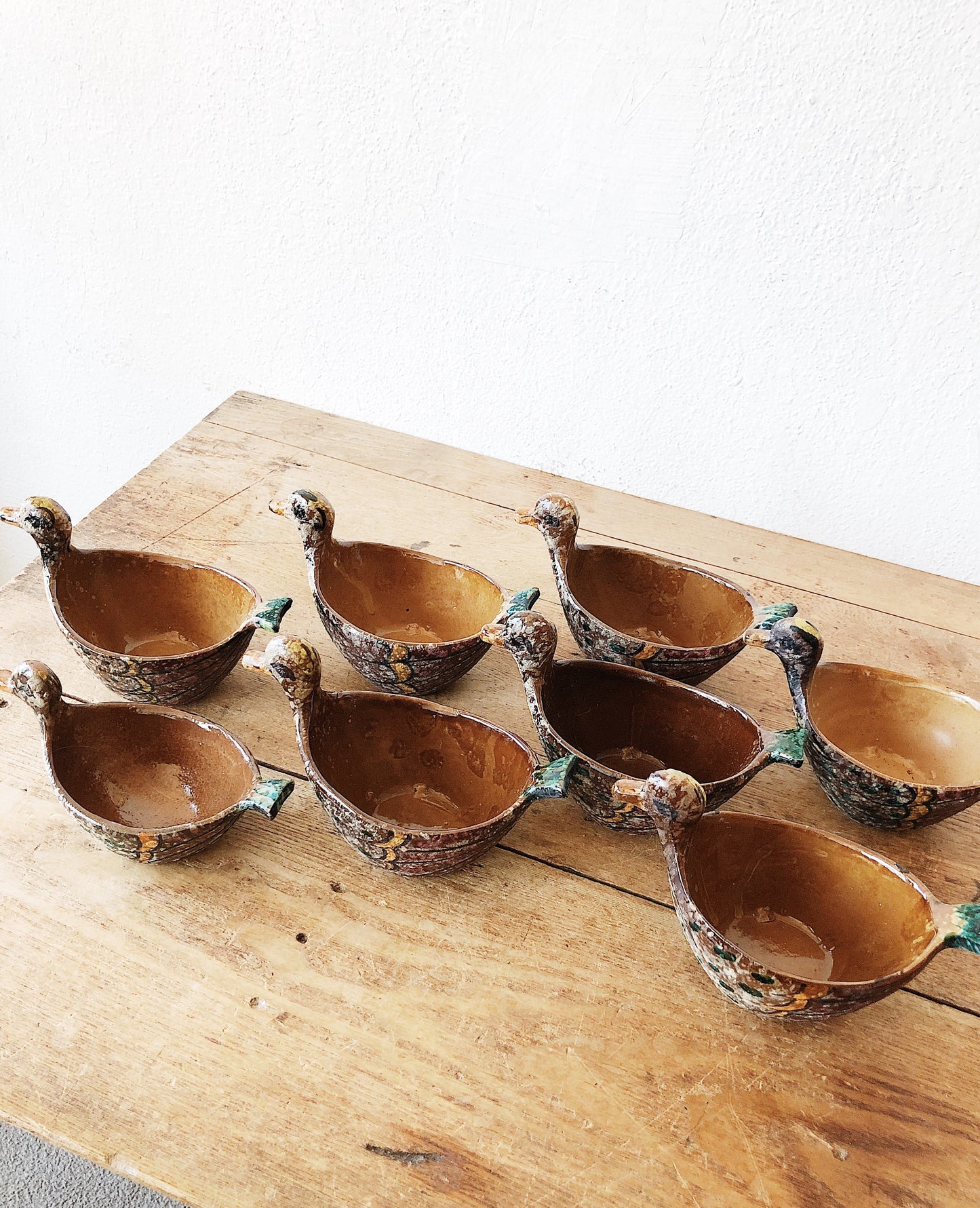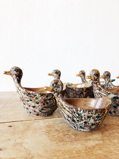 A whole flock of mid century Ed Langbein Italian art pottery birds. In the style of Bitossi. Similar to Spanish majolica, these have an earthy glaze and nice shape. Catch all or planter