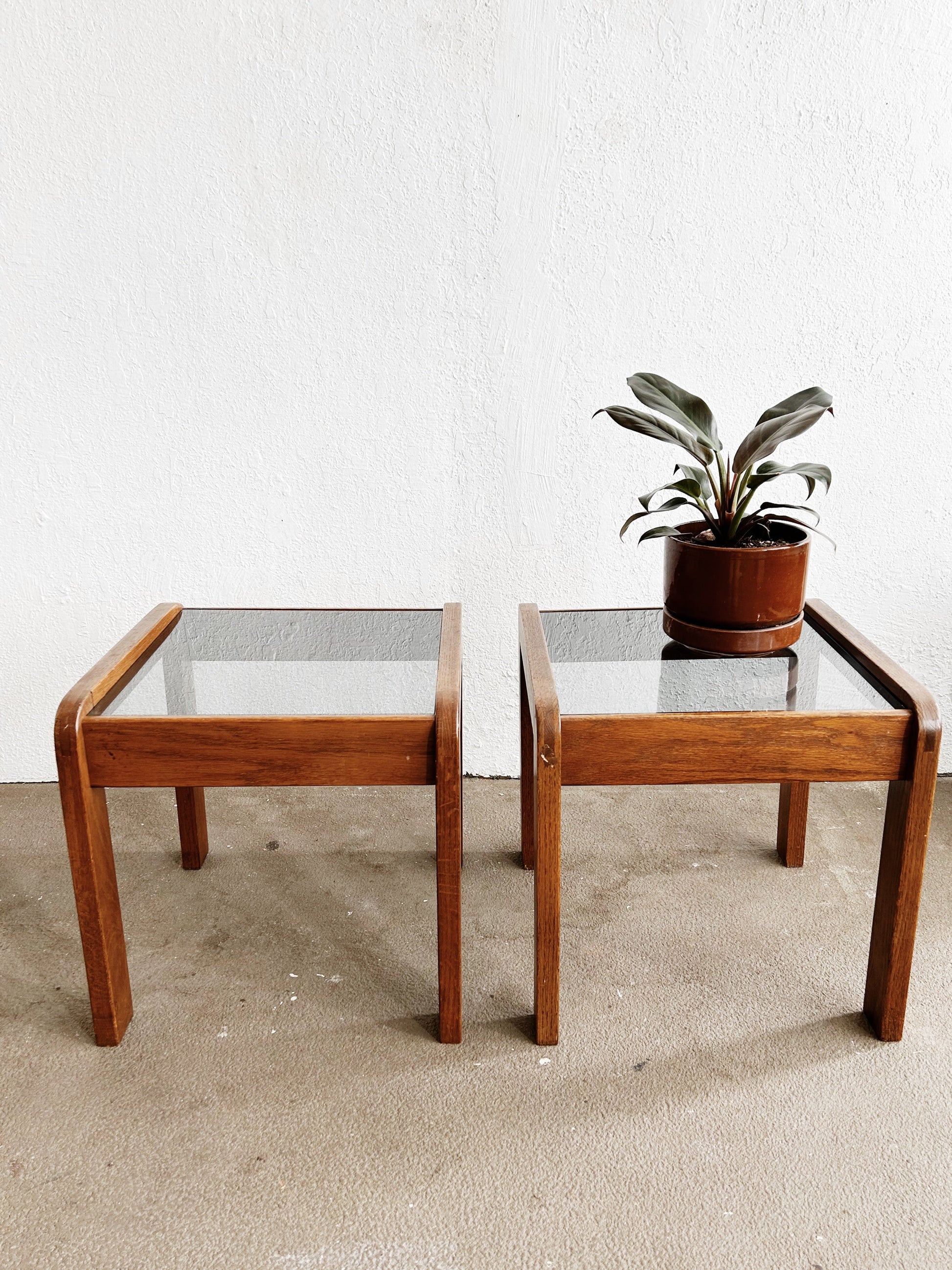 Mid century dark oak table with thick smoky glass insert top. Beauties. Sold separately.