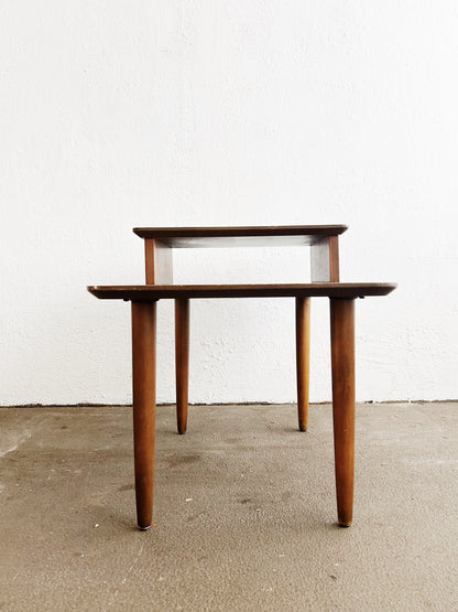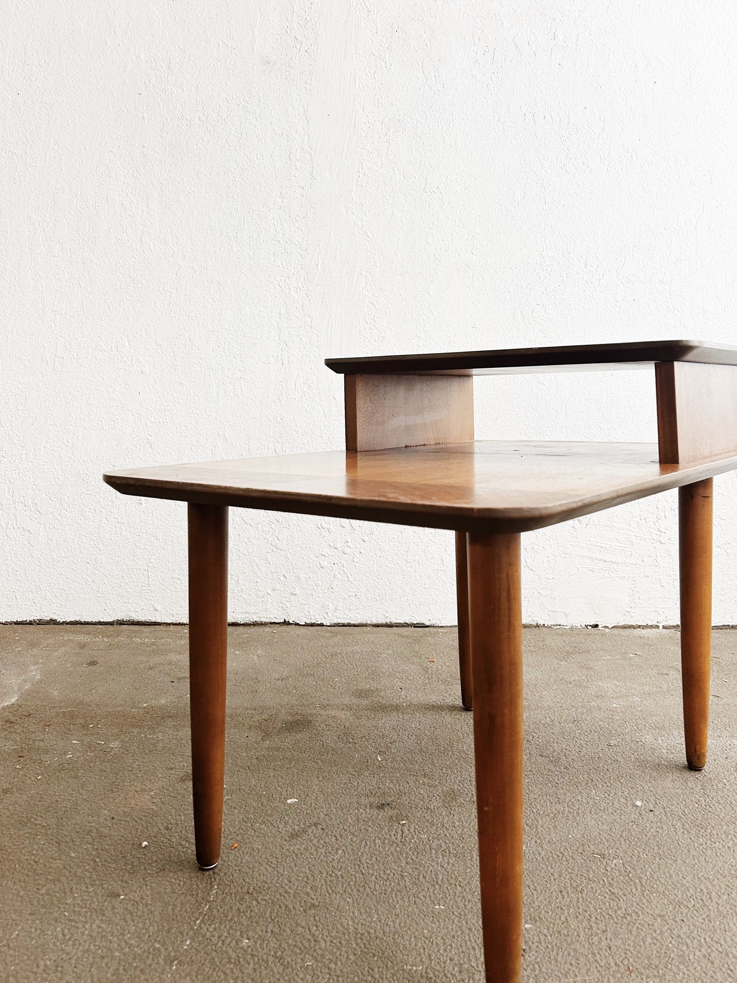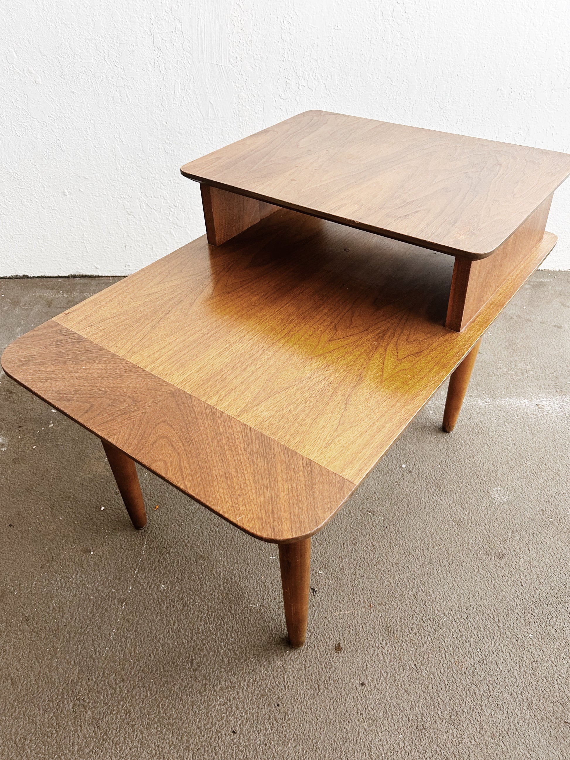 classic, beautiful mid century two tiered end table in excellent condition. Sturdy, nice tone and grain patterning.