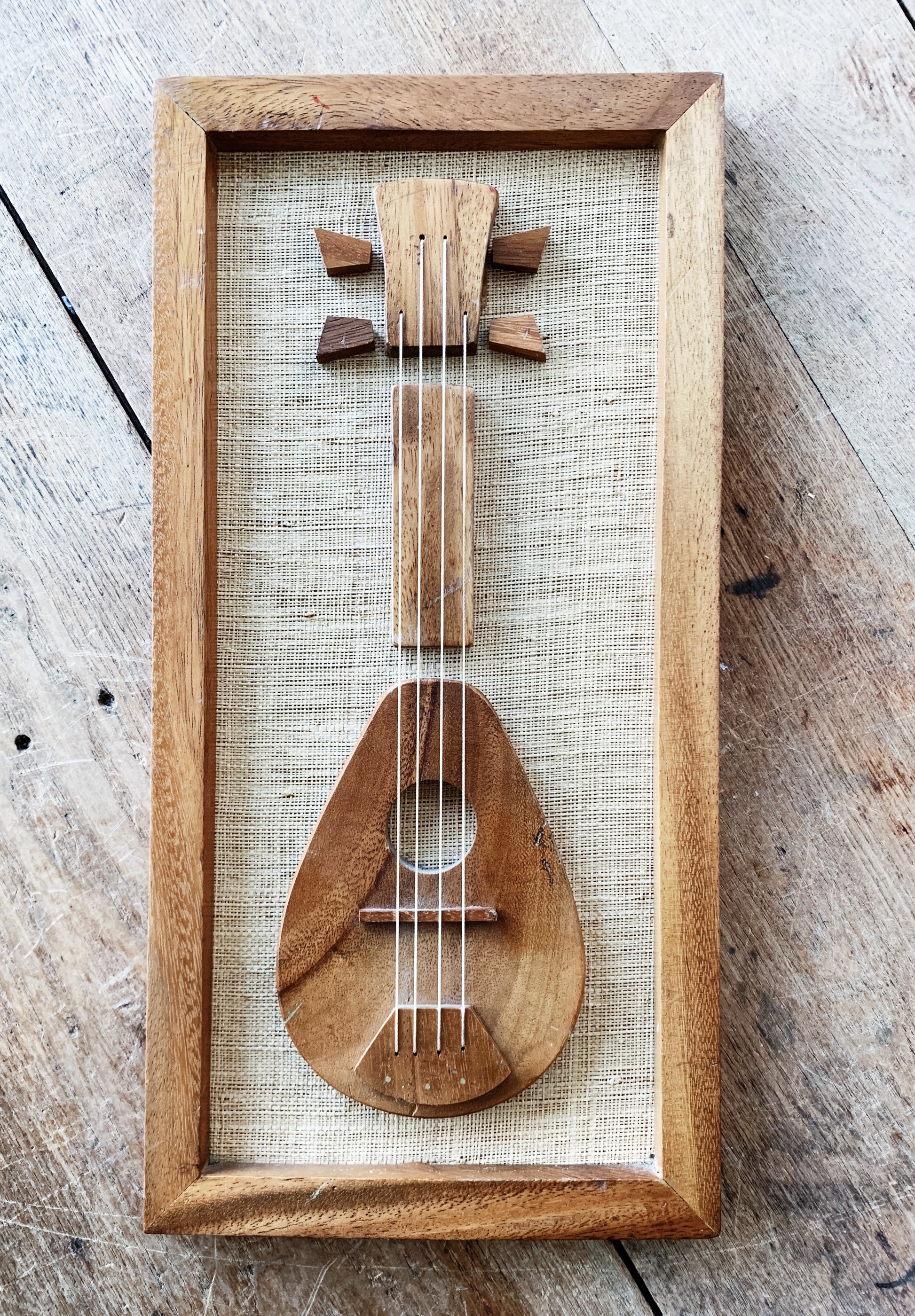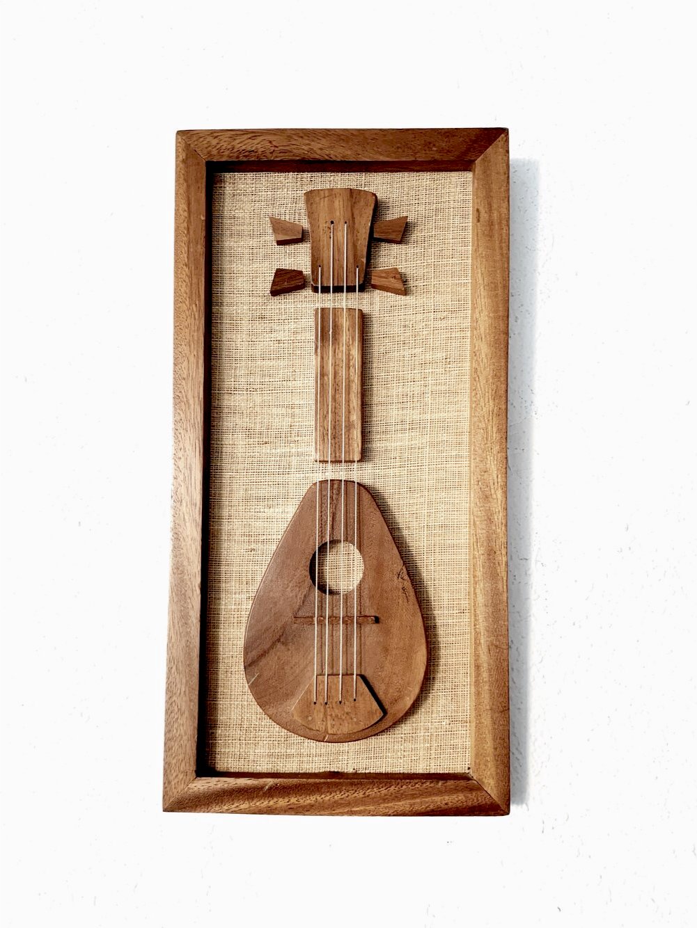 Classic mid century Enesco art piece. Mandolin made of acacia wood, nicely framed with grass mat backing and wood frame. Nice and clean condition.