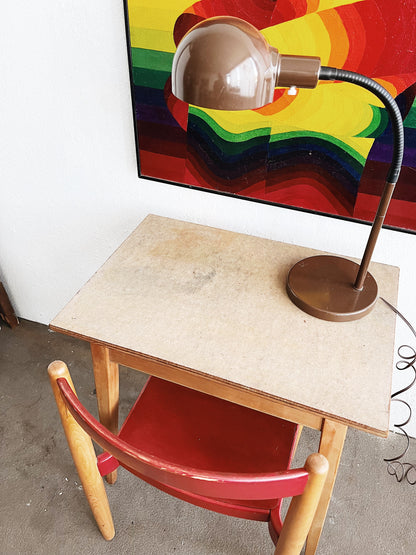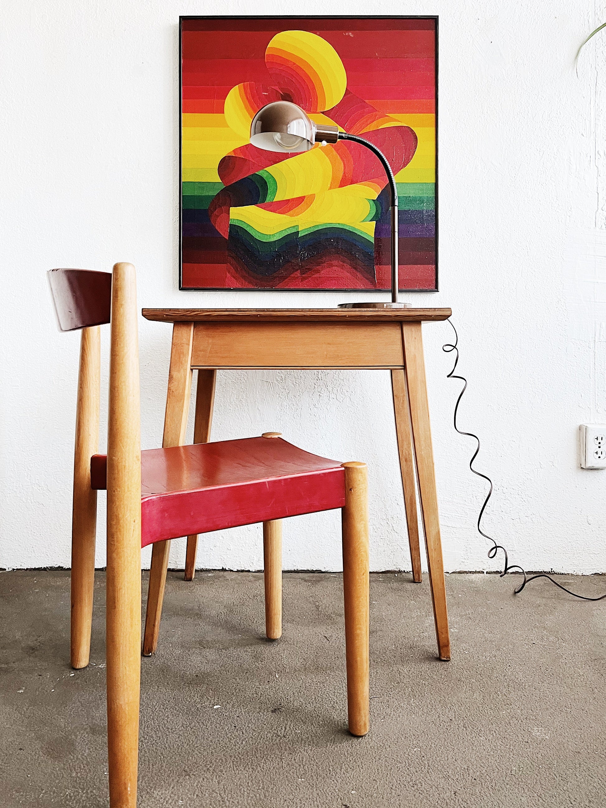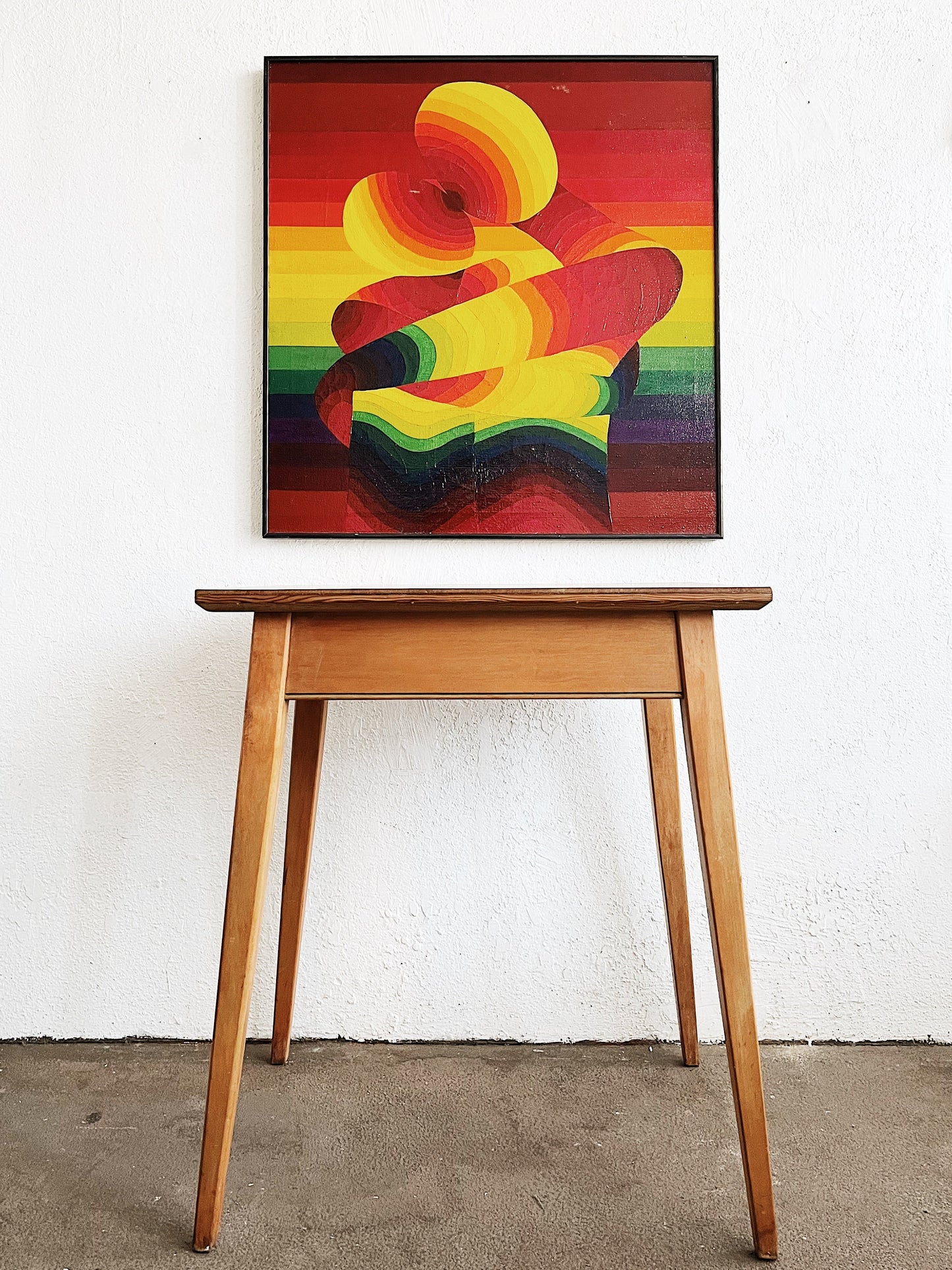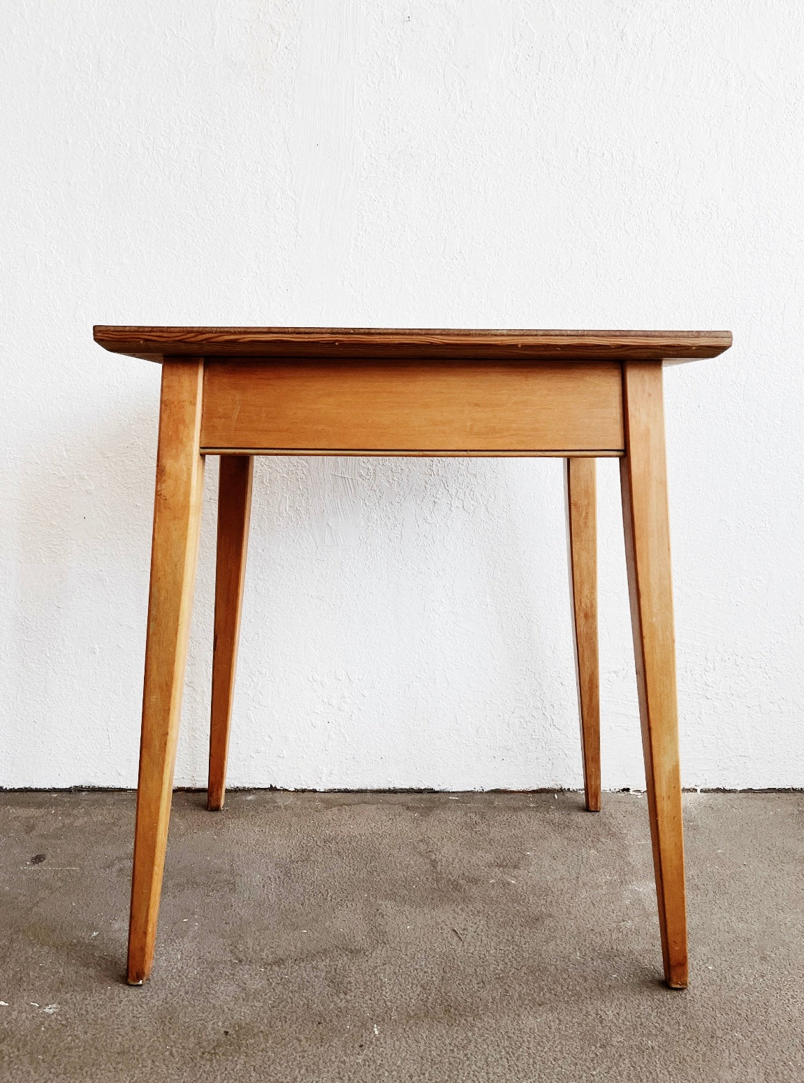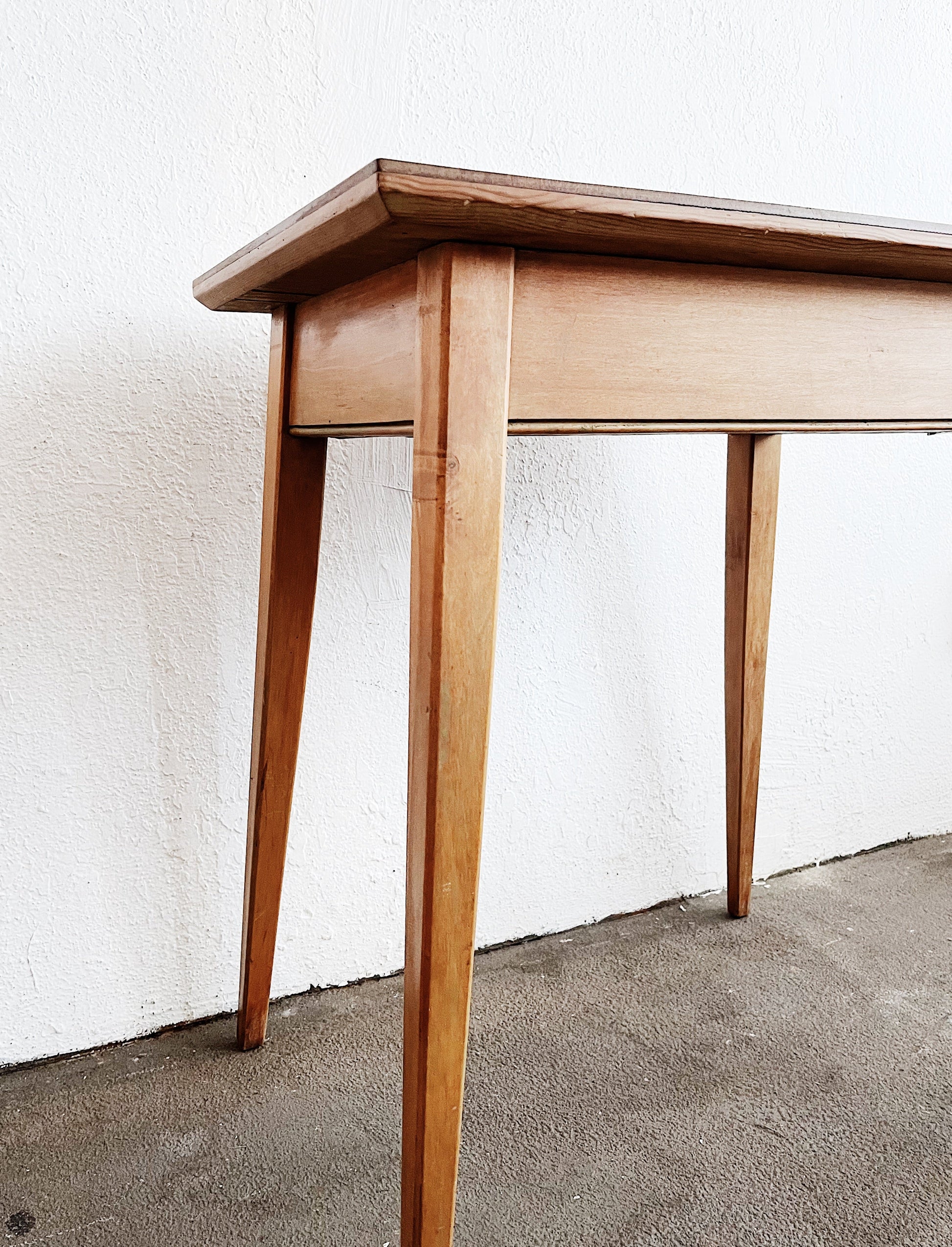 Simple hardwood with a classic mid century shape. Nicely sized for a small entryway. Makes a great desk too. Top is sealed fiberboard over nice old ply and the frame is maple