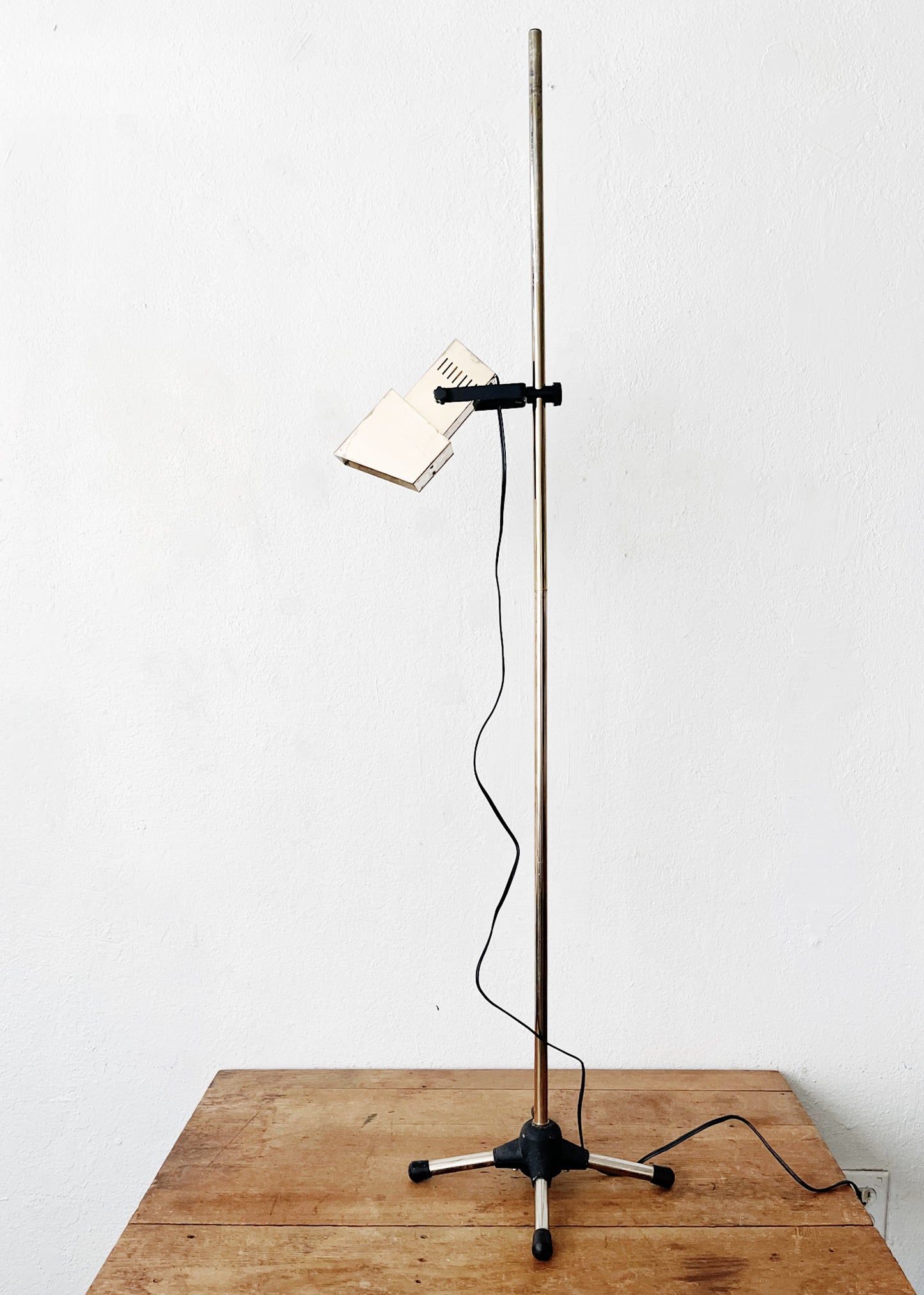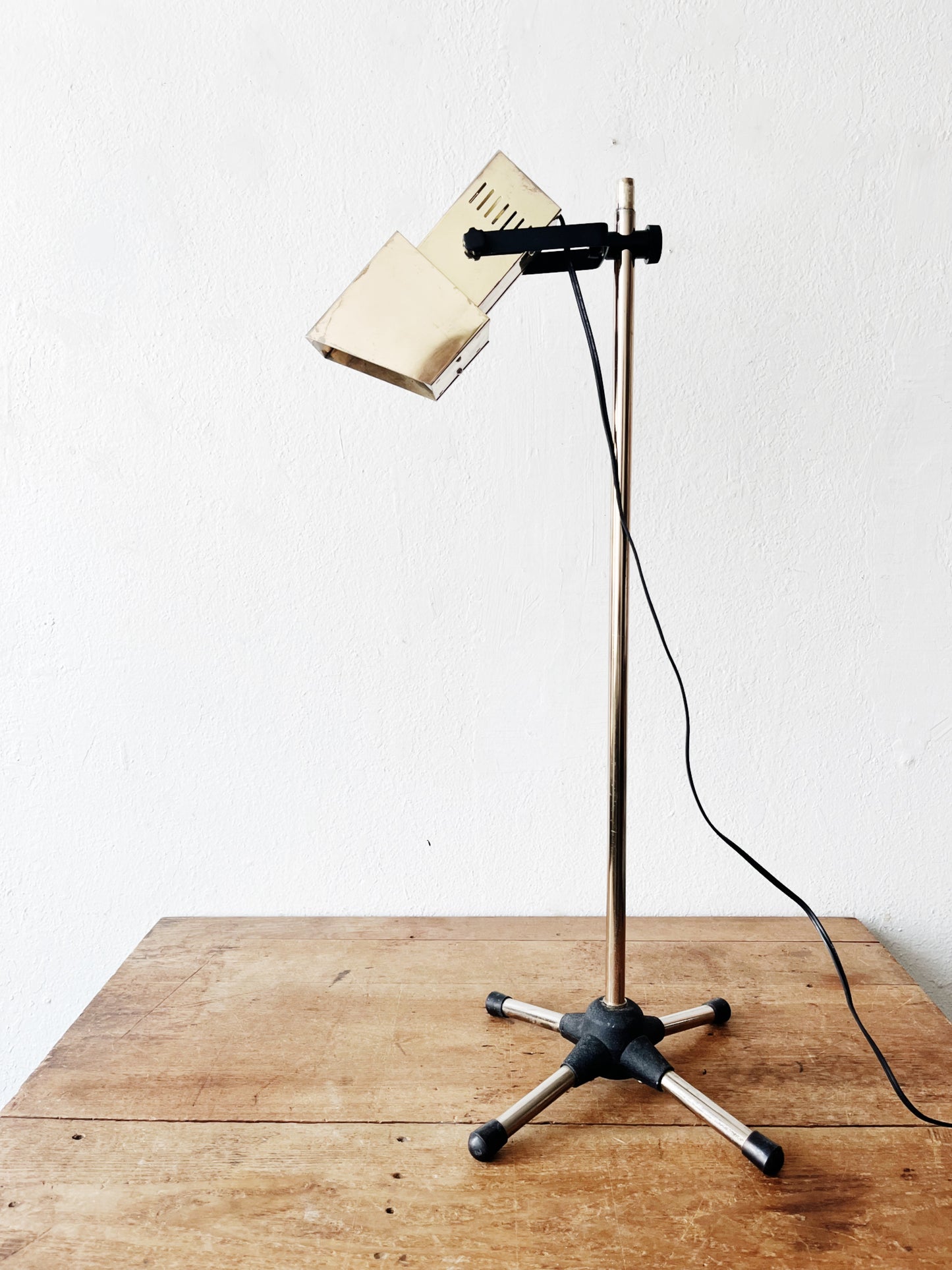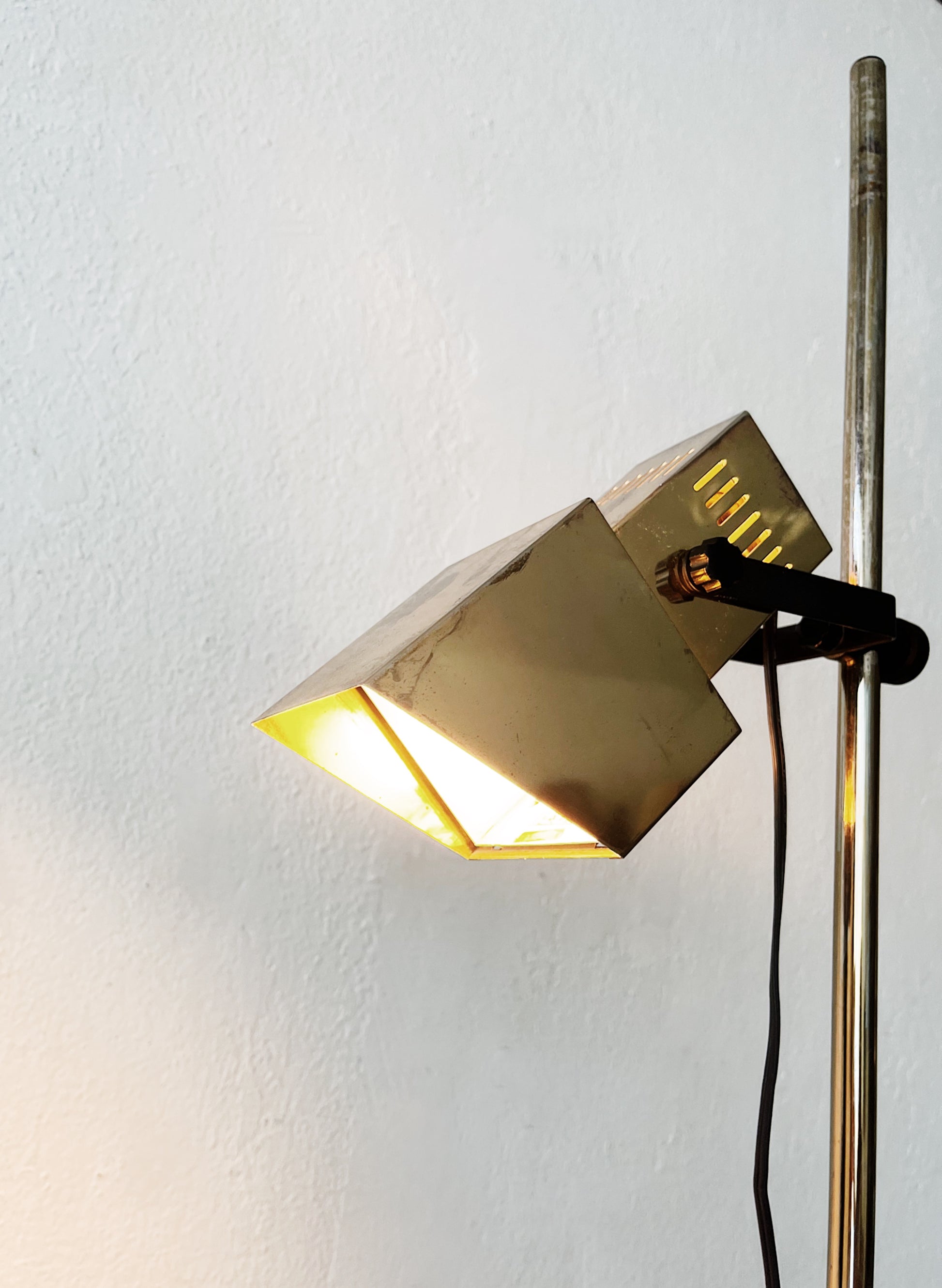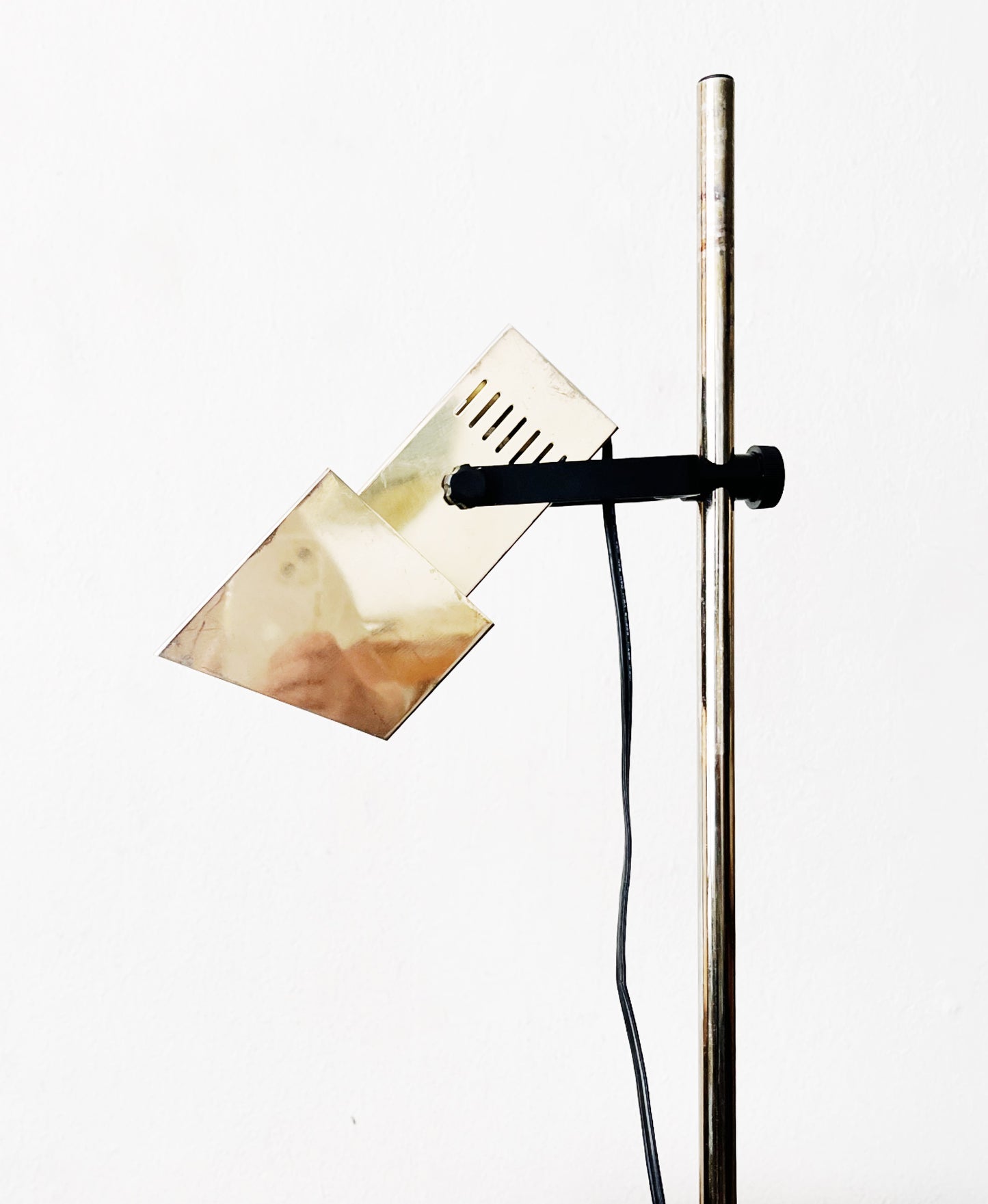 Koch & Lowy EA Mid Century Modern adjustable floor lamp. Somewhere between chrome and brass. Modern minimalist design that features an industrial studio style articulated shade. Swivels & angles adjust, also height adjustable up & down the pole. Additionally the top section of the pole can be removed to use as a table lamp.