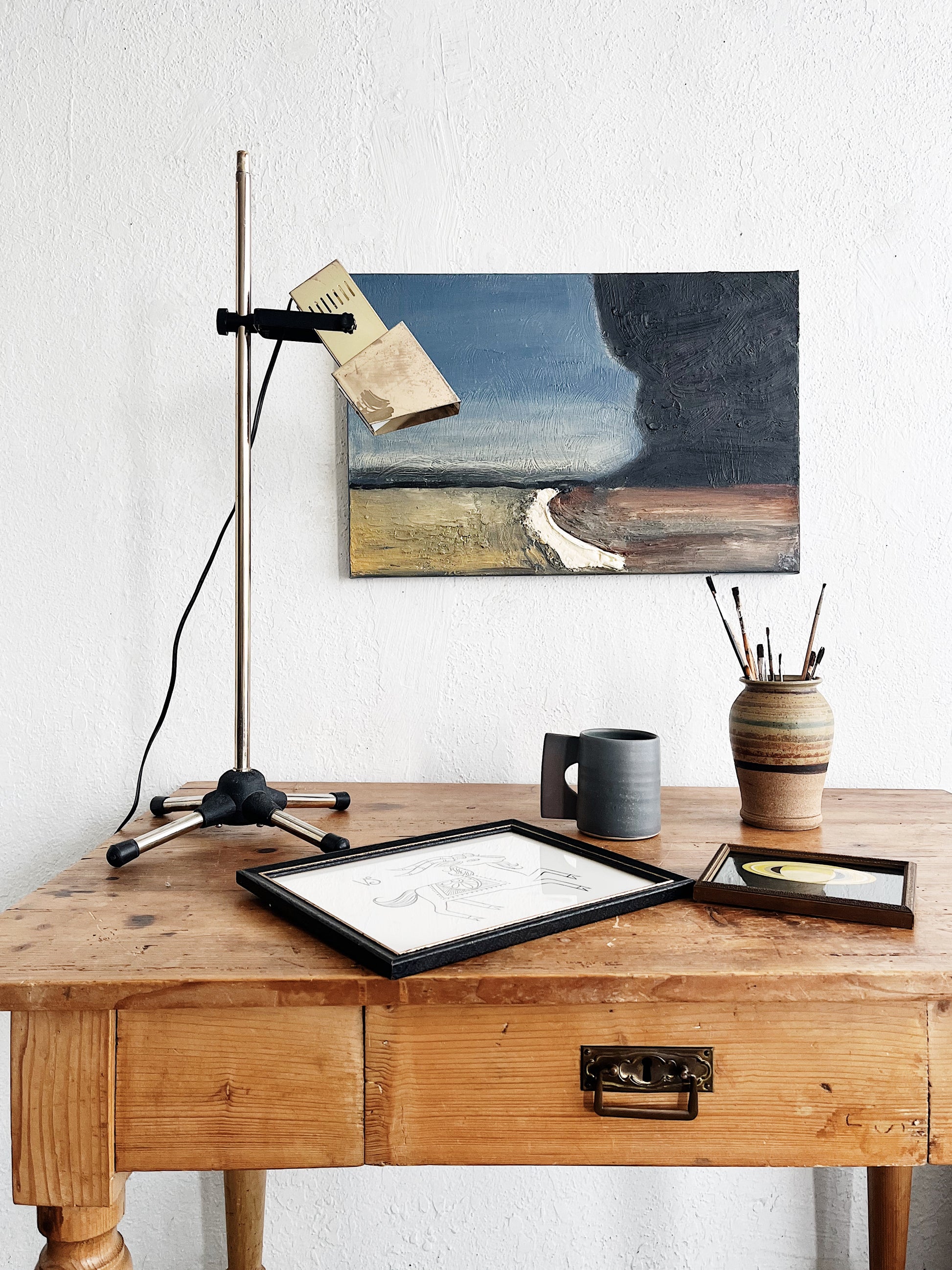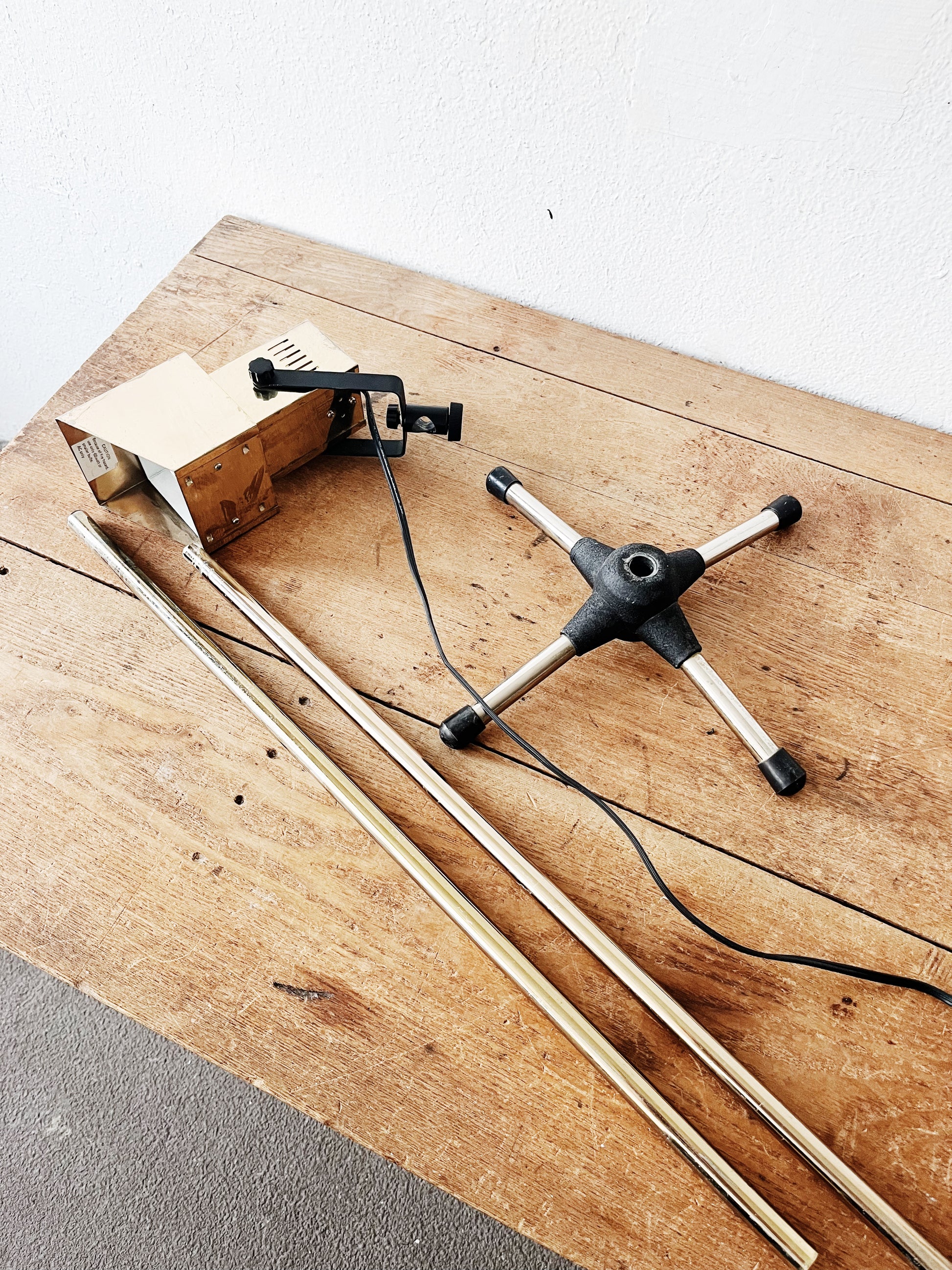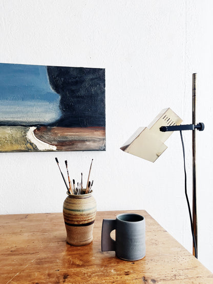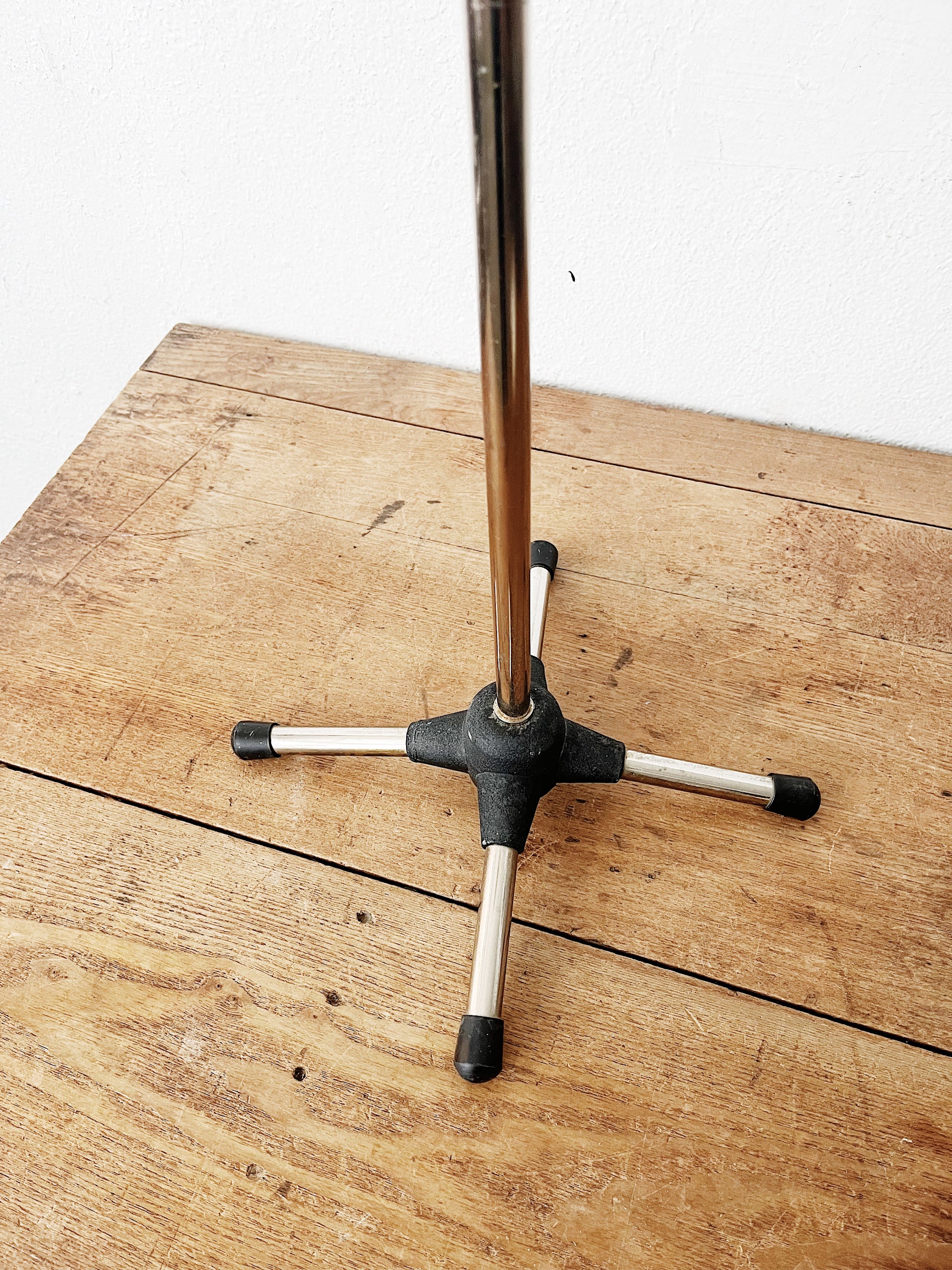 Koch & Lowy EA Mid Century Modern adjustable floor lamp. Somewhere between chrome and brass. Modern minimalist design that features an industrial studio style articulated shade. Swivels & angles adjust, also height adjustable up & down the pole. Additionally the top section of the pole can be removed to use as a table lamp.