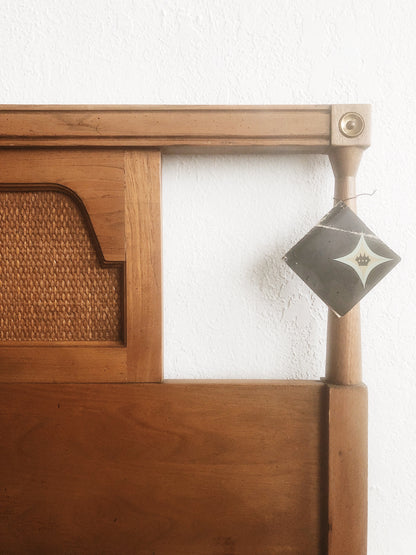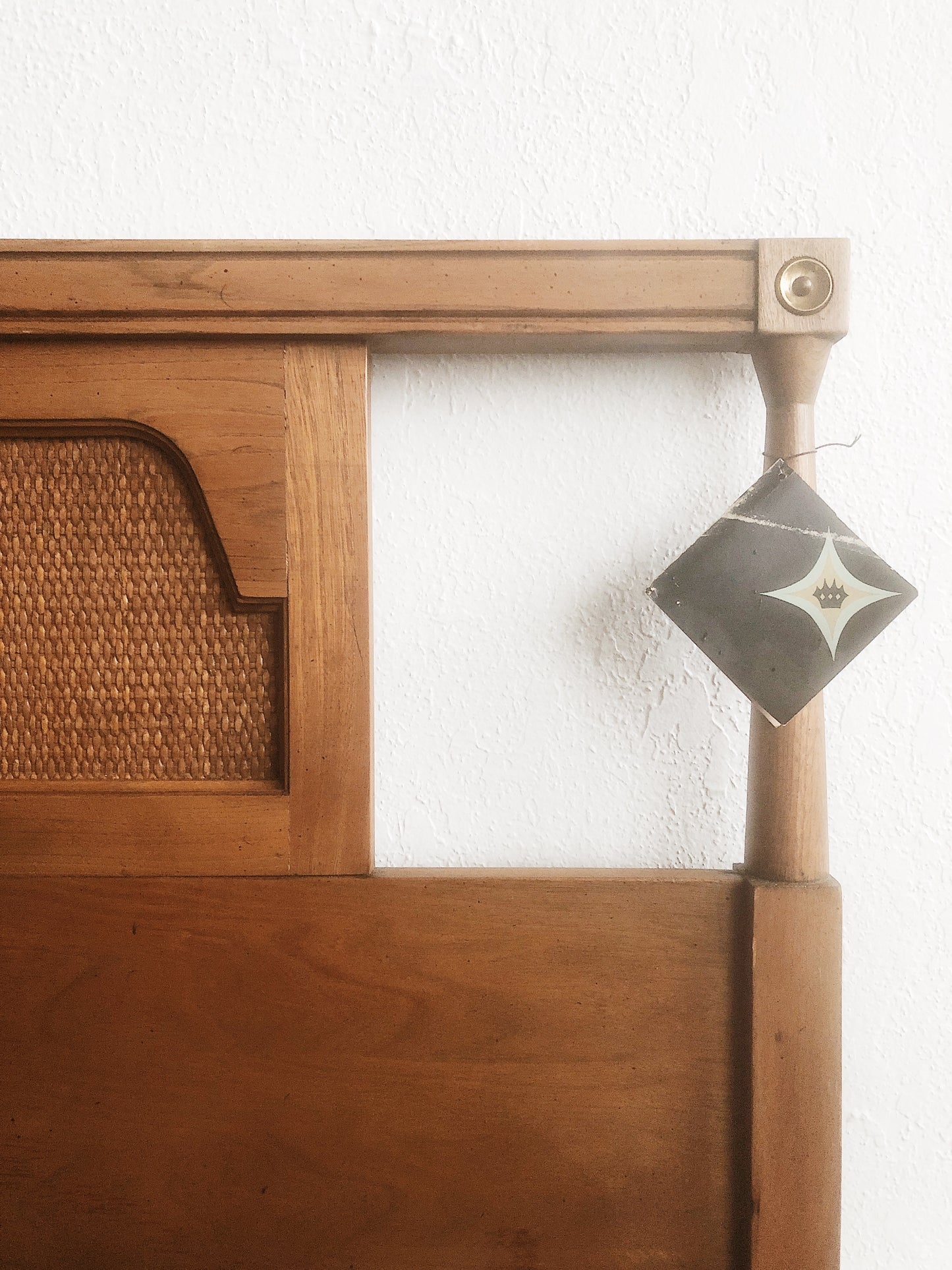 Fabulous mid century bed frame with woven headboard panels. Original tags! Small brass tone rosettes on corners. Metal side rails included