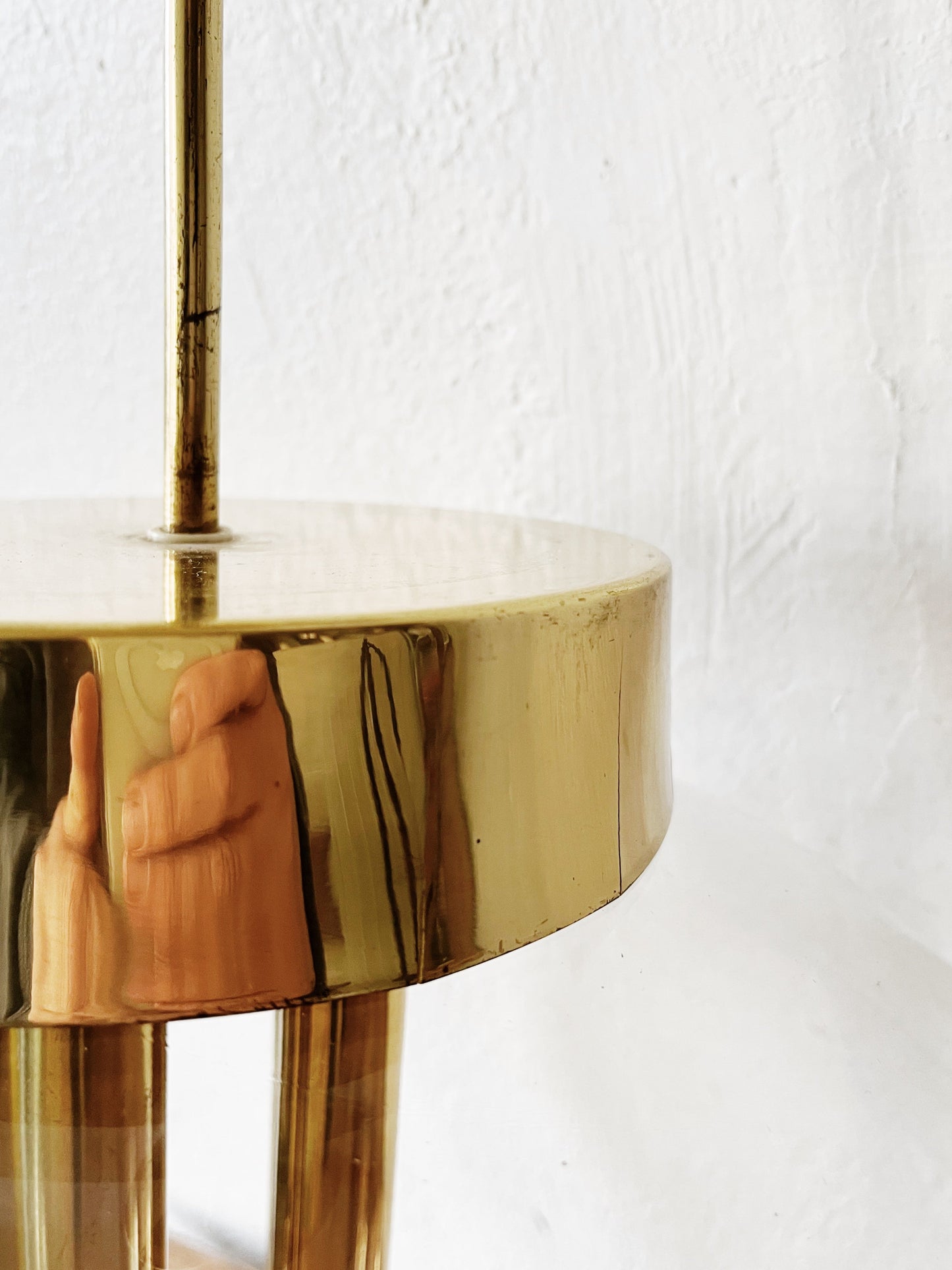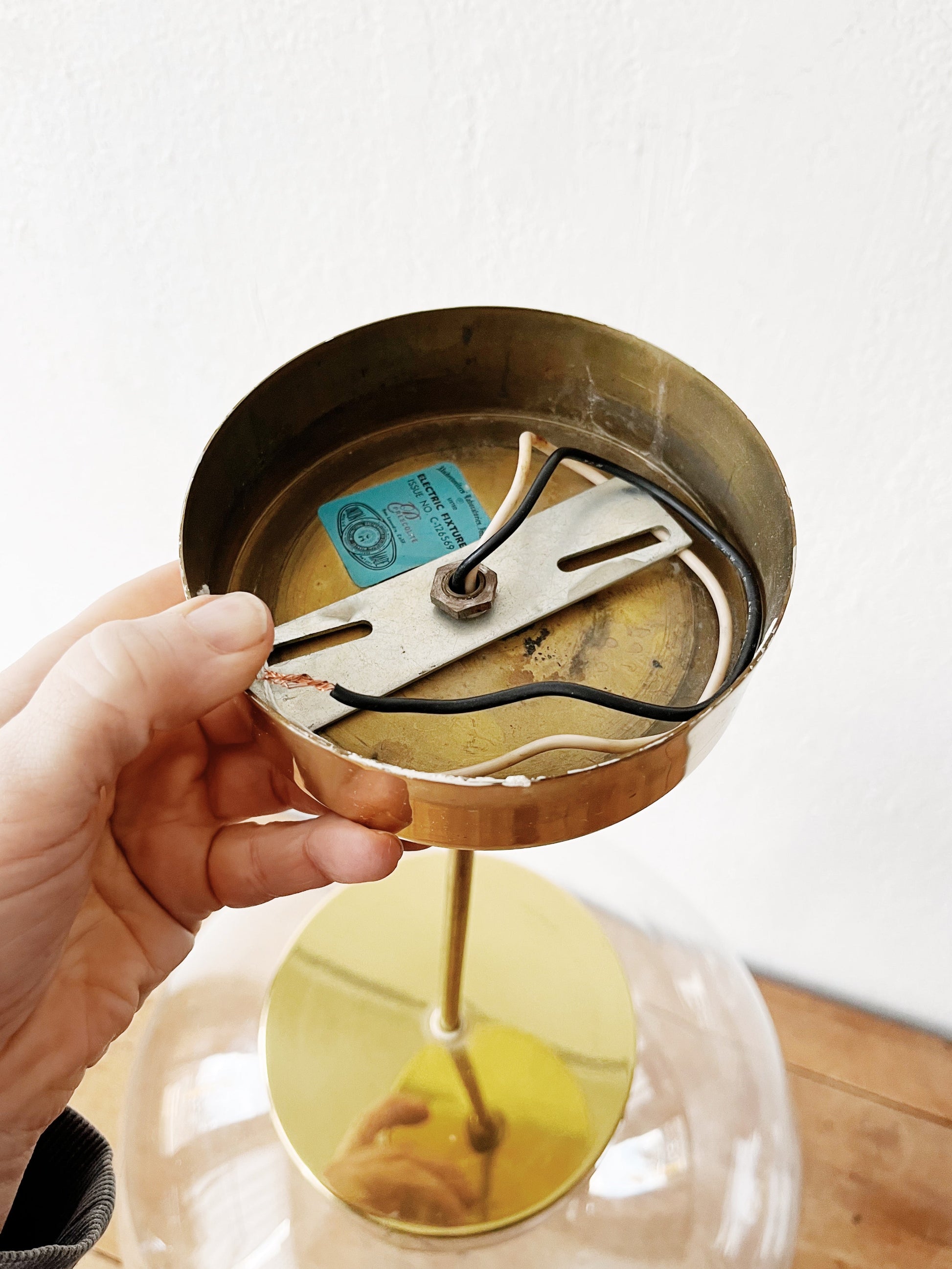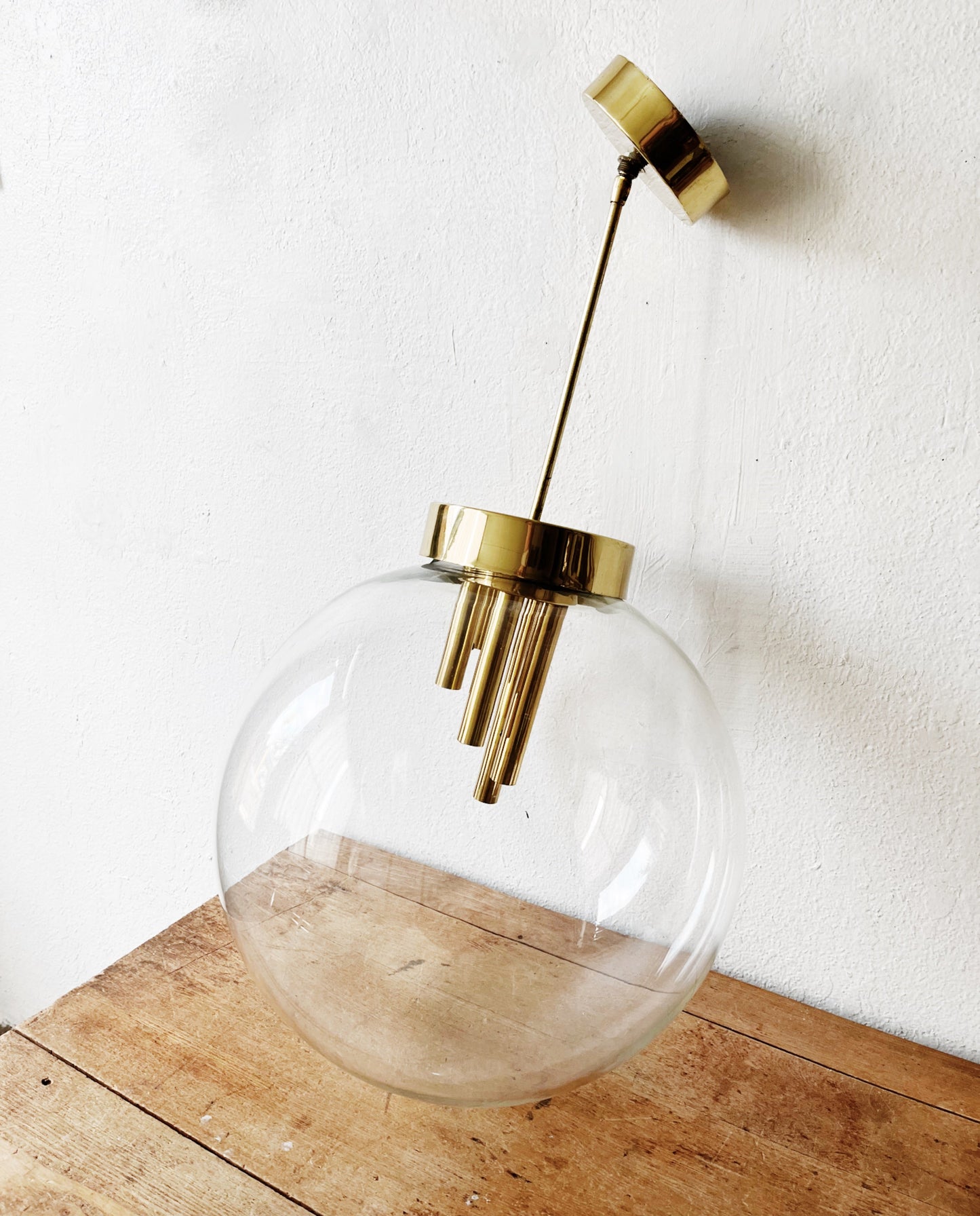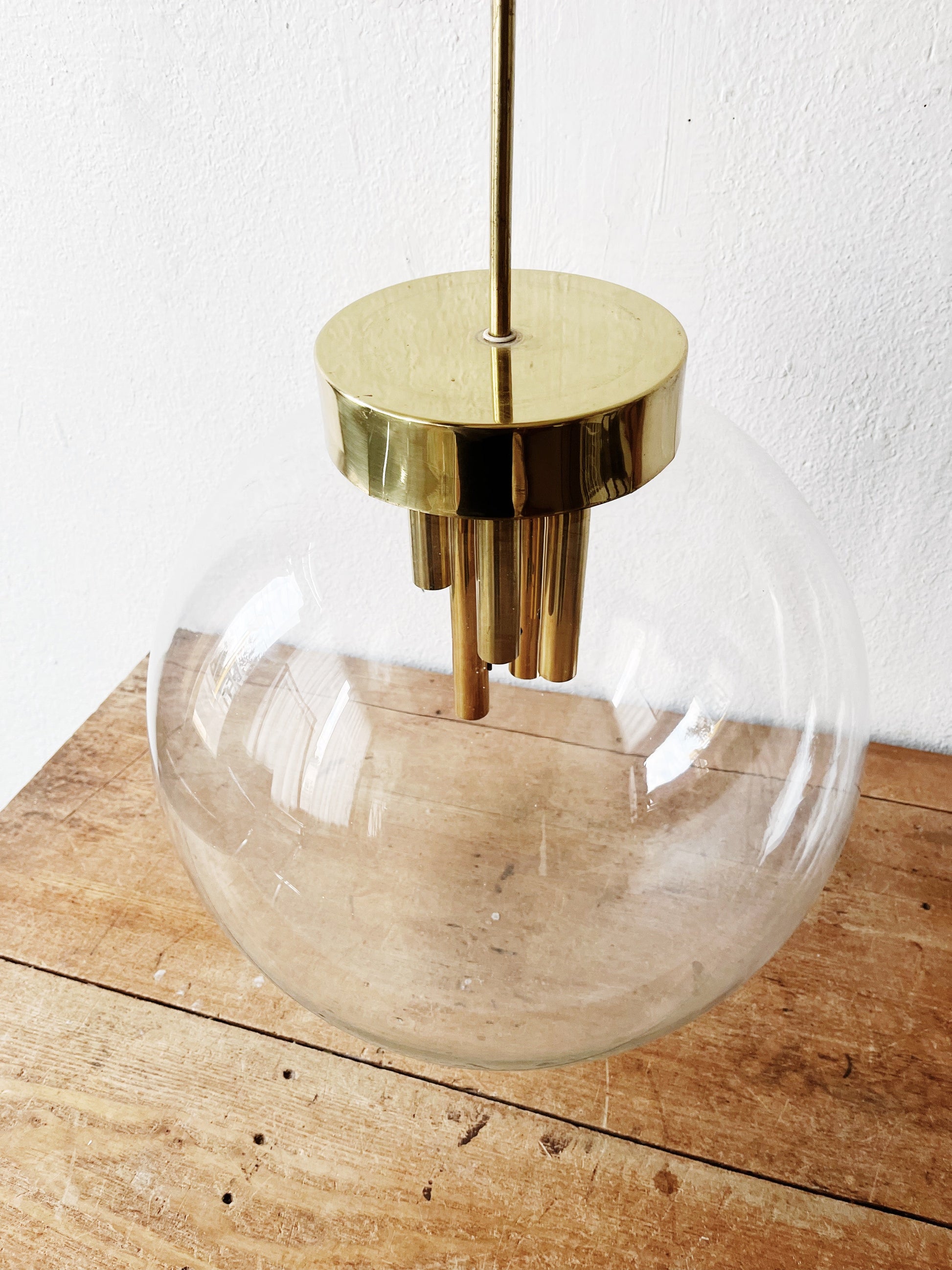 Stunning giant pendant light from the mid century. Blown glass globe hangs from a goldtone fixture. The stem holds multiple candelabra base bulbs. Very large and weighty. Definitely a statement piece above a dining table or in an entry hall. Original wiring looks in great condition. Some wear to the collar but it will be up high so you’ll hardly notice. In great condition otherwise.