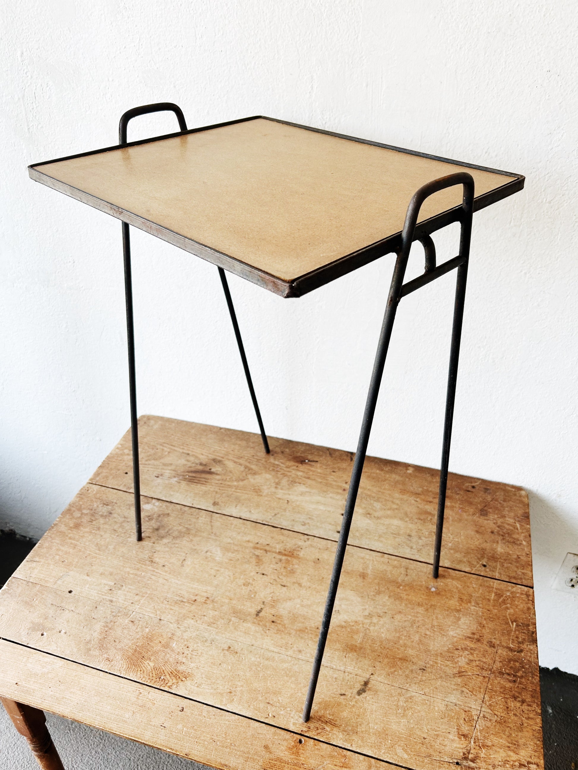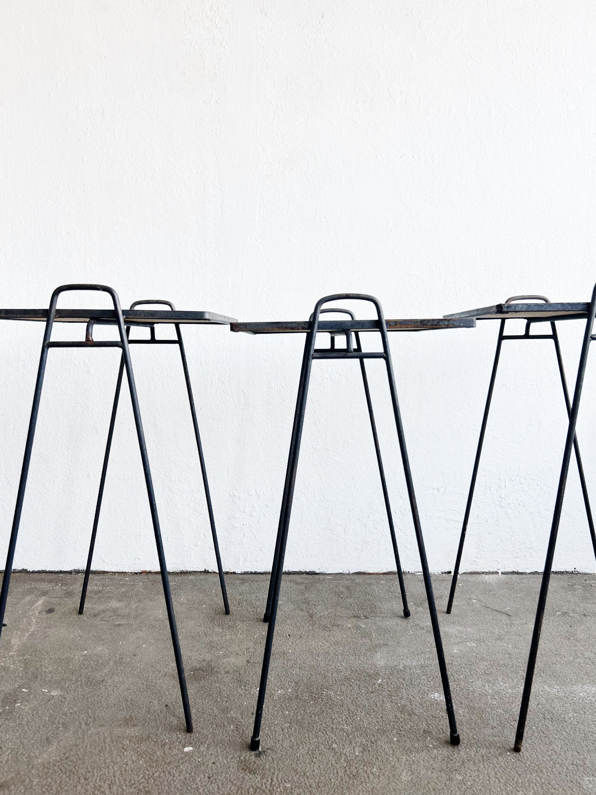Nice set of mid century stacking tables. Slim iron hairpin legs, clean fiberboard surfaces. Nicely portable for use indoors or out (protect tops from liquid)