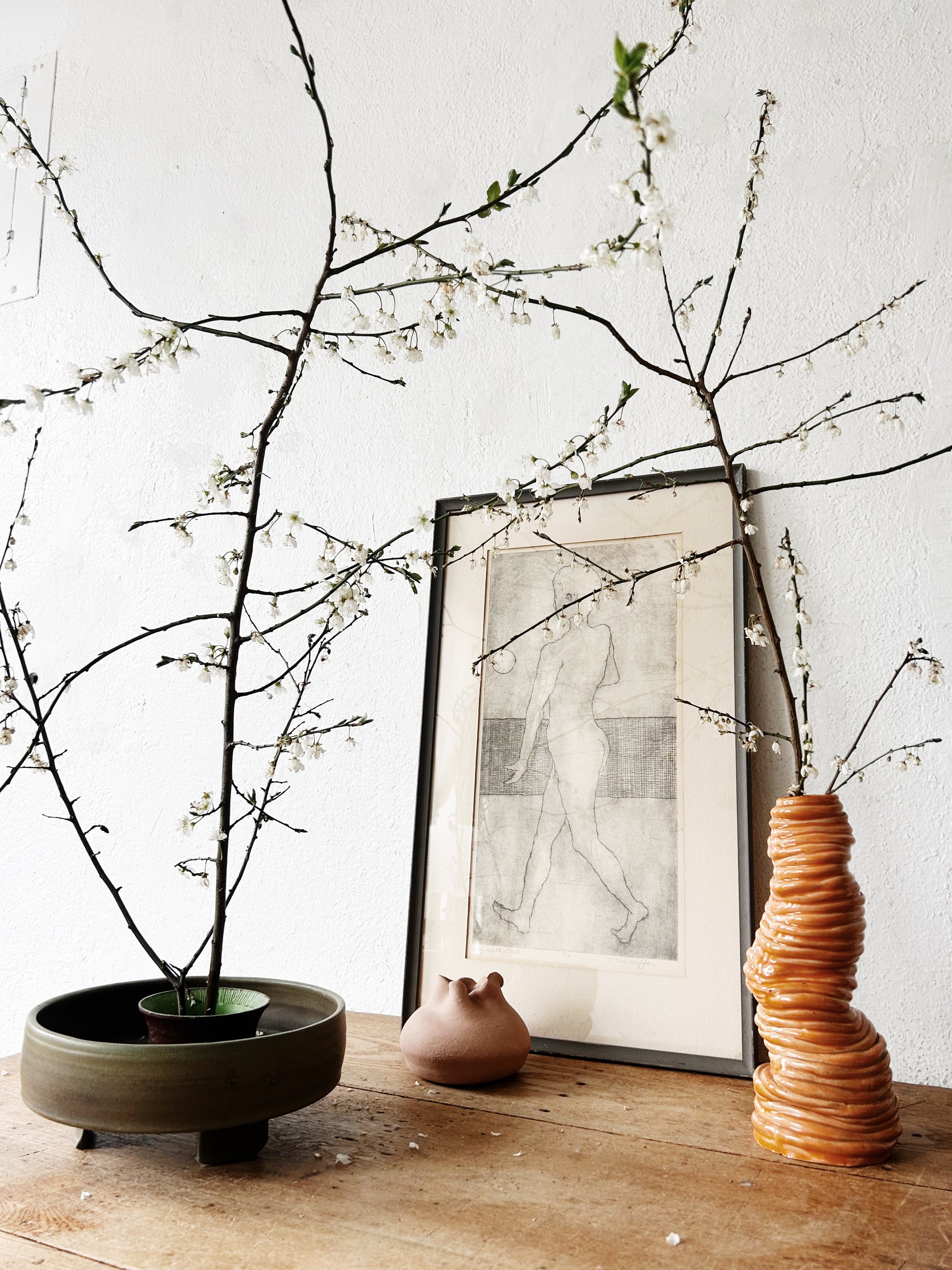 Beautiful mid century ikebana pottery vessel. Dark mossy green flat glaze, excellent condition. Will include flower frog as shown.