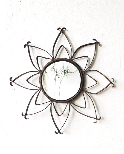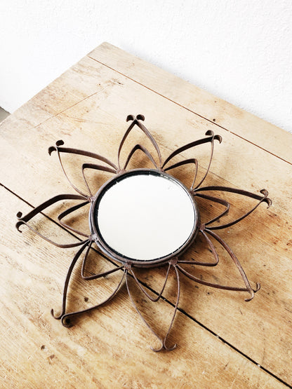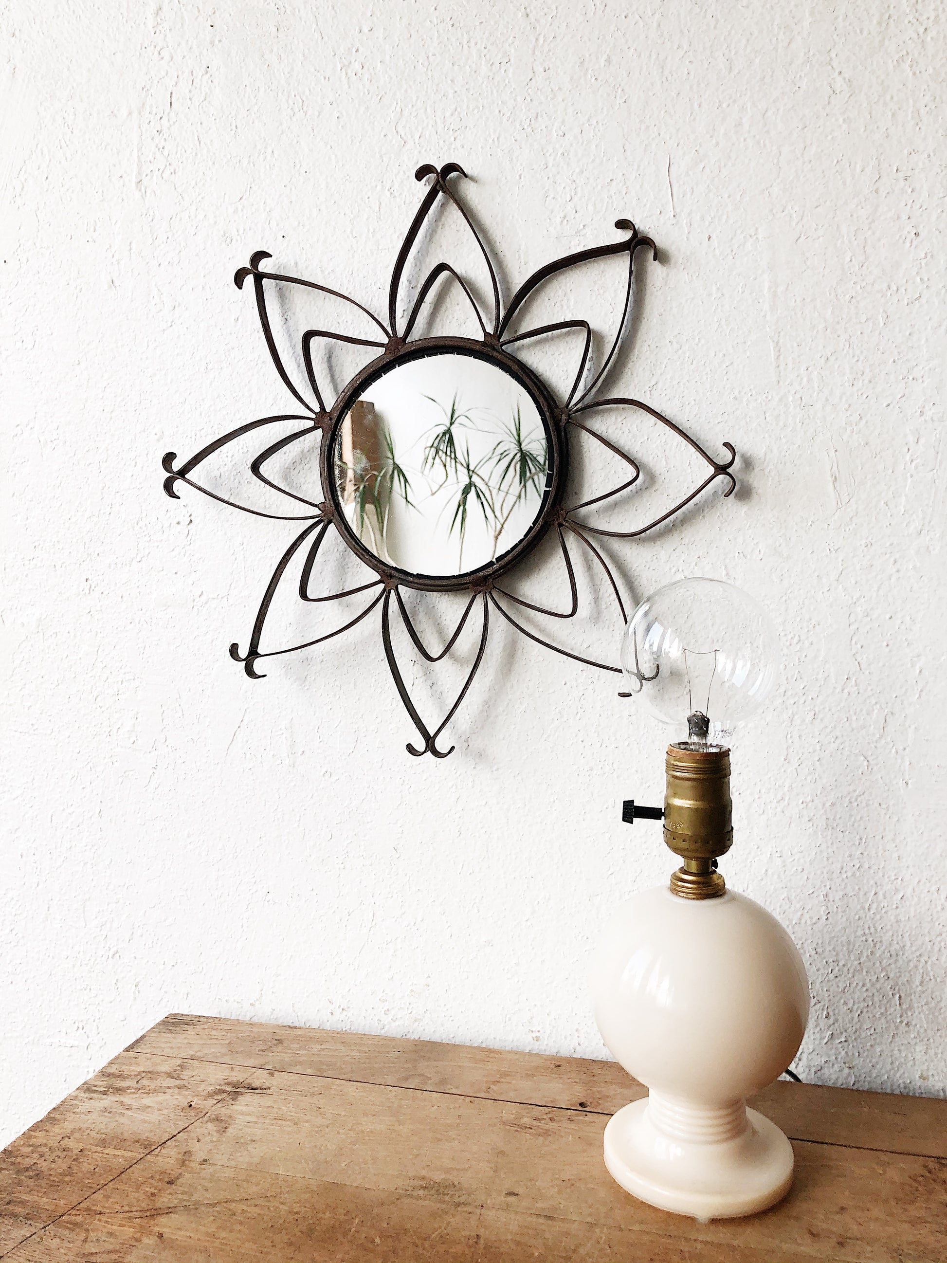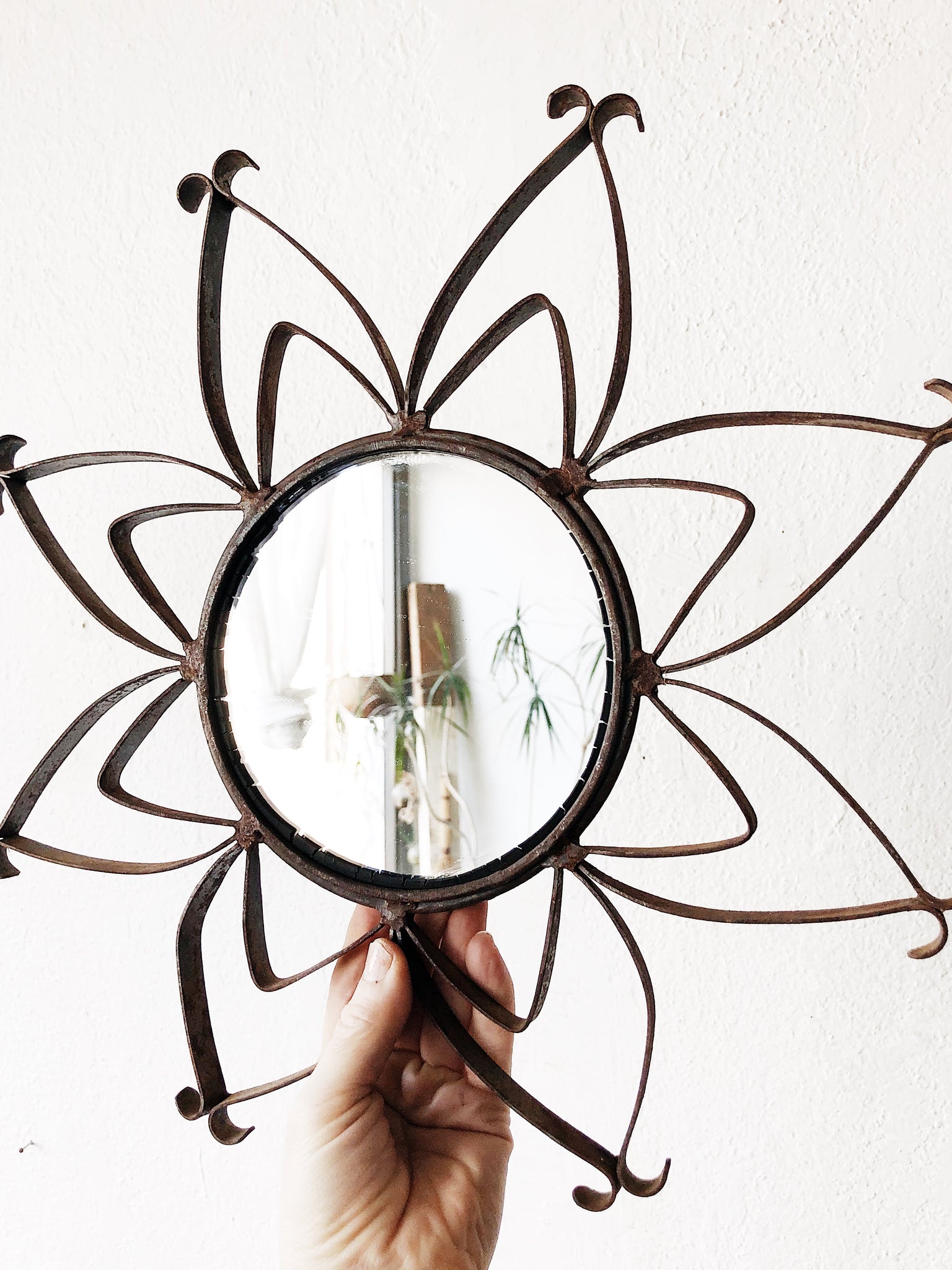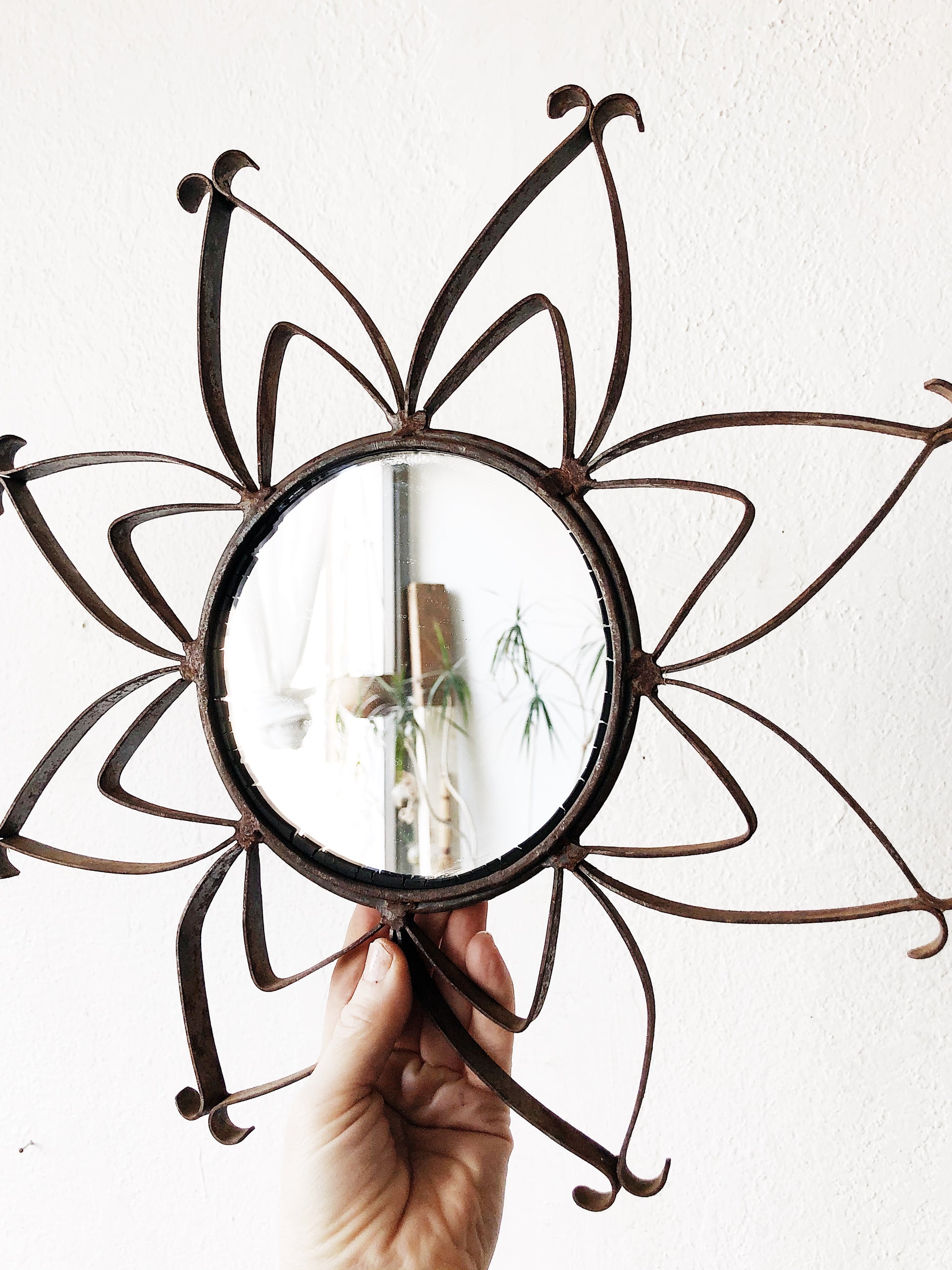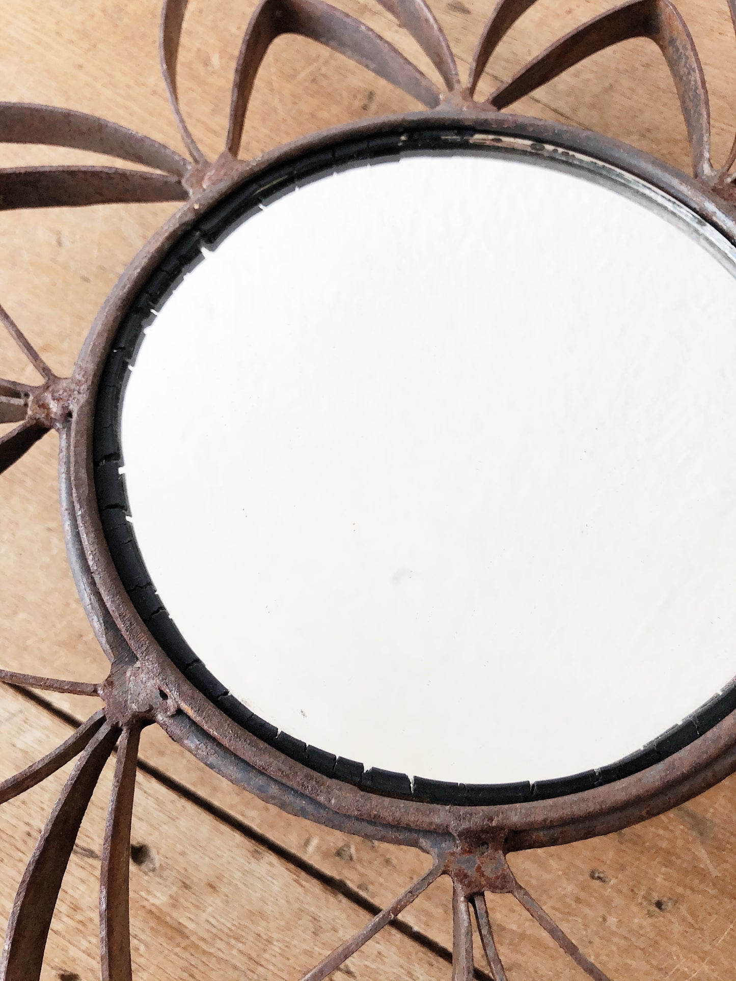 Fab sunburst look to this mid century mirror. Black iron is weathered just right. Mirror is clear. Some wear to the inner rubber mount as pictured but doesn’t detract