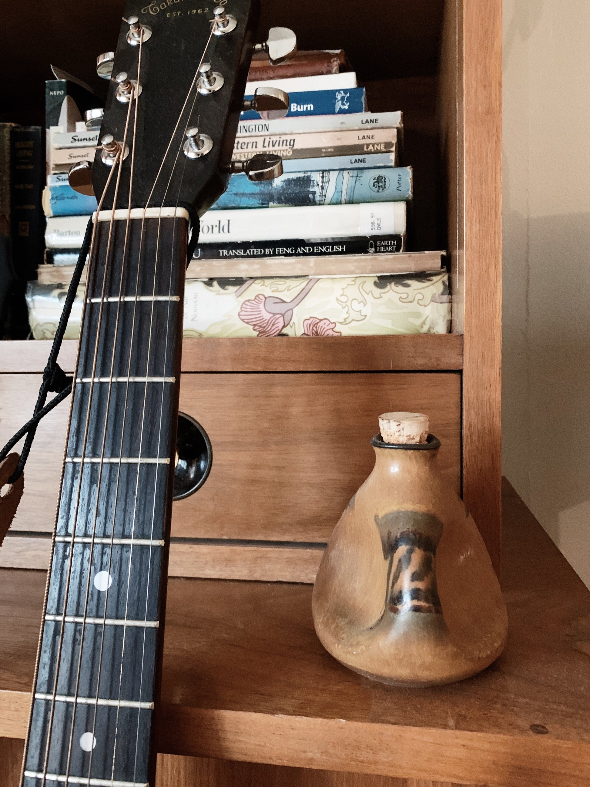 Wonderful mid century pinch pot vessel by Kamini. Cork stopper. Kamini means kiln in Greek.