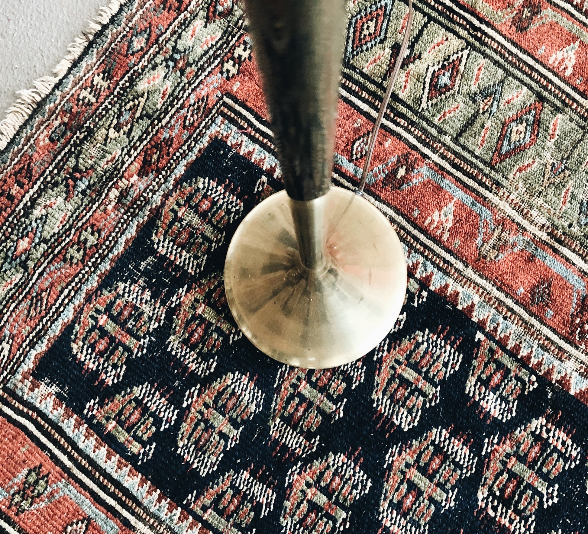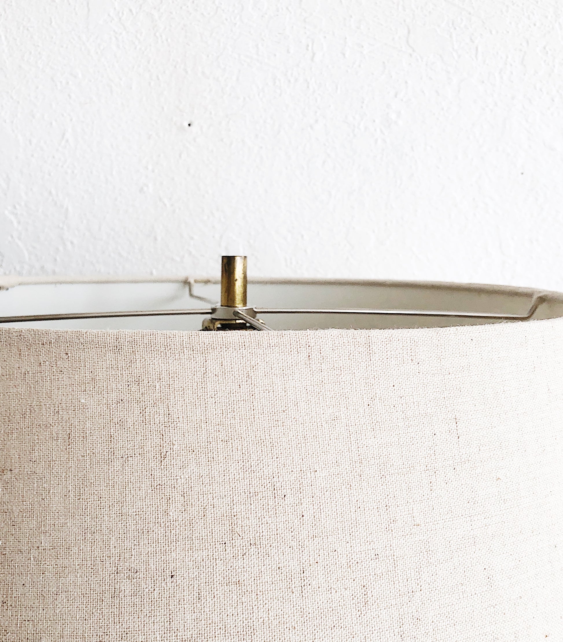 A nice brass floor lamp from the mid century. Great tulip base. Harp with heavy duty brass modern finial. Comes with a linen shade. The lamp stands a tad shorter than a typical floor lamp so that it can easily be turned on and off from a reading chair