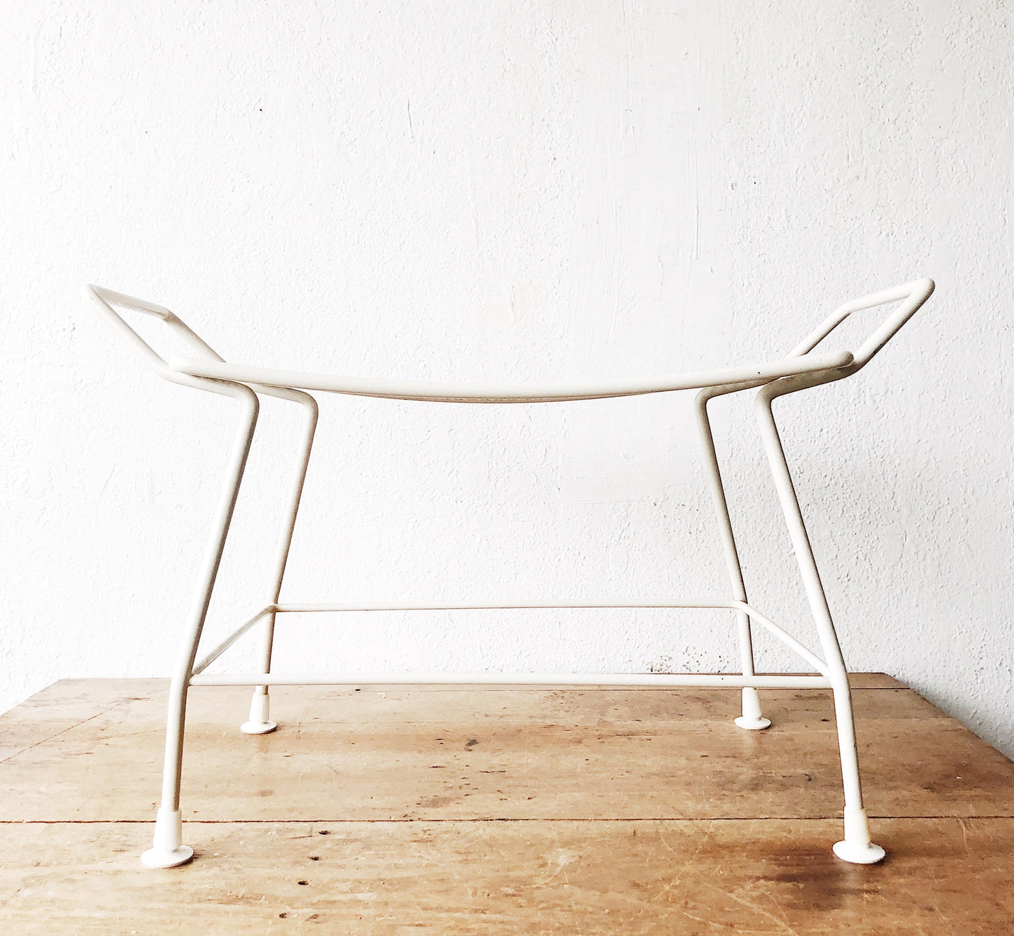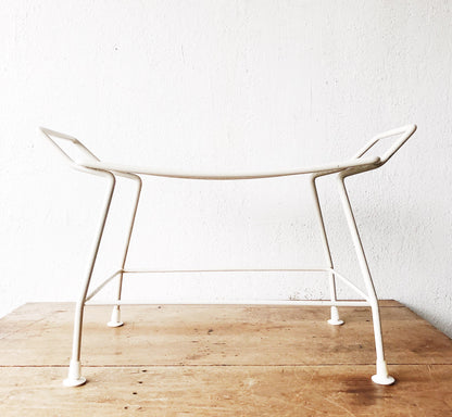 Great lookin stool or small bench from the mid century. Enamel over metal. Great bowed mesh seat and arched legs. Handles.