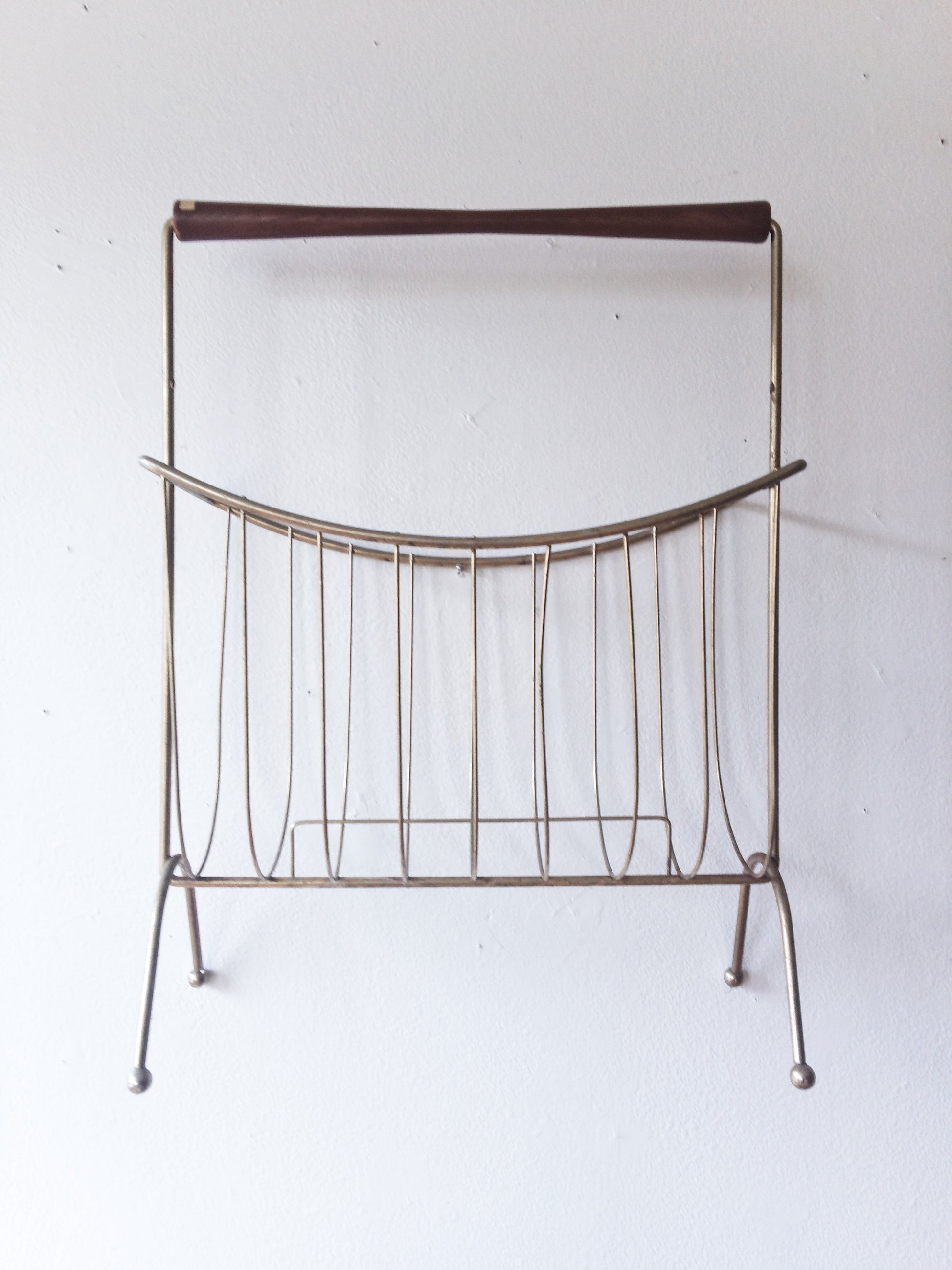 An extra nice mid century metal rack with wood handle. Love the ball feet and middle spacer details.