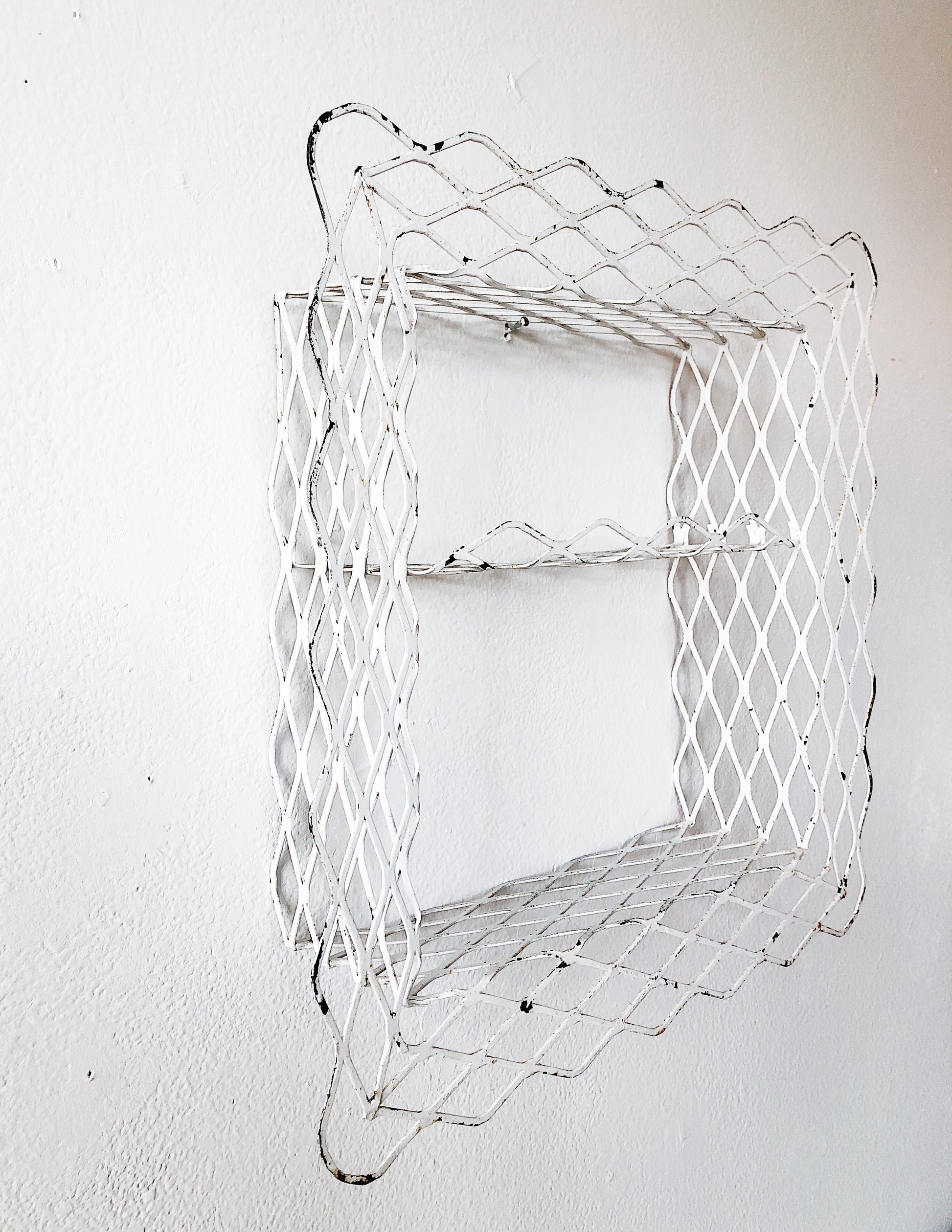 Perfect little shelf for your bathroom! Great mid century design with chippy white paint. Has three shelves.