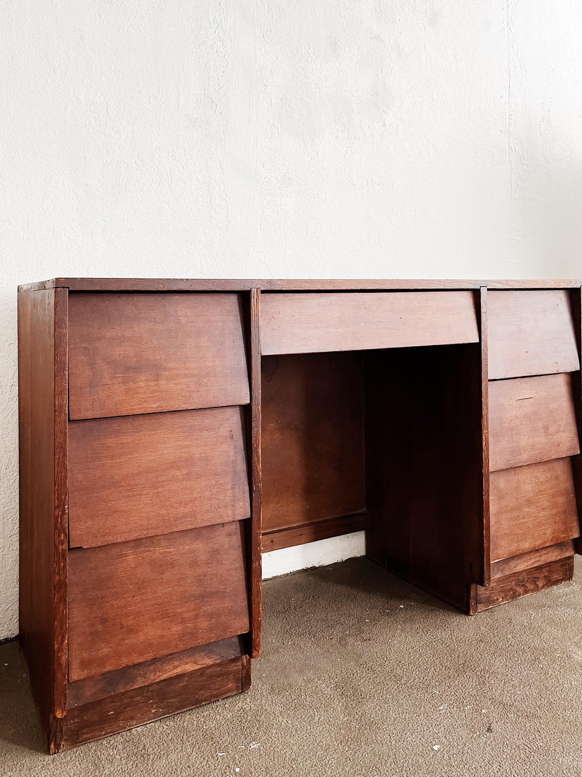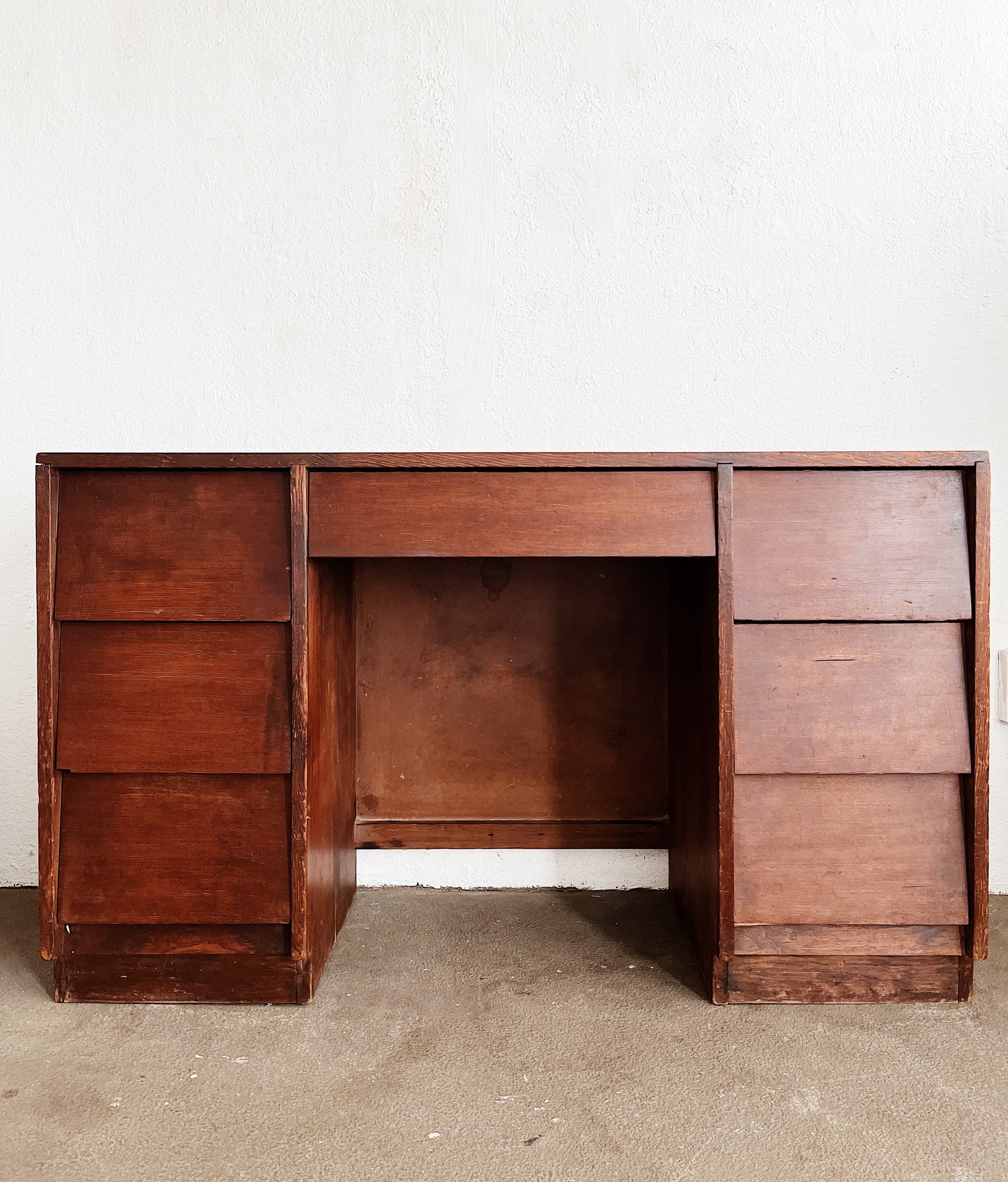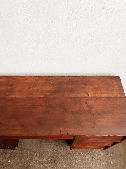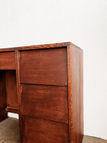 Handmade Mid Century modern desk. Hardwood. Sturdy and solid. Inset tiered drawers slide very easily. Stamped with the Weyerhauser name to signify it was made with their wood. Surface has been lovingly restored and waxed, and although it still shows some wear, exhibits the earthy natural look we love in mid century styles. Right out of grandpas garage.