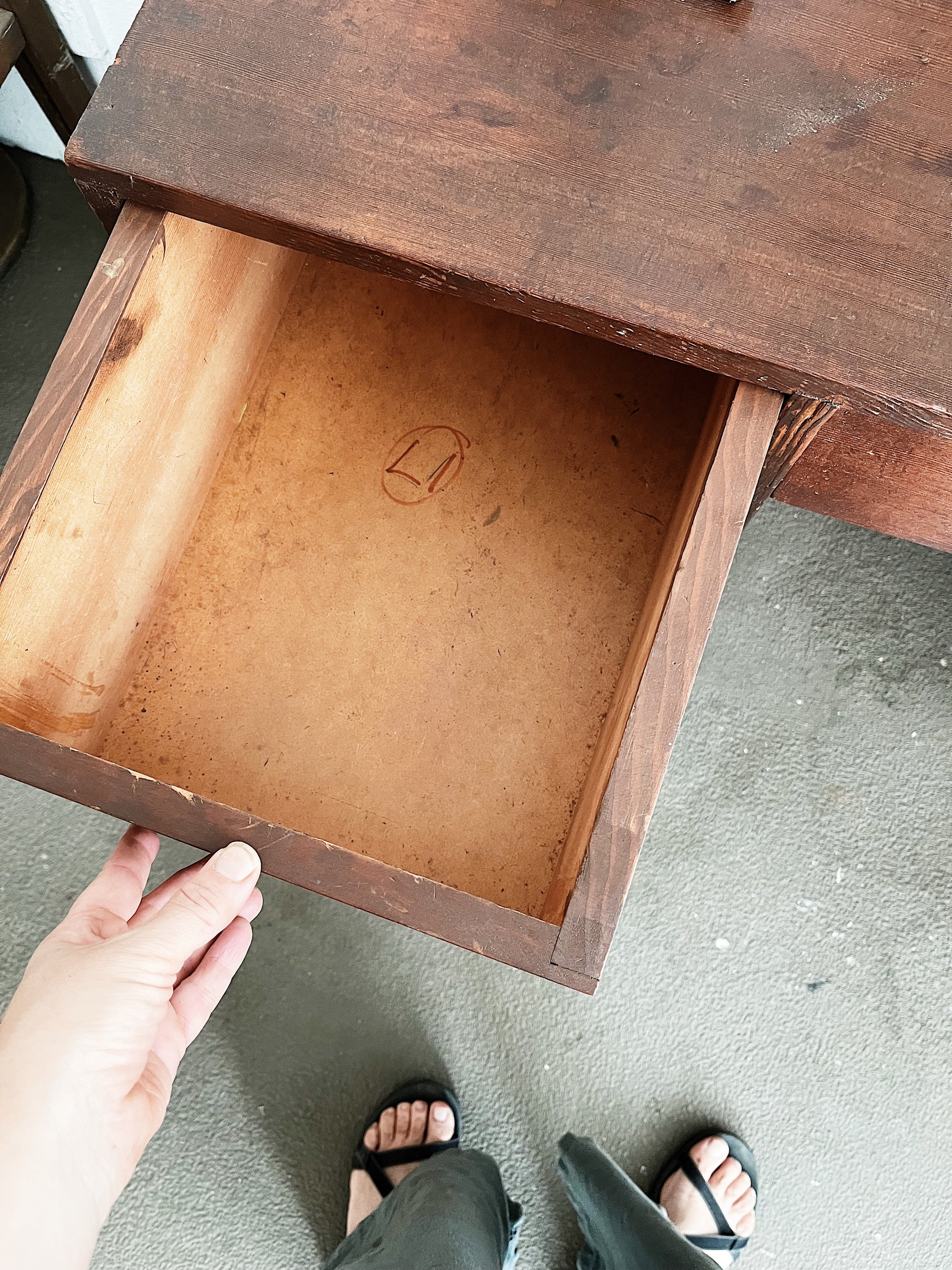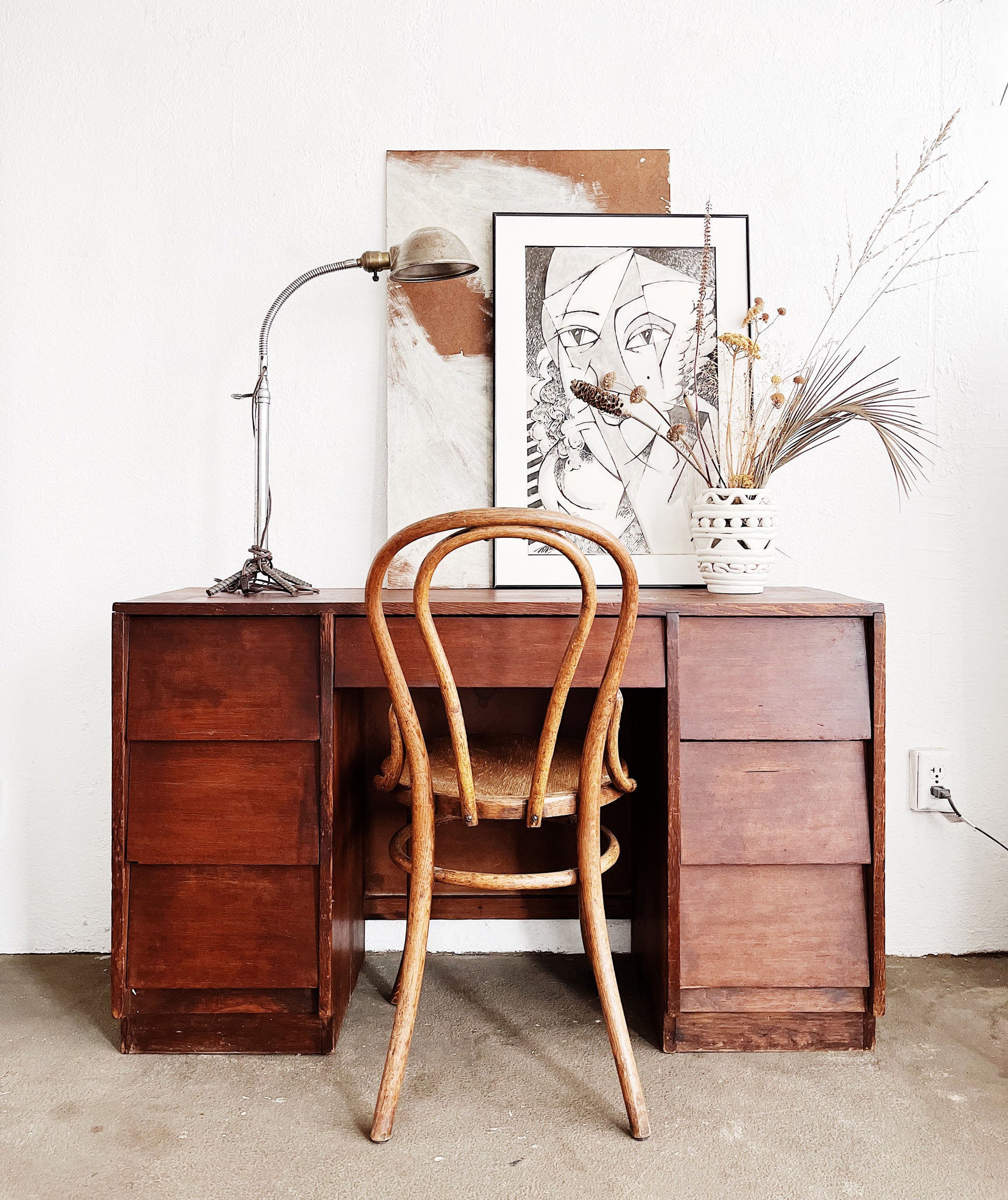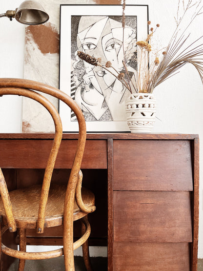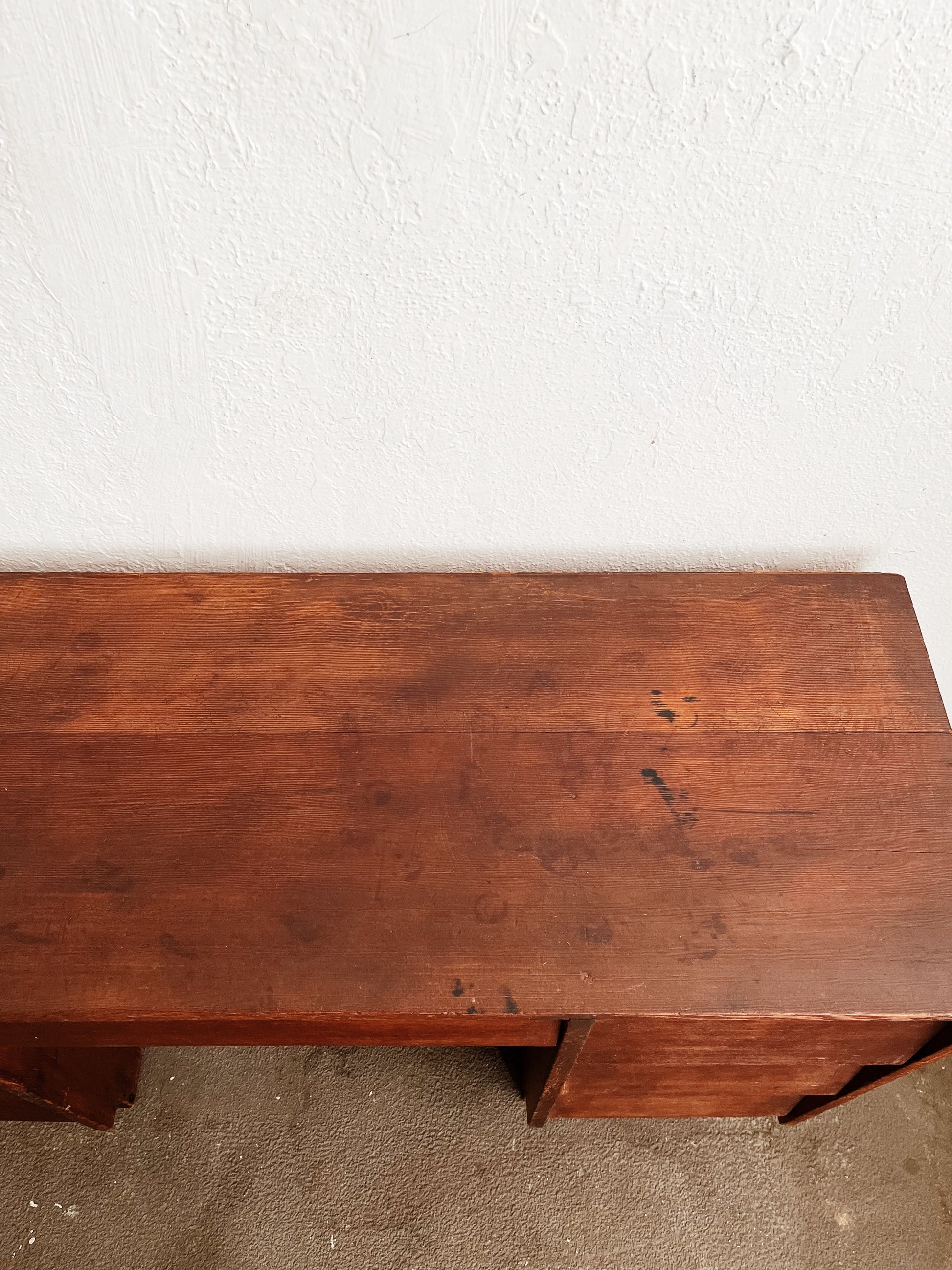 Handmade Mid Century modern desk. Hardwood. Sturdy and solid. Inset tiered drawers slide very easily. Stamped with the Weyerhauser name to signify it was made with their wood. Surface has been lovingly restored and waxed, and although it still shows some wear, exhibits the earthy natural look we love in mid century styles. Right out of grandpas garage.