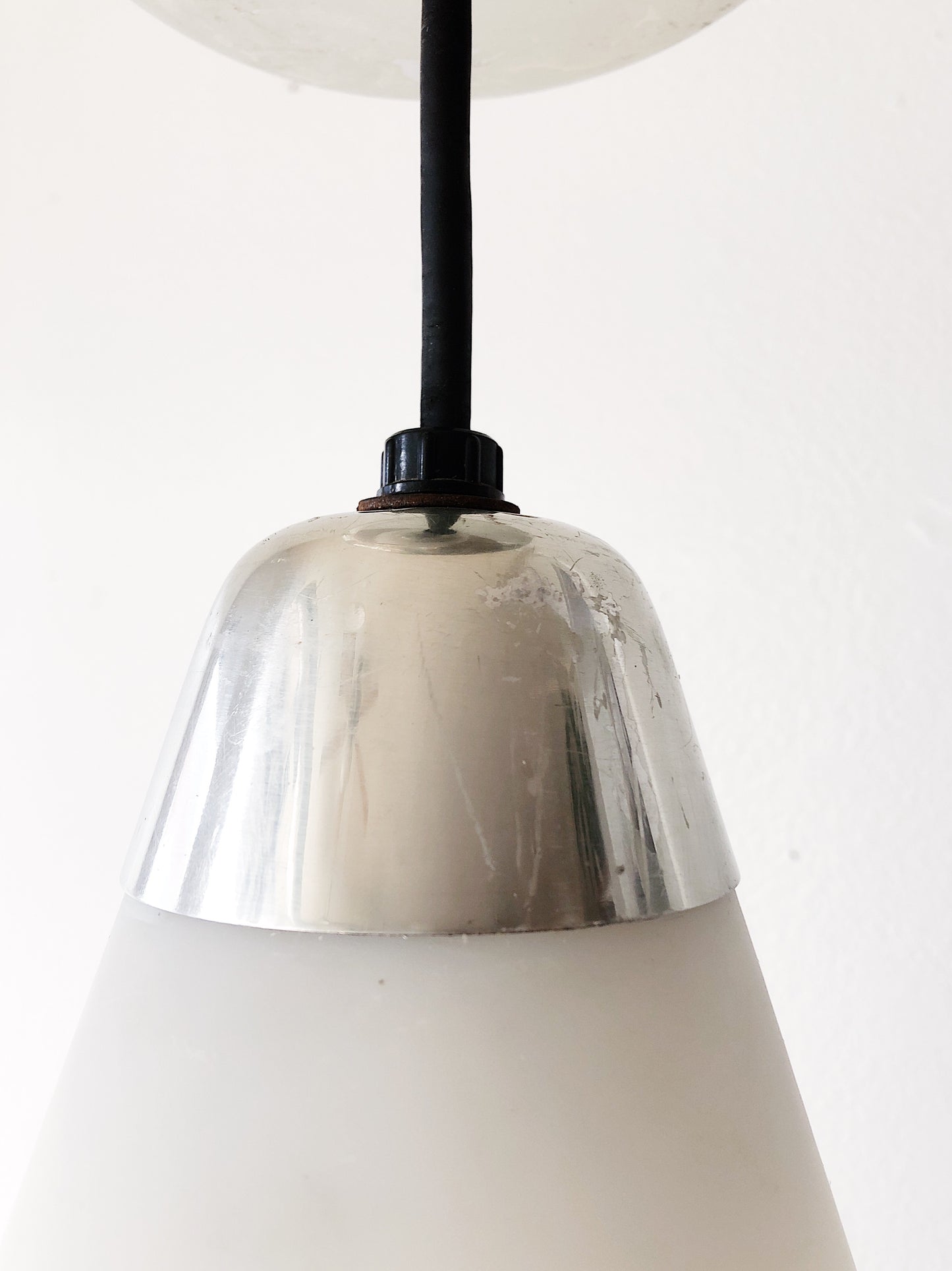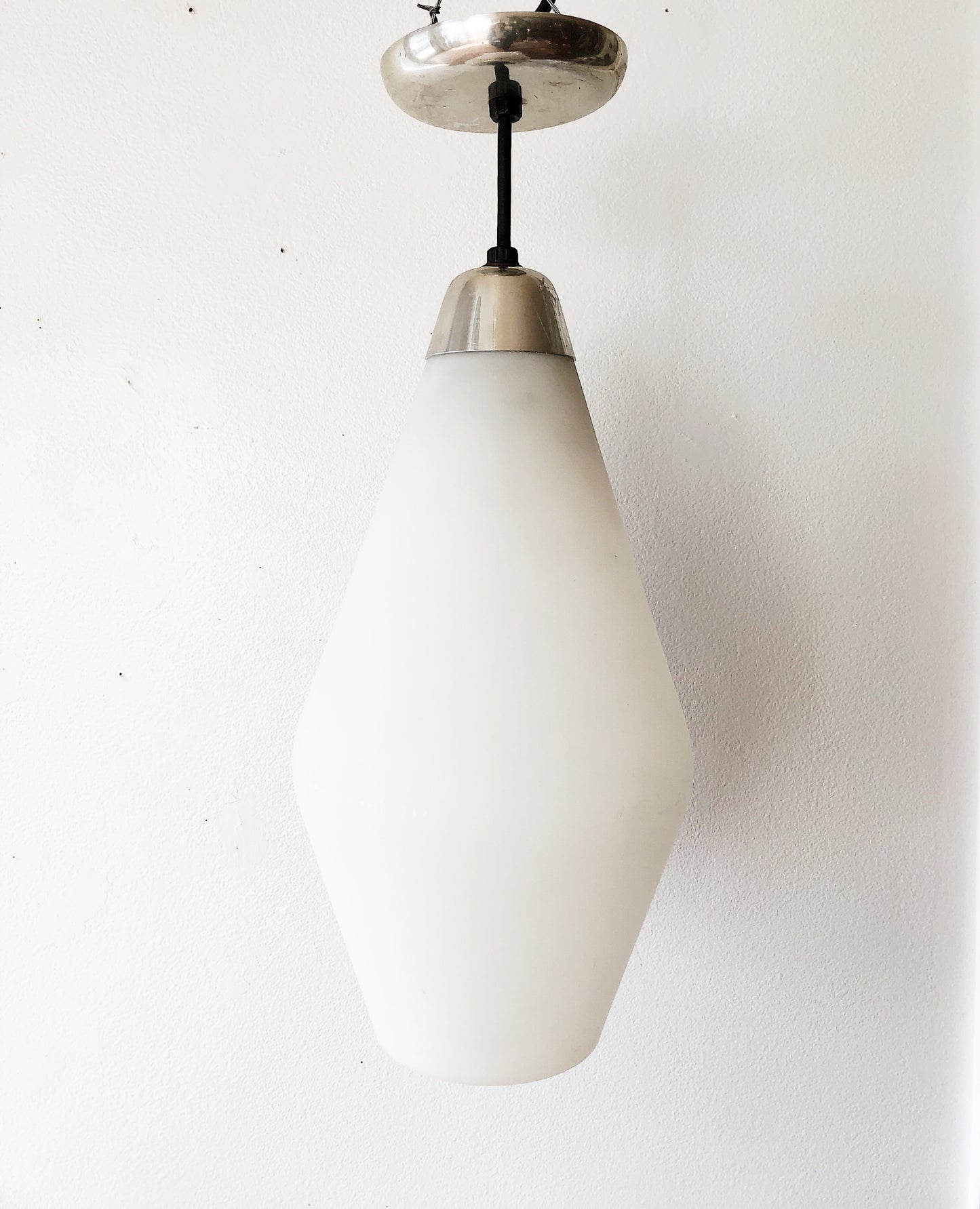 Vintage Mid century opaque glass bullet pendant light. Larger in size! Chrome accent and ceiling plate. Not in perfect condition but we don’t believe the flaws take away.