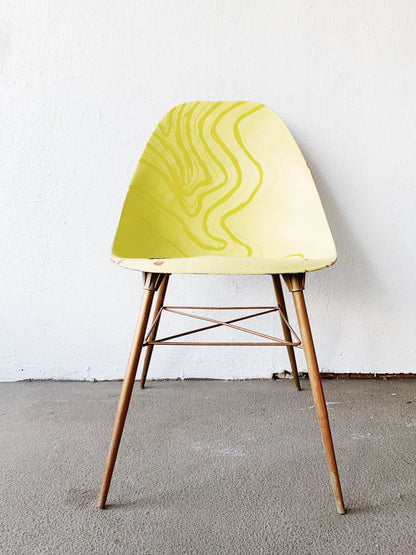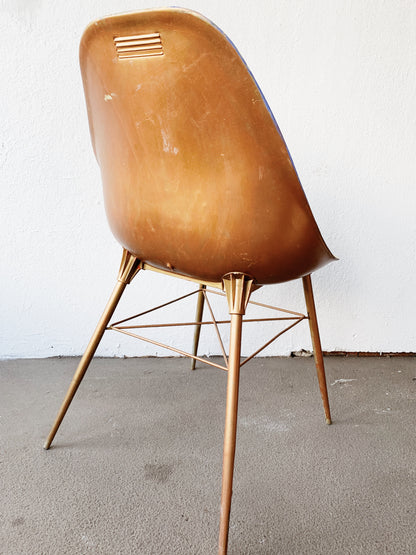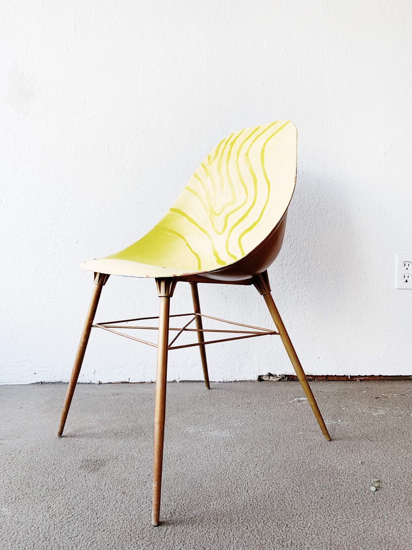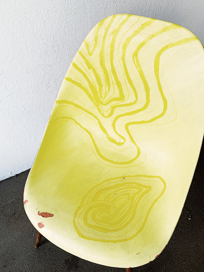 Cool molded plastic mid century painted art chair. Comfy and stable sit, some of the yellow paint is chippy to reveal red underneath. Base and back are painted copper