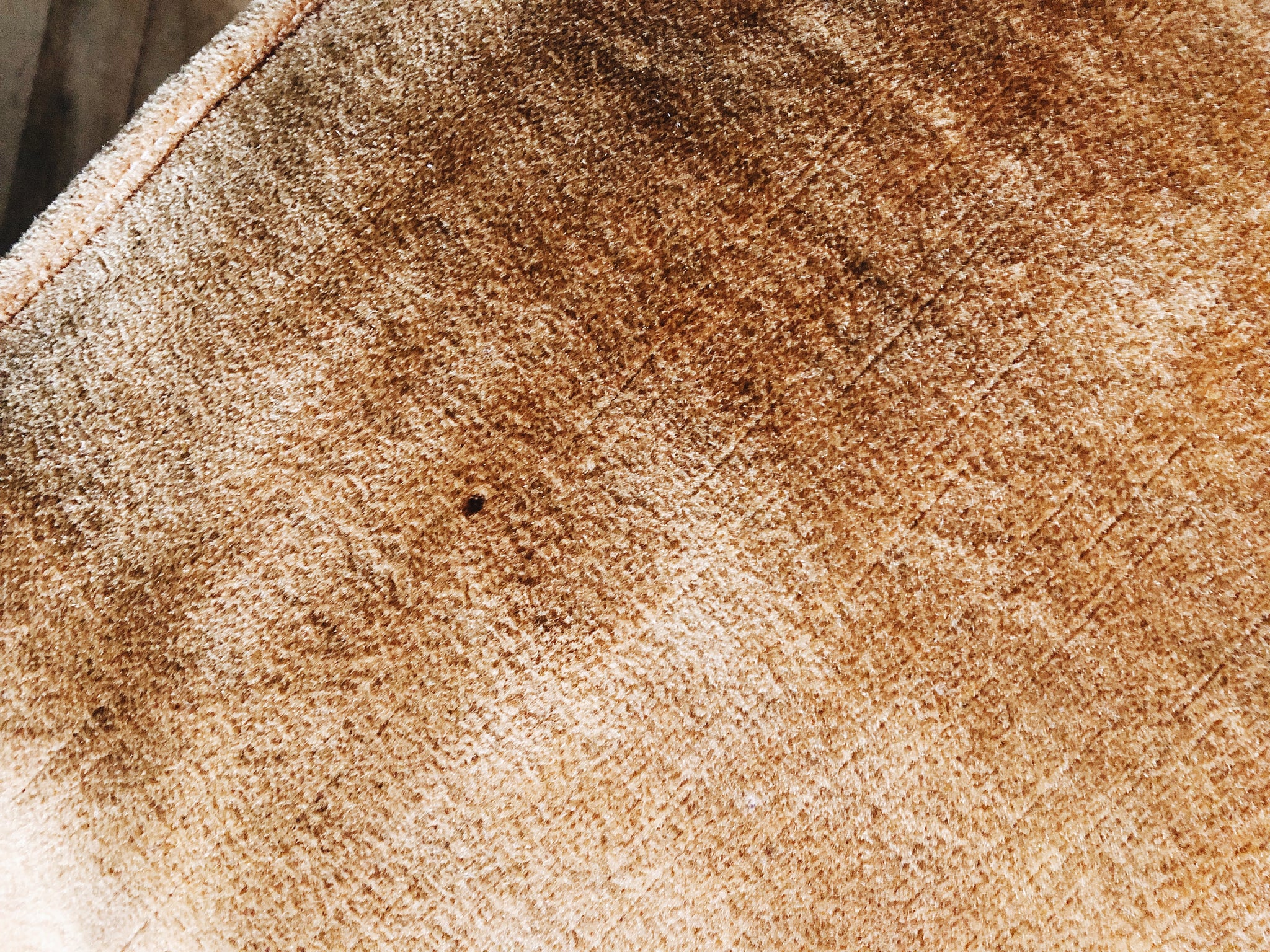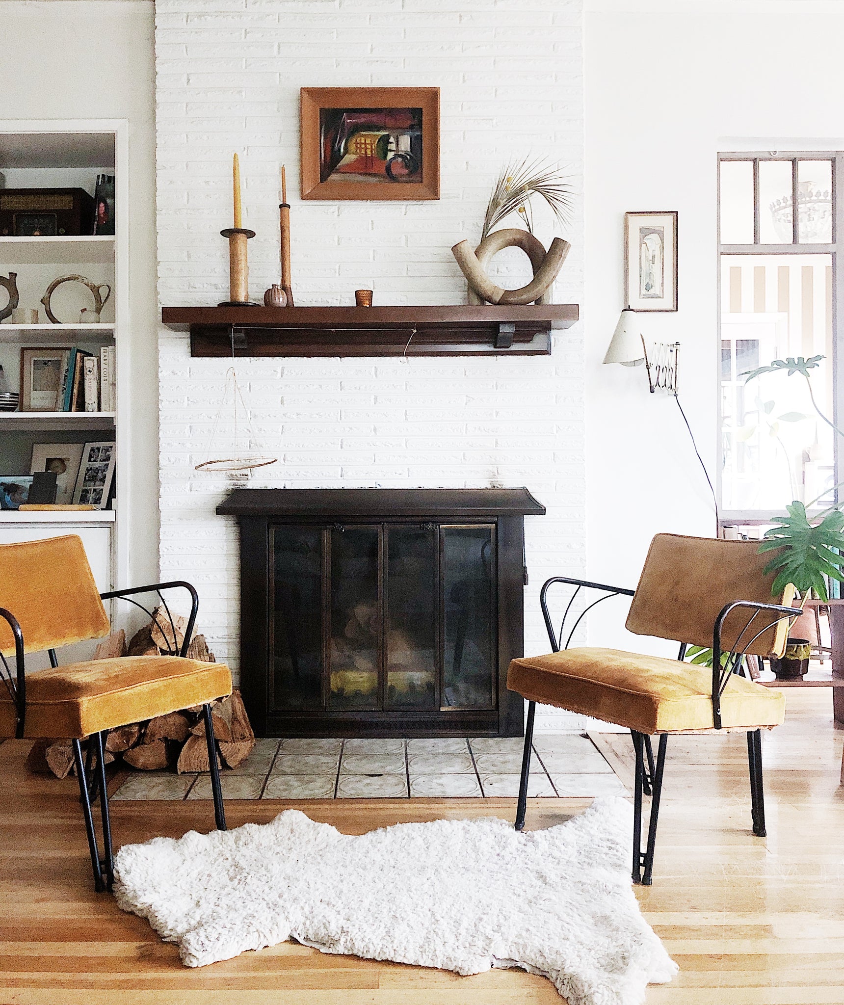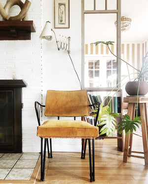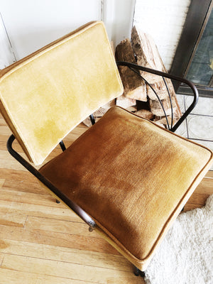 This color! The shape! Such a perfect seat. Metal frame with cotton velour covers in a mustardy ochre color. Small footprint with nice support.