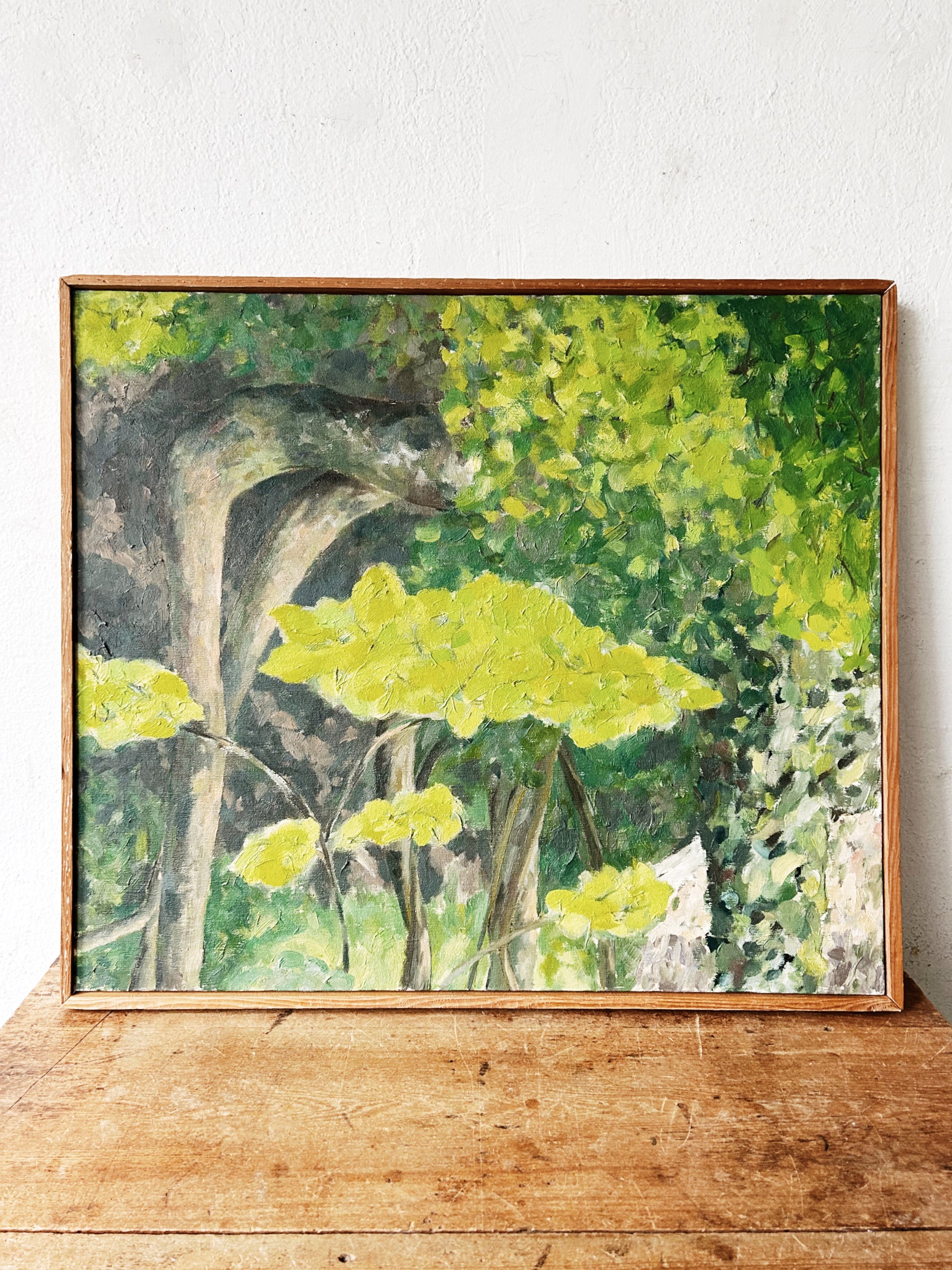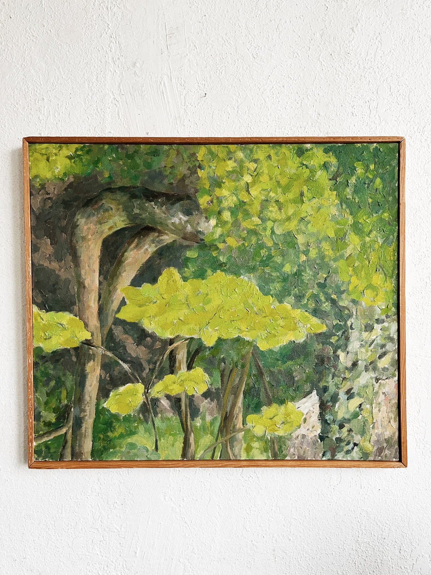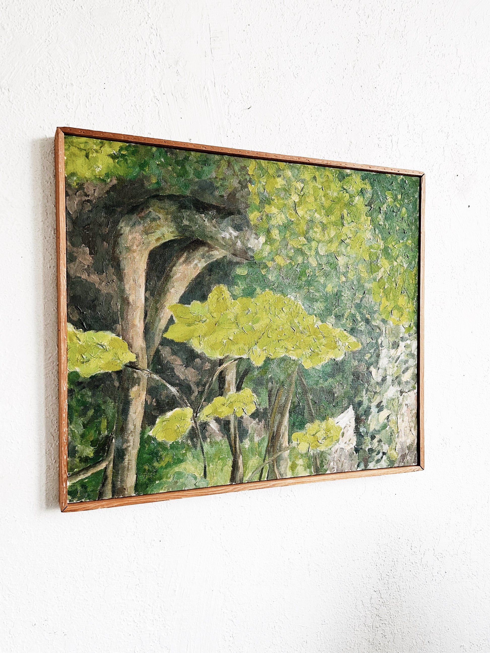 Beautiful original mid century dense oil forestscape painting framed in natural wood. Love the golden leaves and touches of terra cotta. So uplifting and well done. Unsigned.