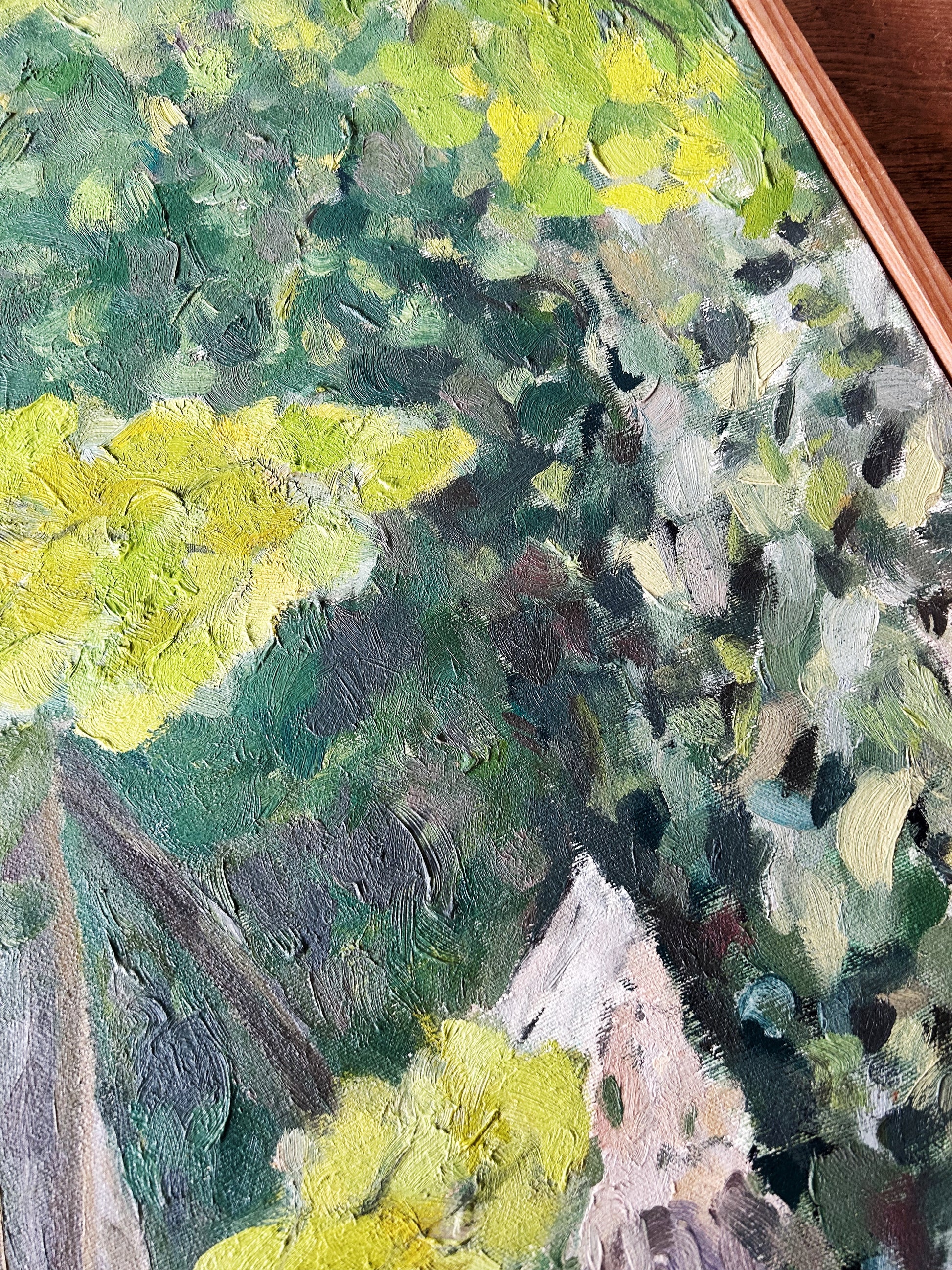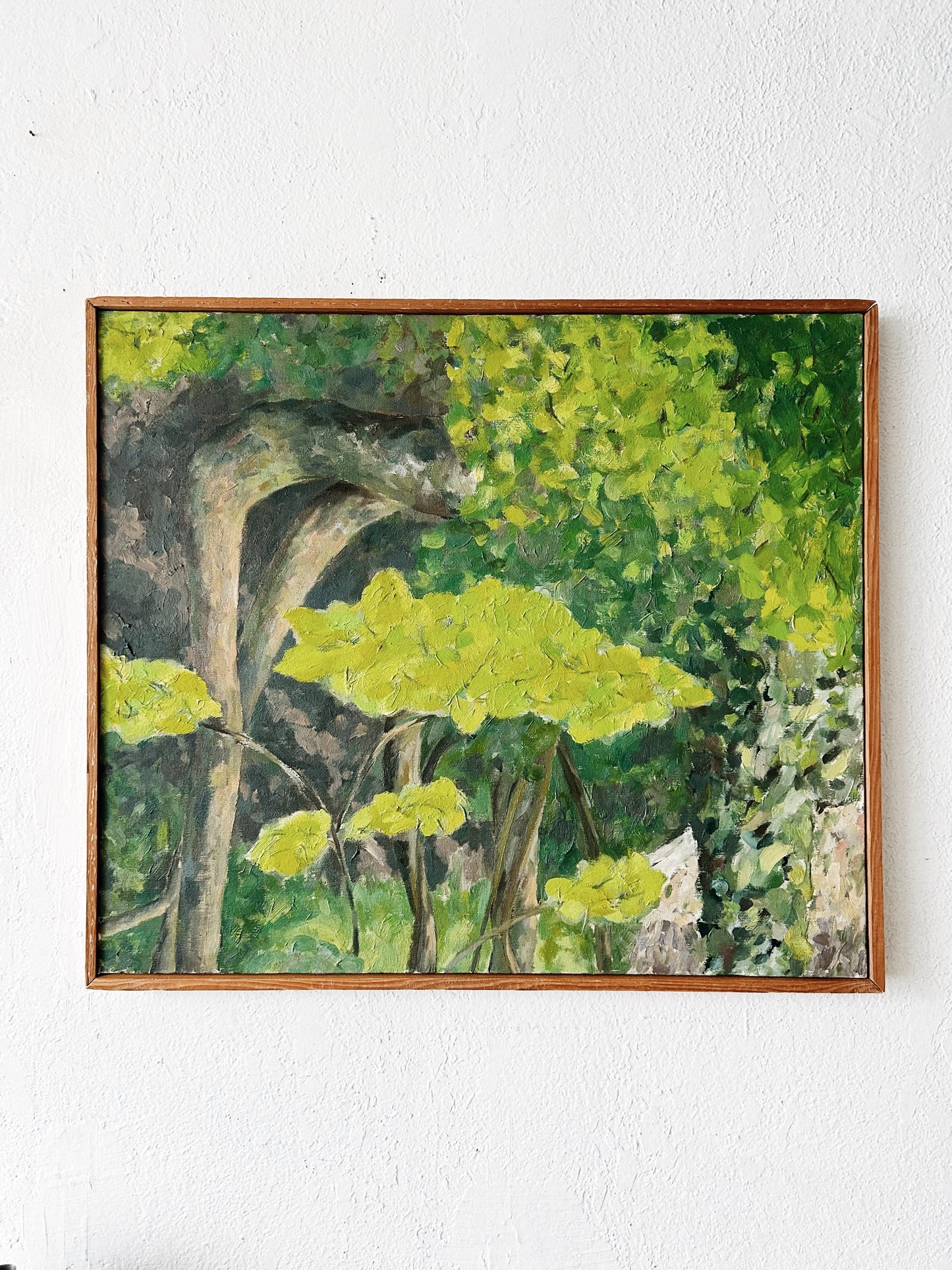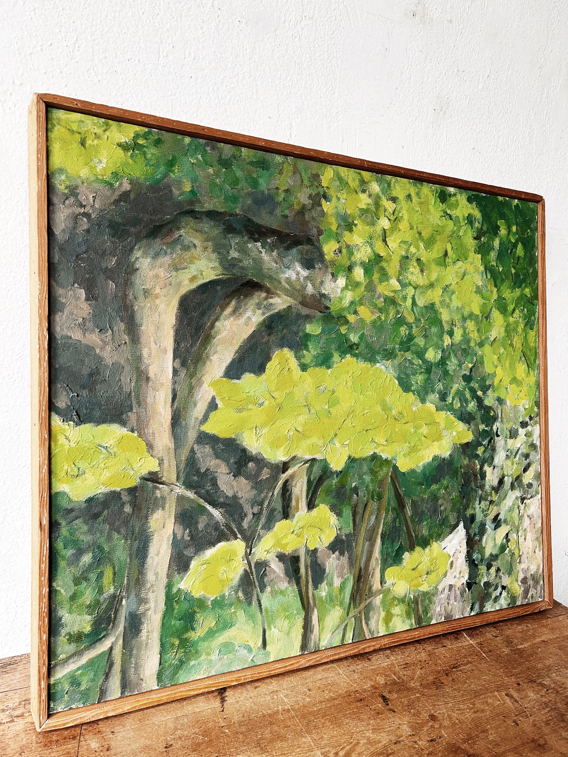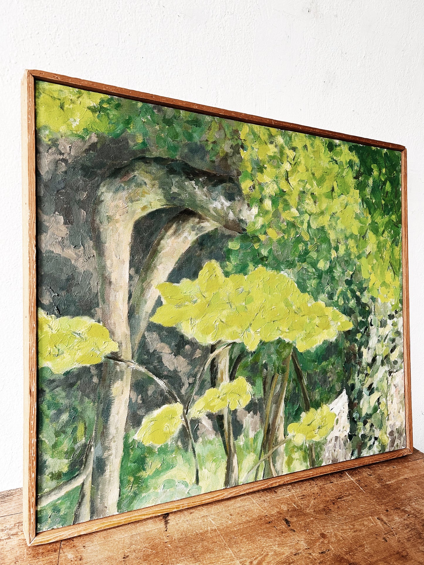 Beautiful original mid century dense oil forestscape painting framed in natural wood. Love the golden leaves and touches of terra cotta. So uplifting and well done. Unsigned.