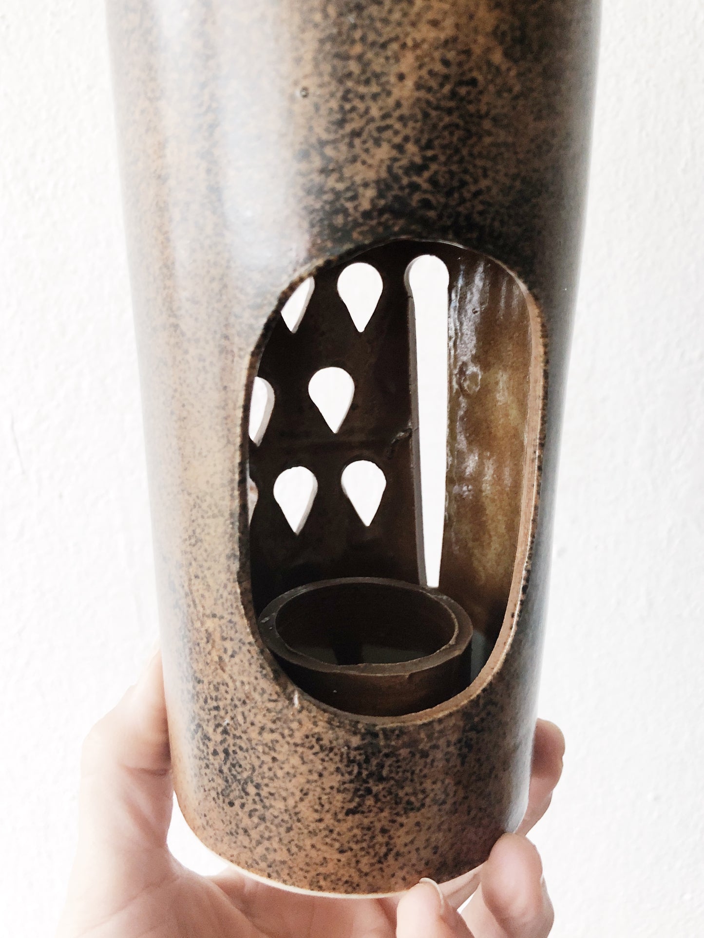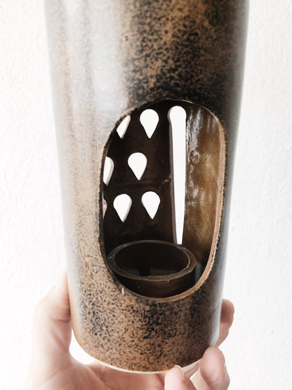 Beautifully made pottery piece from mid century japan. Hook at the top for hanging of you wish. Candle well inside. Such a great look