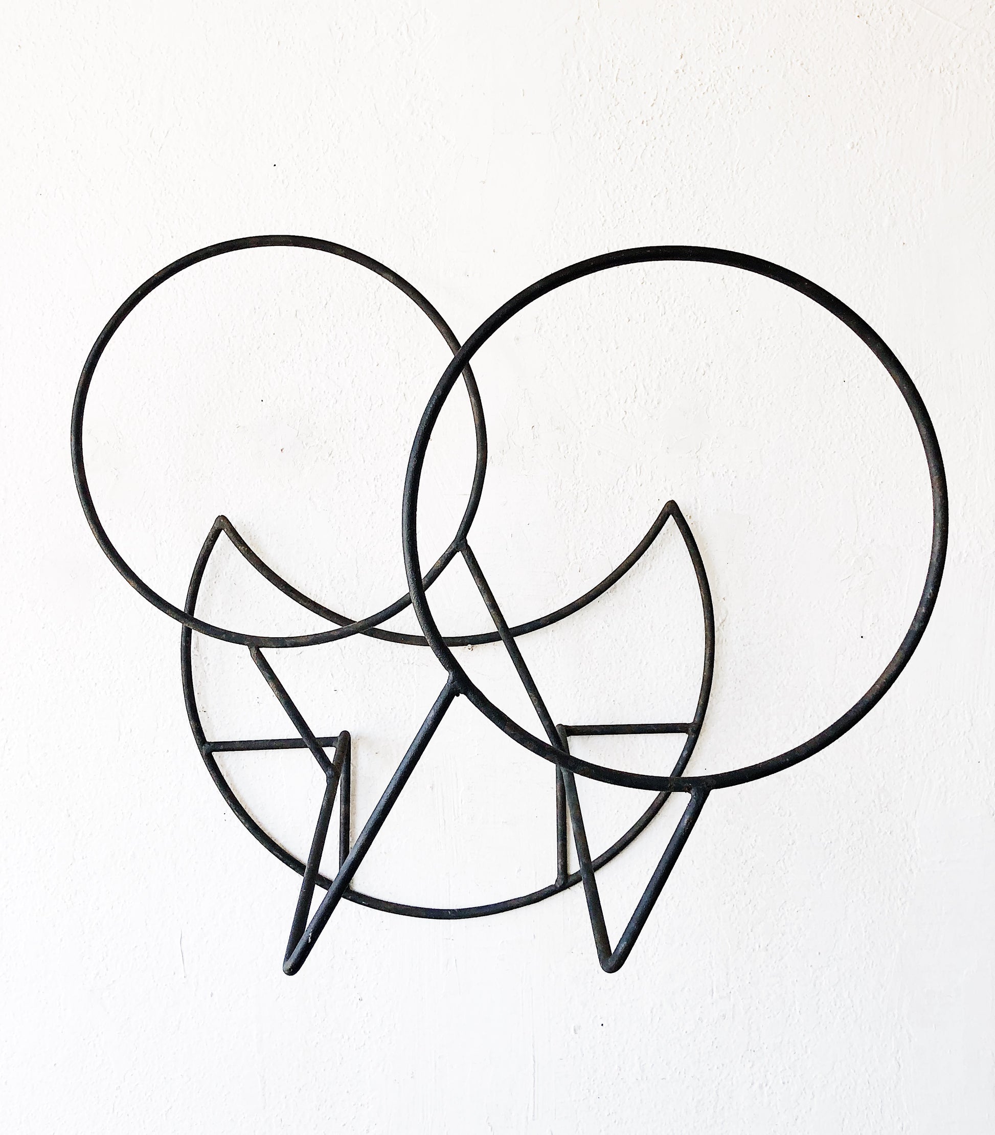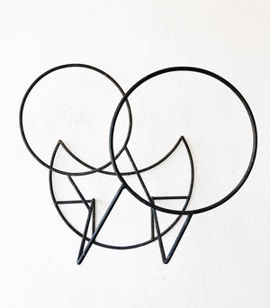 Unique low slung mid century plant stand. Double tier. Reminds us of suns and moons. Best with lighter weight pots and plants