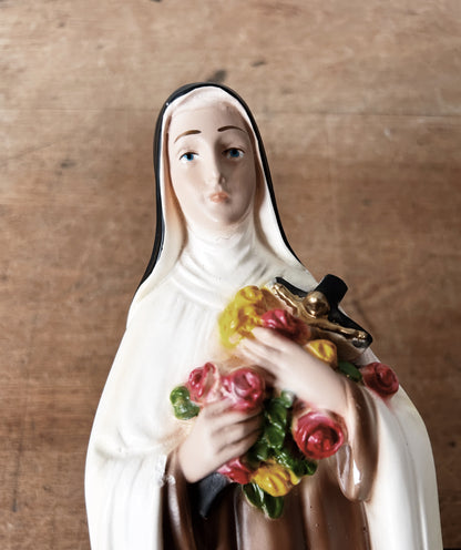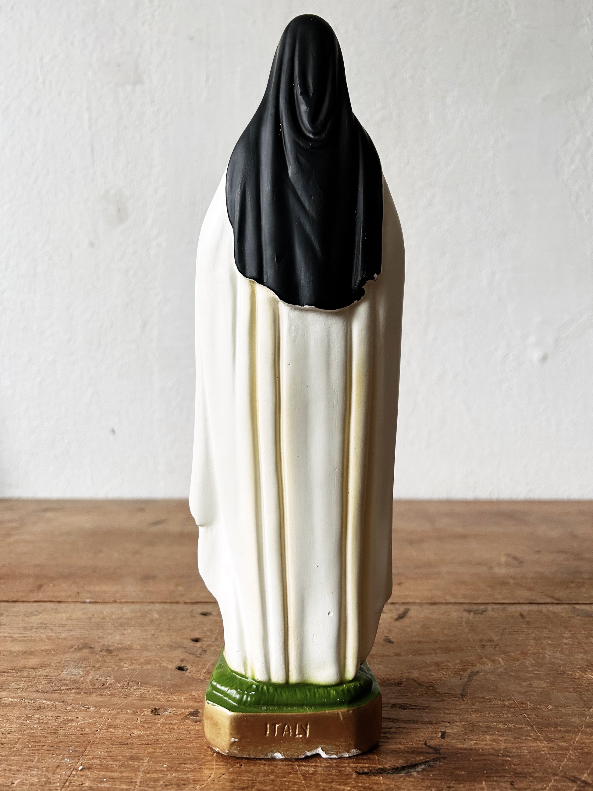 Hand painted plaster Mary from Italy. Love the primary colors on this one. A beauty! Minor chipping near the bottom but overall really lovely condition.