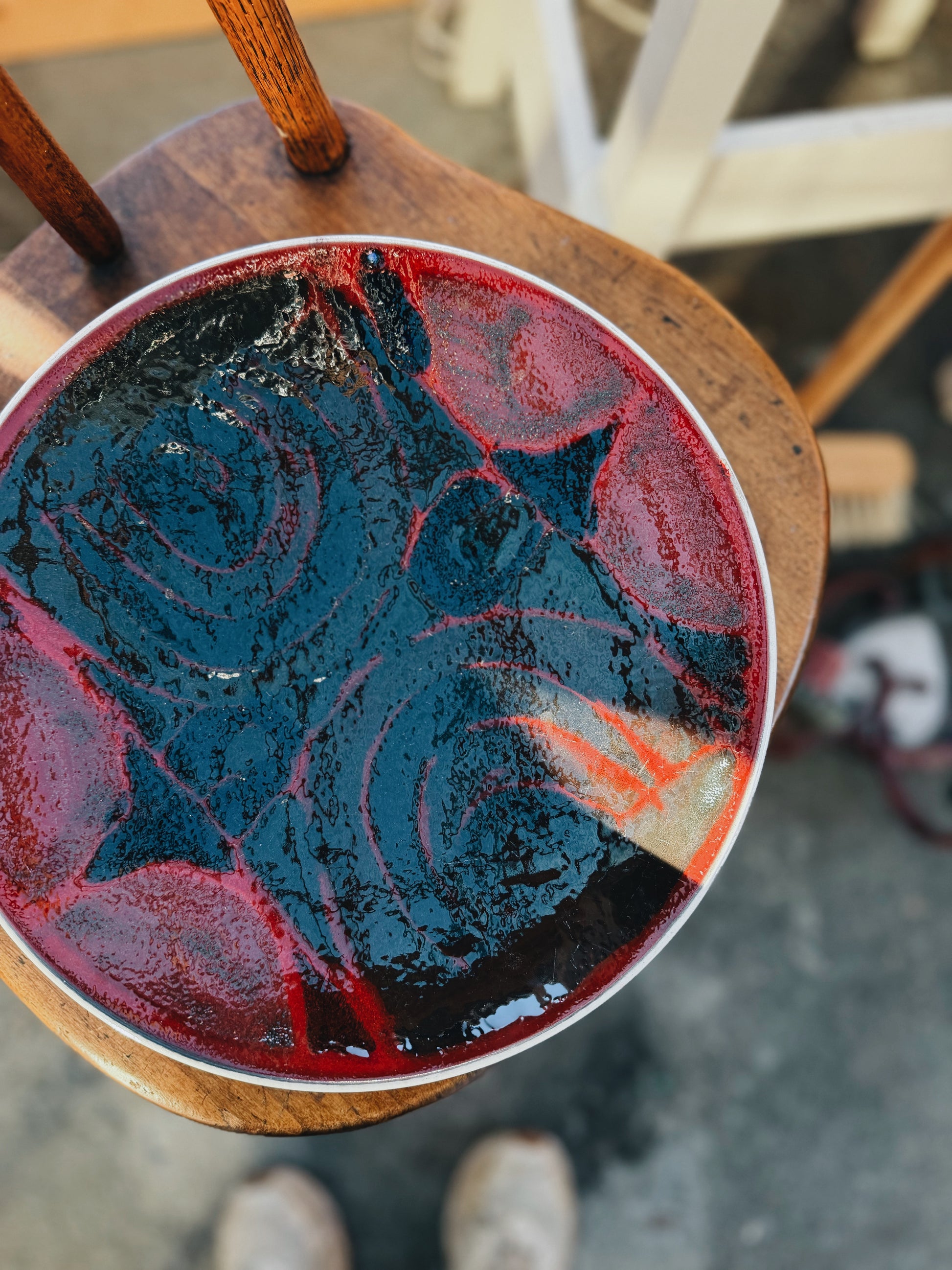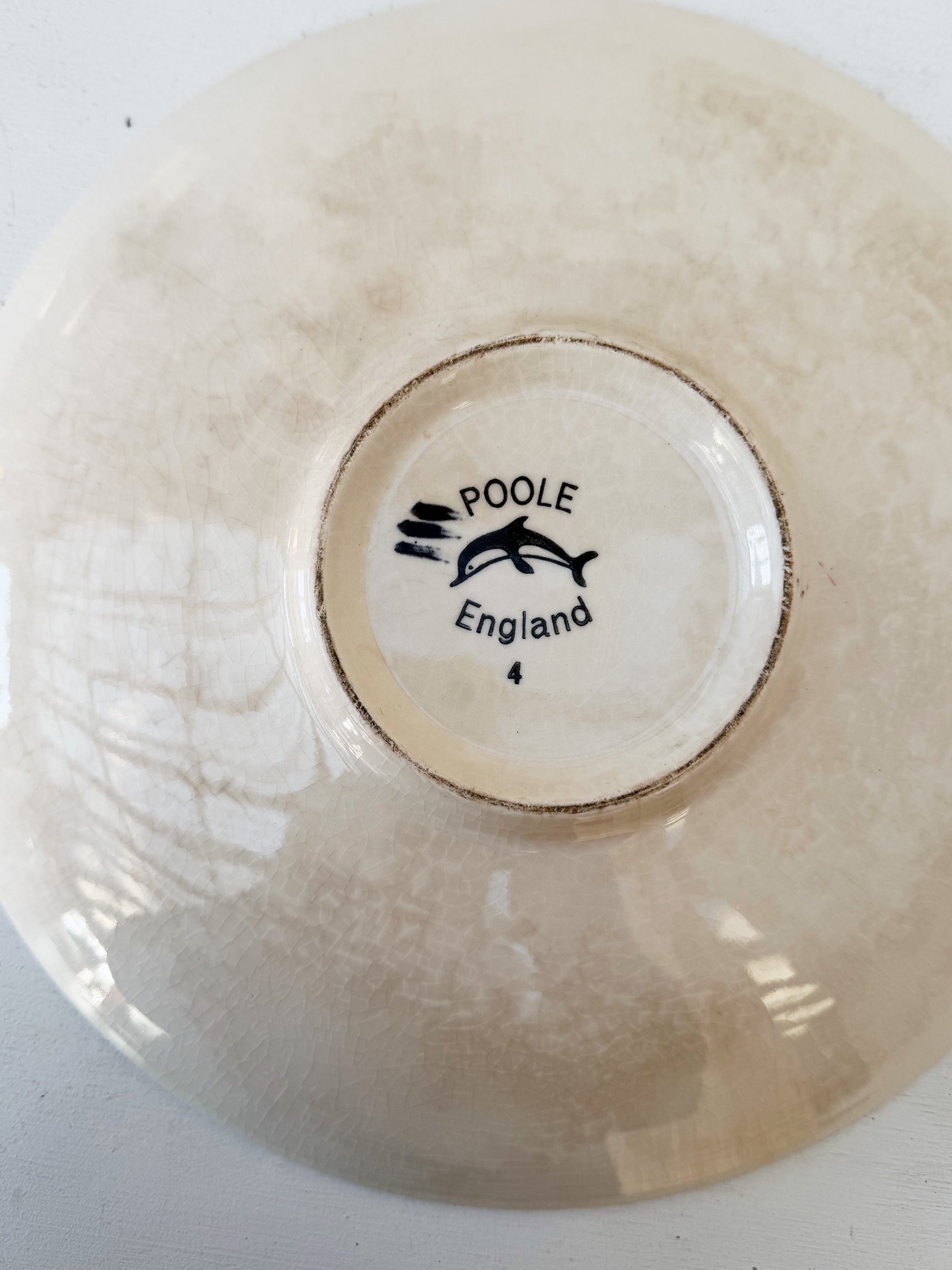Very shallow footed bowl by reknown potters, Poole of England. Mostly likely one of a kind. In Poole fashion, this piece retains the vibrant color and psychedelic design they're known for. Poole is the company that tiled much of the London Underground stations as early as the 1930s.