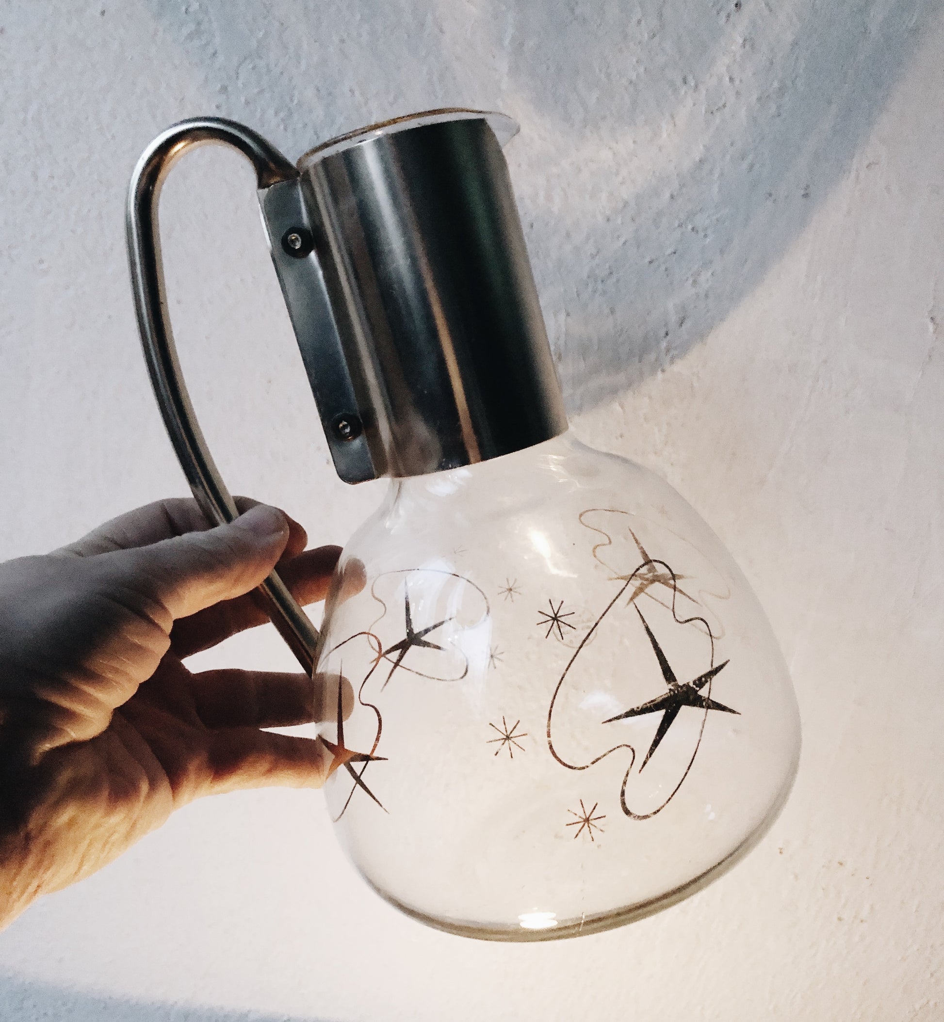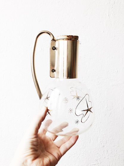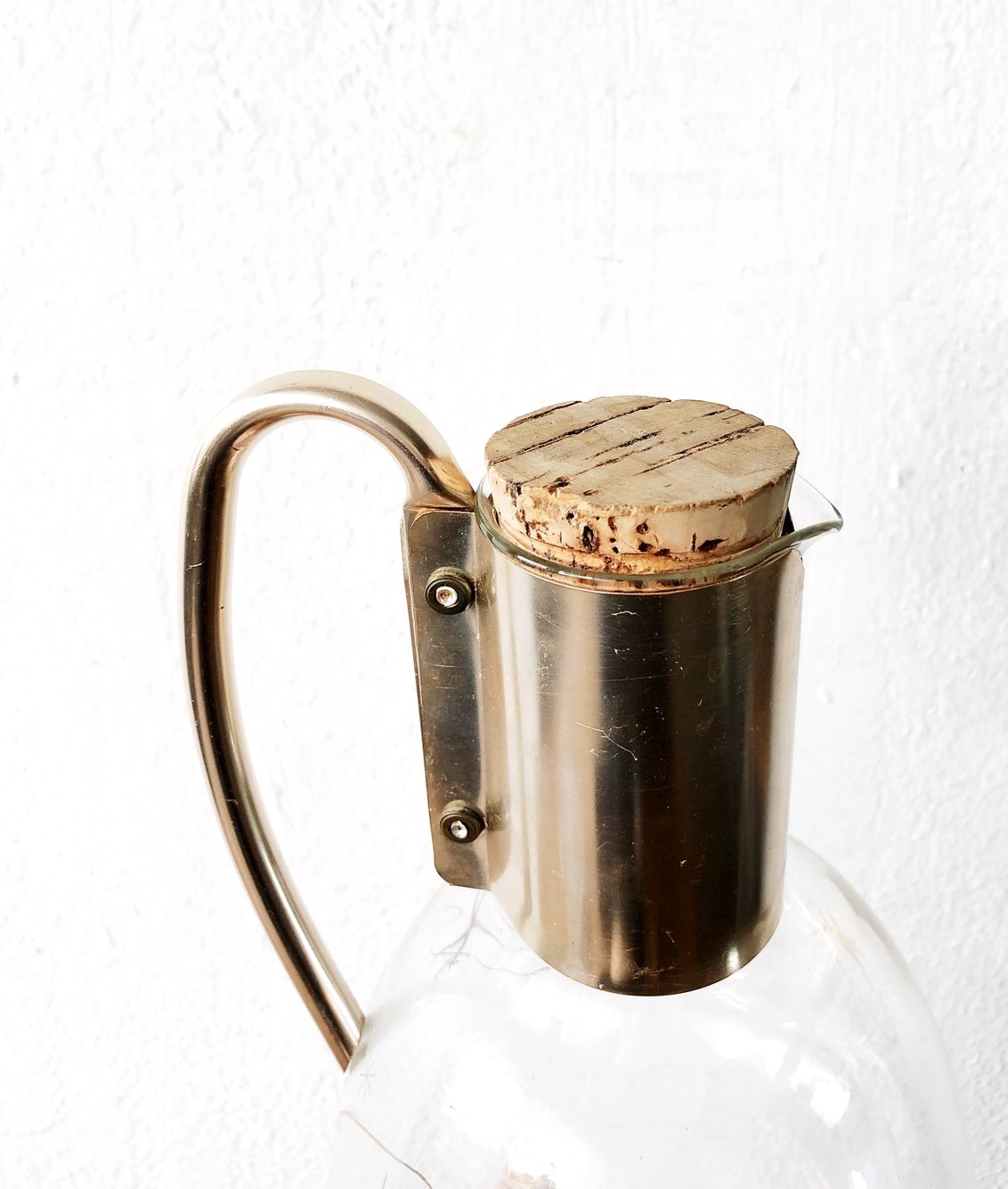 All purpose decanter for both hot and cold liquids. You can decant your pour over coffee right into this or serve mimosas at brunch. Classic atomic age design, brass and cork stopper