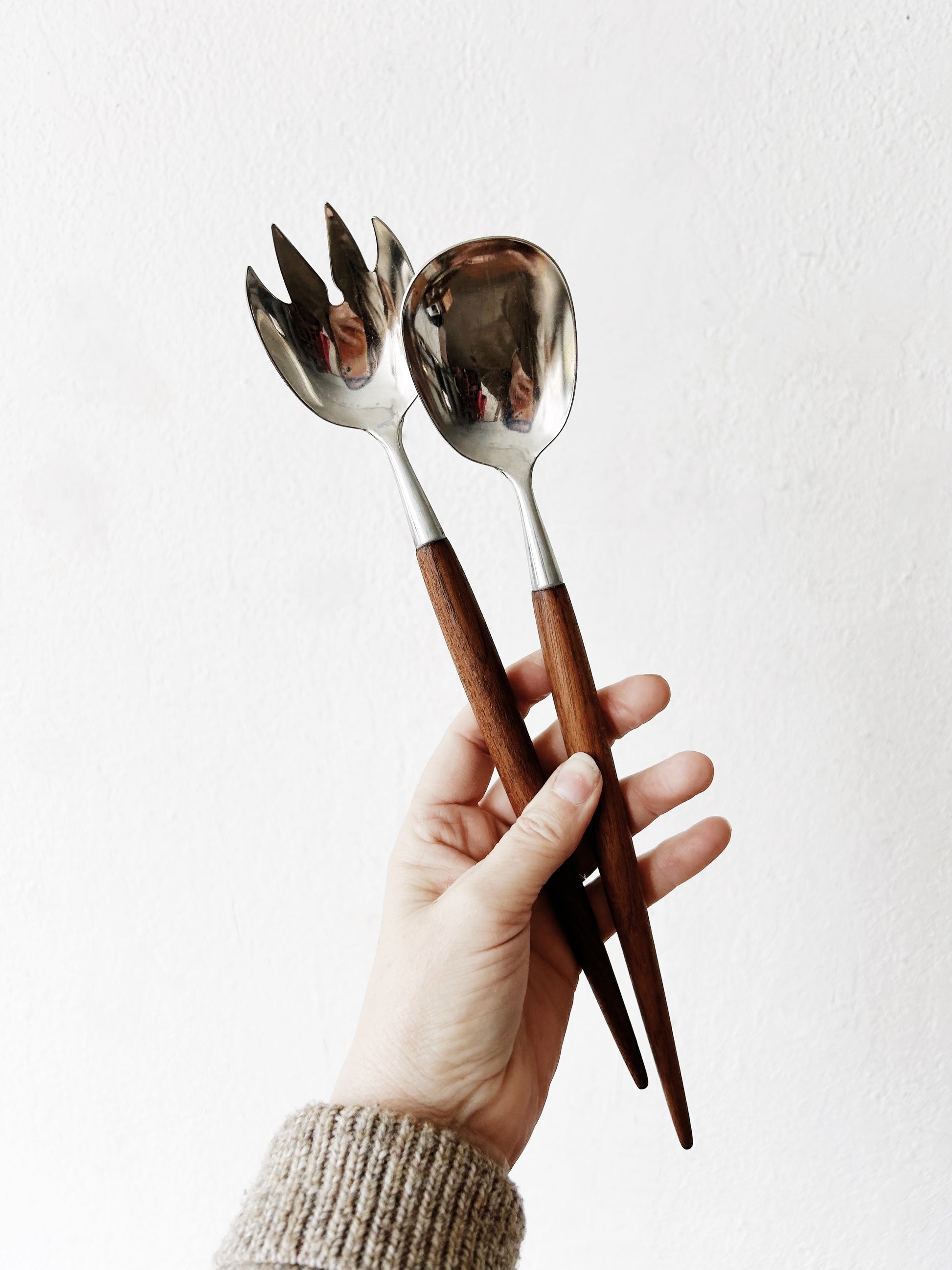 A sleek set of servers from the mid century, made in Norway. Walnut and stainless, excellent condition.