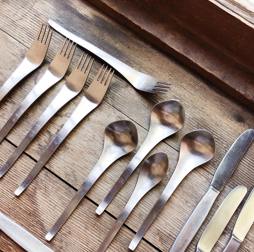 A nice set for four. Mid century stainless steel from japan. Great shapes! There is one extra fork and one spoon is off size but it’s in great condition